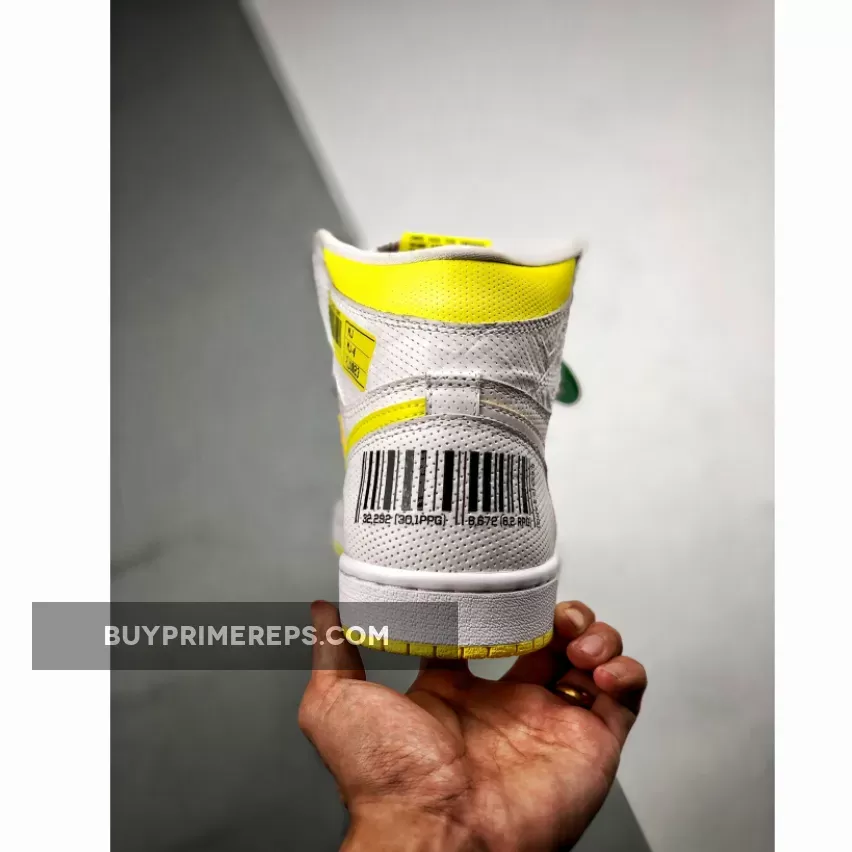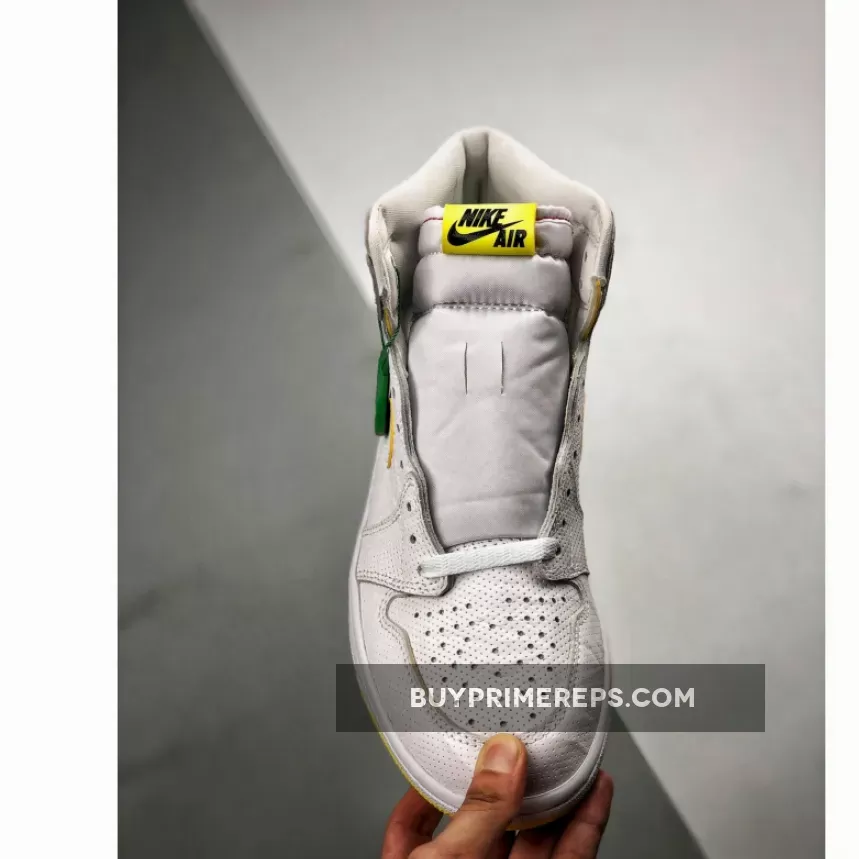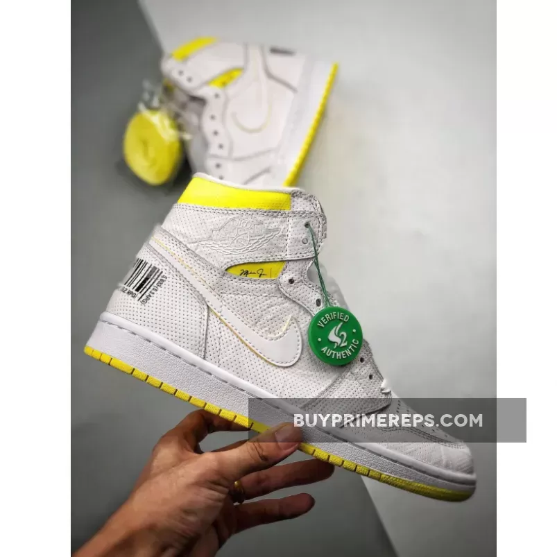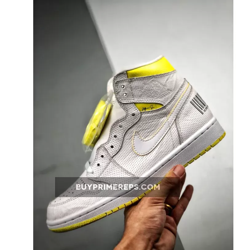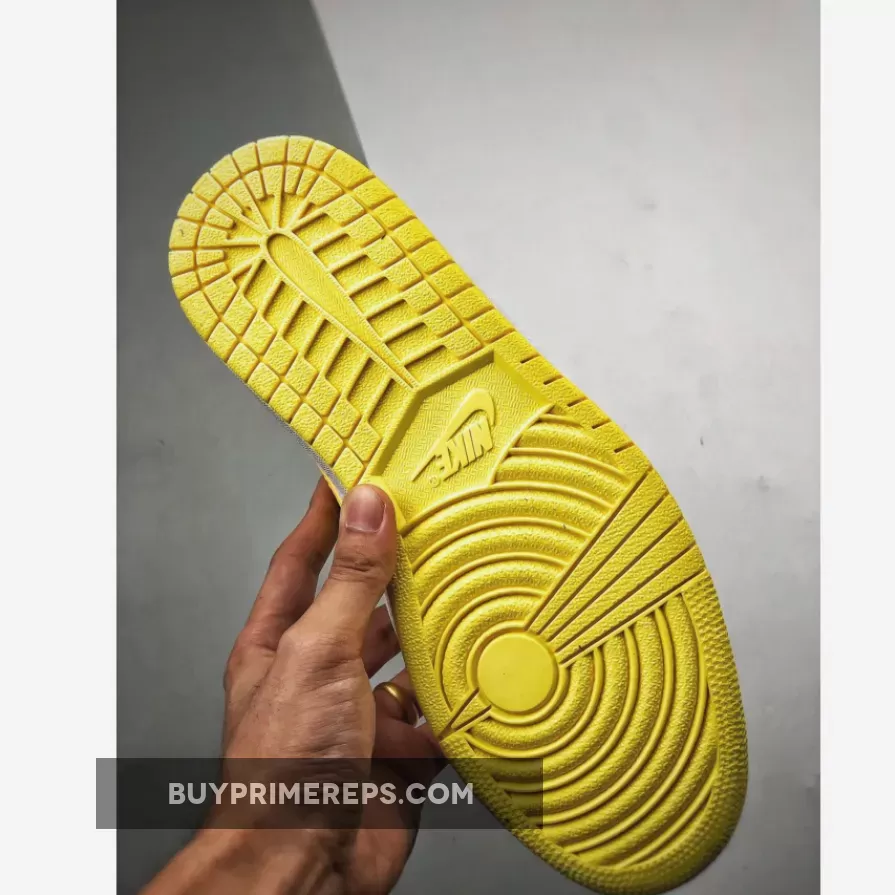 The upper of the Air Jordan 1 “First Class Flight” is constructed with perforated leather, giving it a unique look and feel. The Swoosh branding on the lateral side is done in white, while the medial side features a contrasting yellow Swoosh. This yin-and-yang design adds depth and visual interest to the shoe.