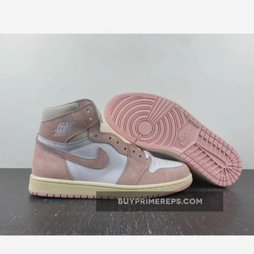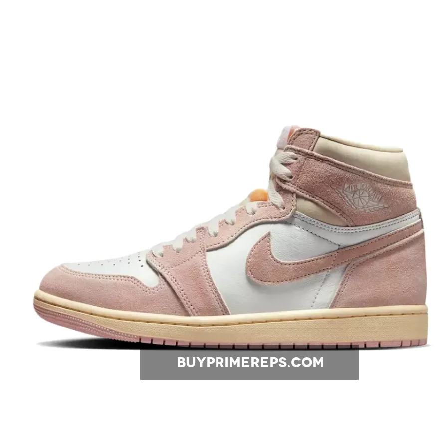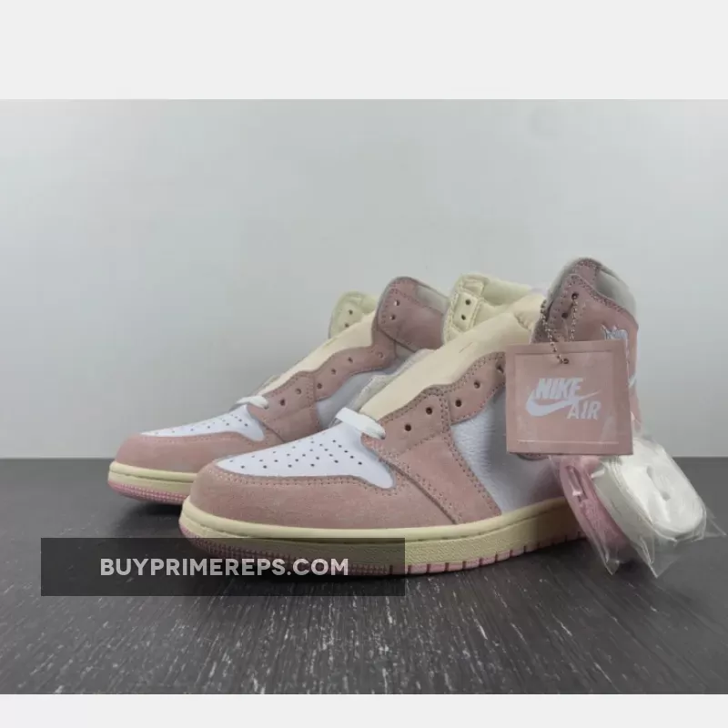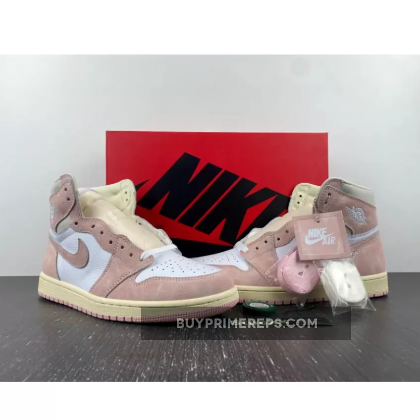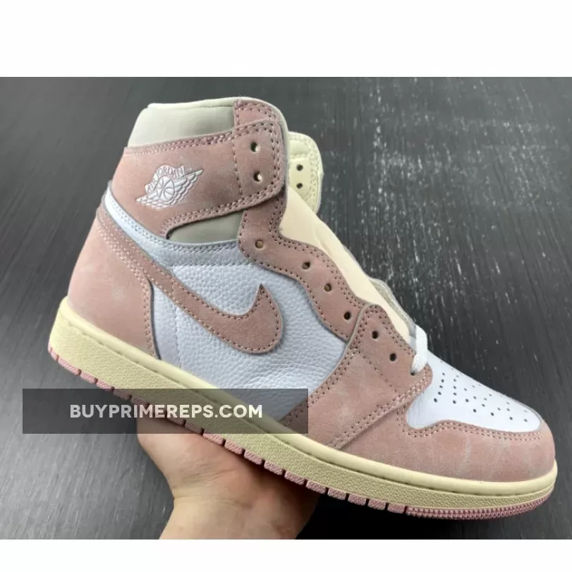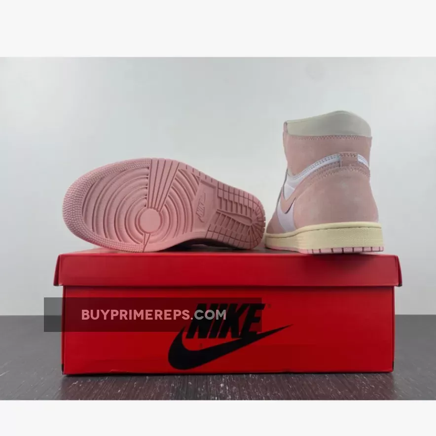 The supple white leather upper provides a beautiful contrast to the bold pink accents, staying true to the traditional features of the Air Jordan 1. The aged midsole, beige ankle collar, and cream laces add to the vintage aesthetic, giving the shoe a timeless charm.