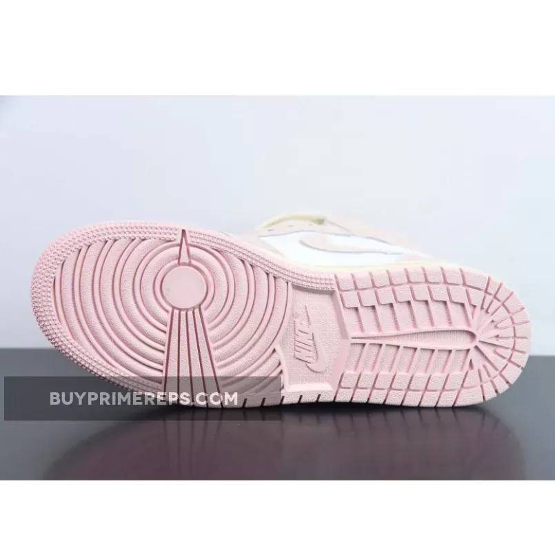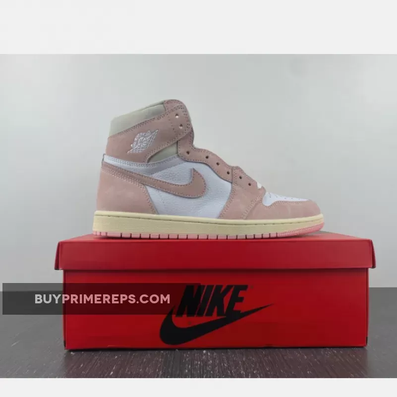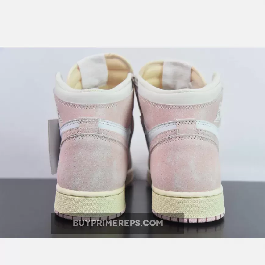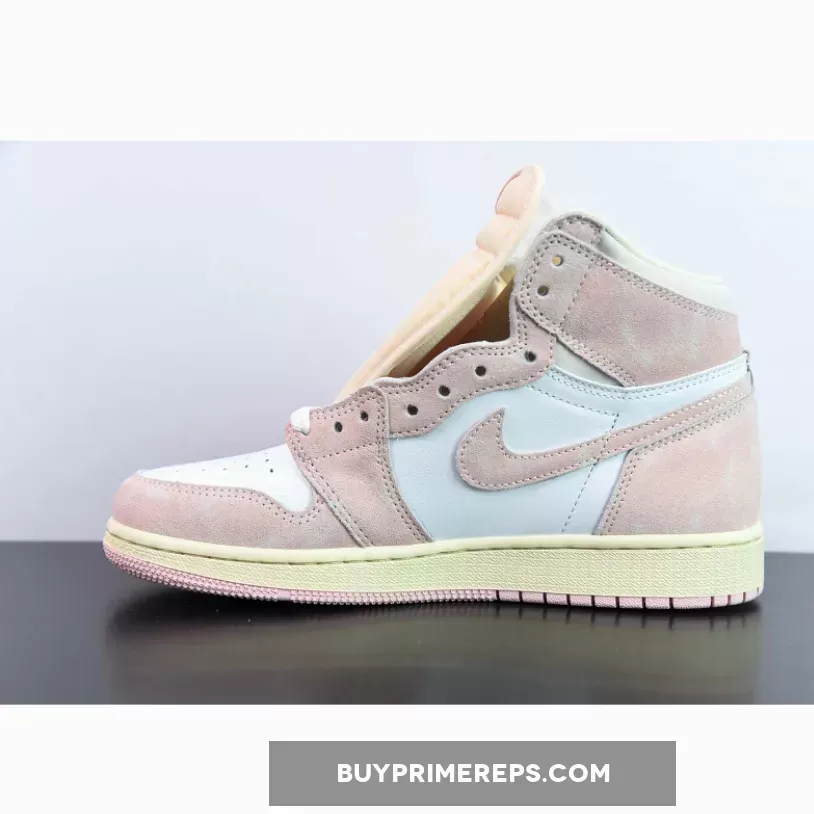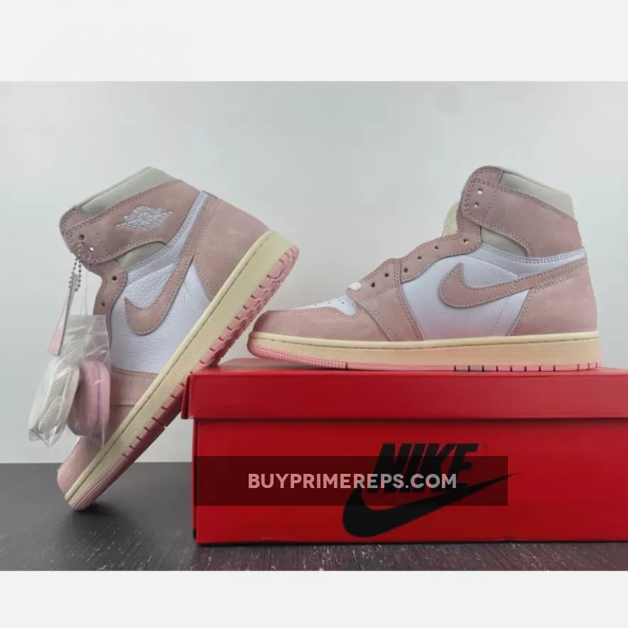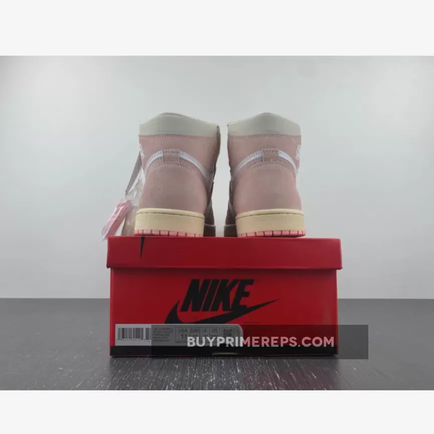The supple white leather upper provides a beautiful contrast to the bold pink accents, staying true to the traditional features of the Air Jordan 1. The aged midsole, beige ankle collar, and cream laces add to the vintage aesthetic, giving the shoe a timeless charm.