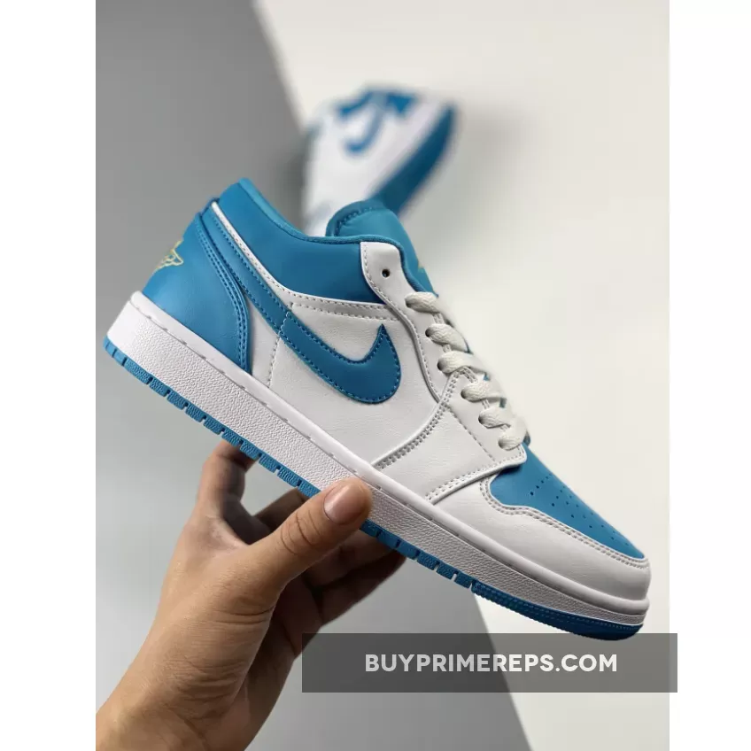 The Air Jordan 1 Low Aquatone takes a classic low-top silhouette and dresses it in an eye-catching, contrasting colorway that places blocks of color in interesting locations across the shoe – creating a clean, crisp, streamlined look. The upper of the shoe is constructed from a combination of white leather and a perforated toebox made from rich Aquatone leather. This unique color adds a pop of vibrancy to the shoe while still maintaining its sleek and timeless appeal.