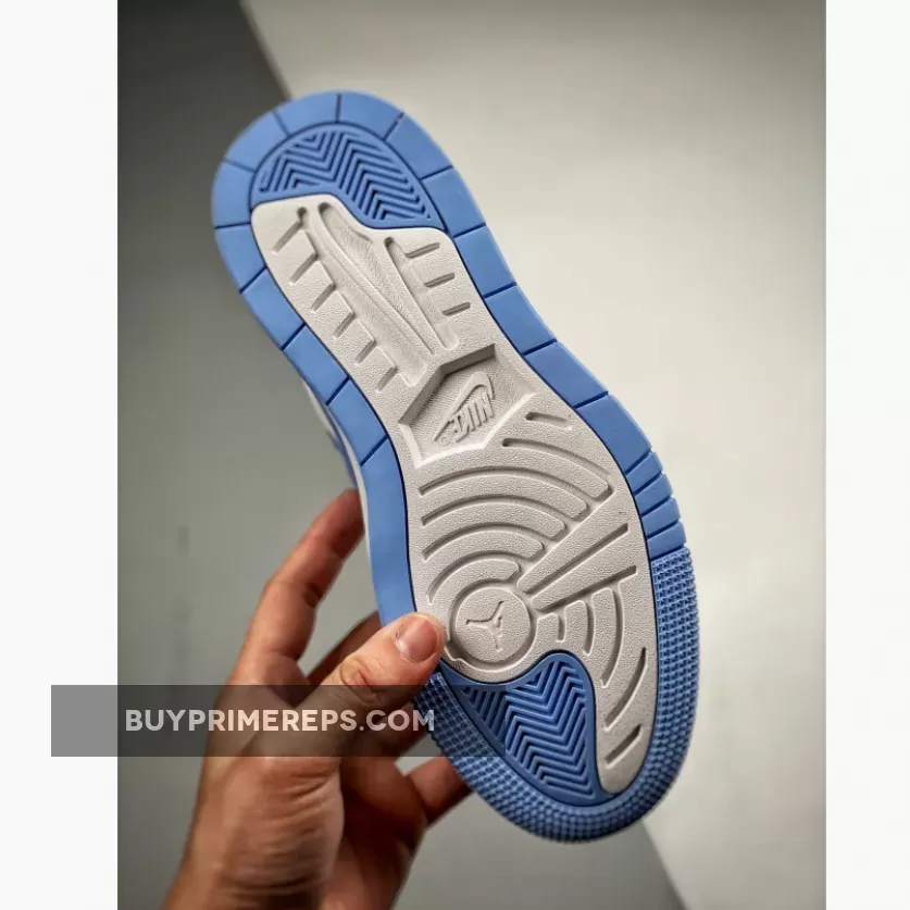 The outsole of the Air Jordan 1 Low LV8D University Blue features a combination of white and University Blue, completing the overall color scheme. The rubber outsole with the outline of the “Wings” logo in the rear ensures excellent traction and durability, making these sneakers suitable for various terrains.