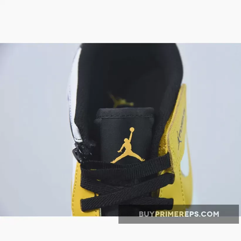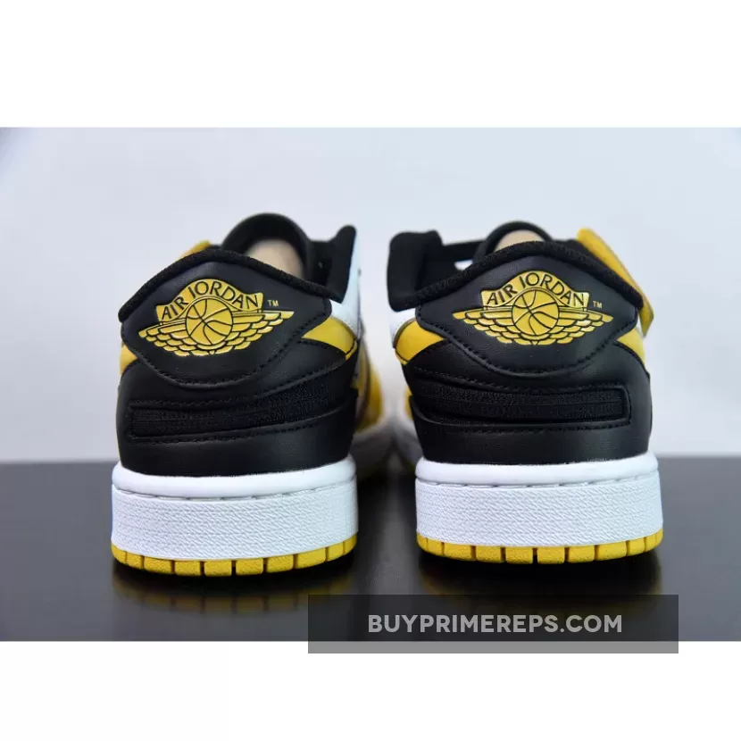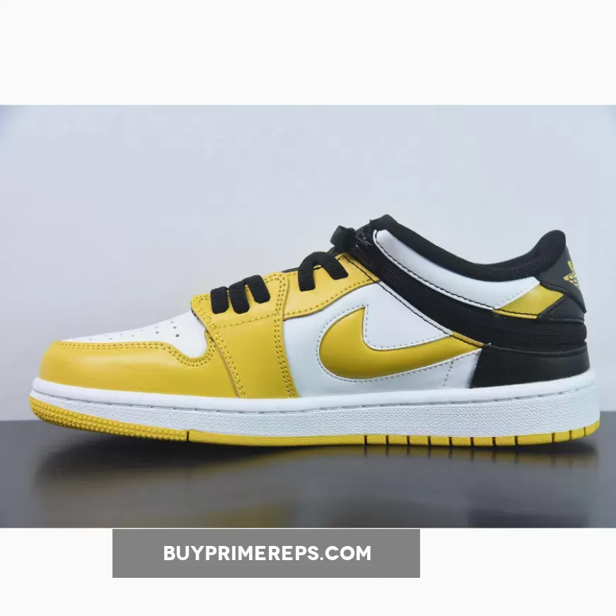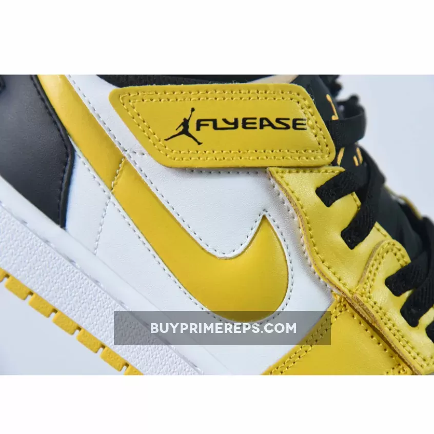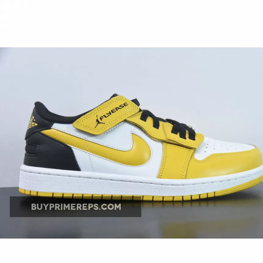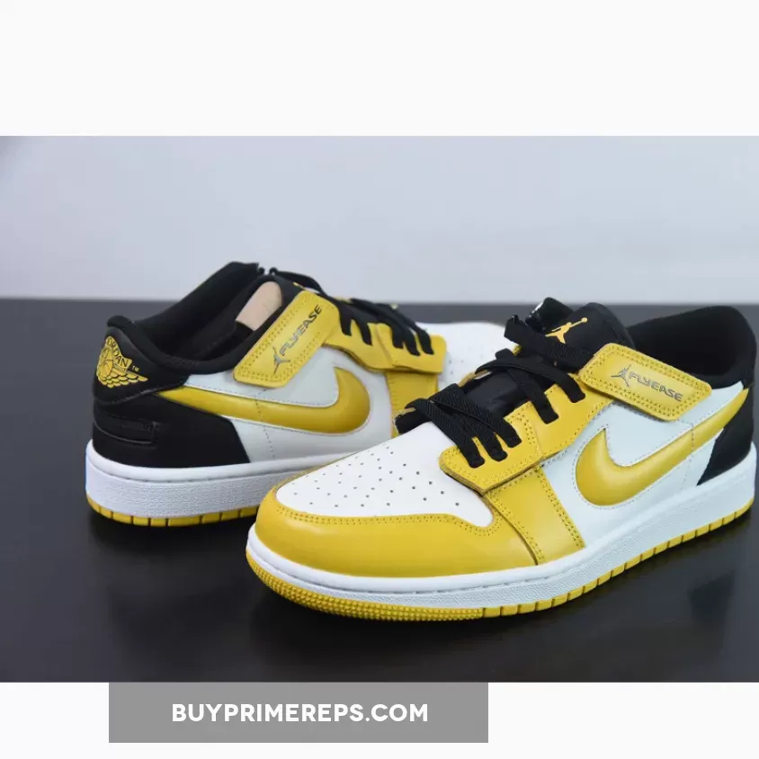 The Air Jordan 1 Low Flyease University Gold features a vibrant yellow and black color palette, balanced by a bright white leather base. The yellow accents on the toe box, mid-foot panels, and heel areas add a pop of color to the design. The shoe also features velcro panels along the tongue’s lateral side, keeping the tongue in place and ensuring a secure fit. Elastic laces further enhance the ease of use, allowing for easy adjustments and quick fastening.