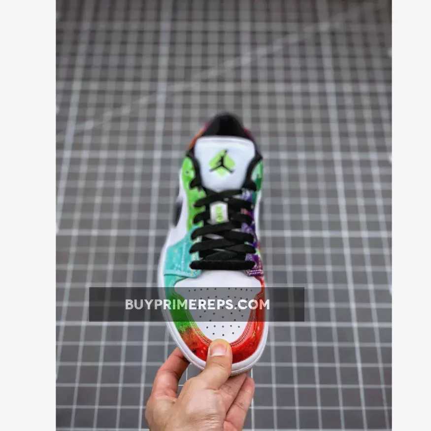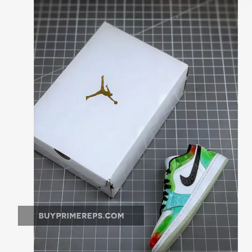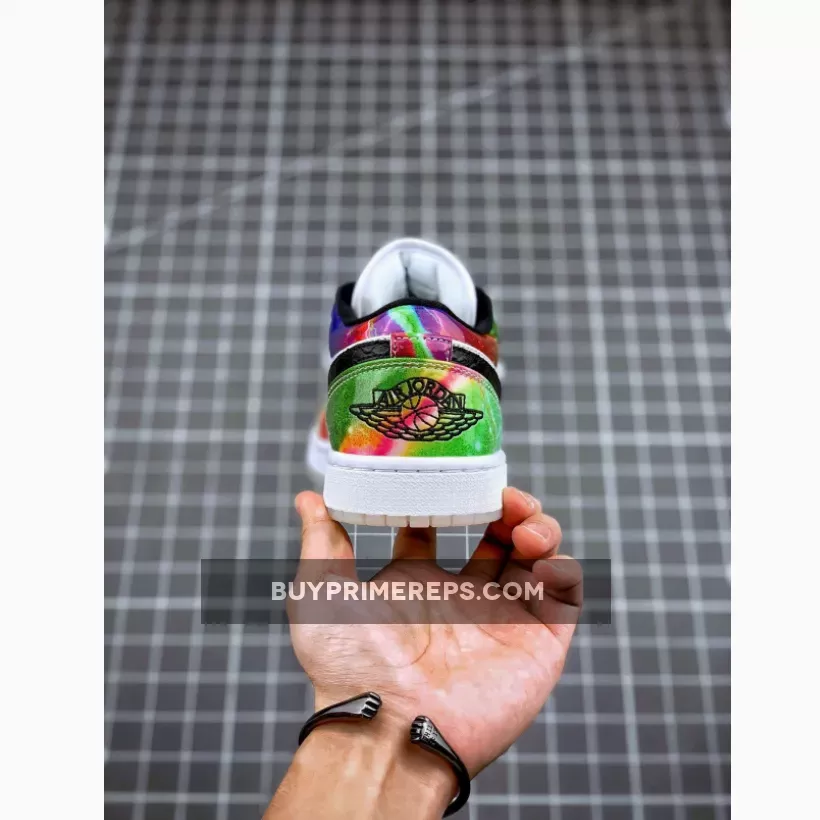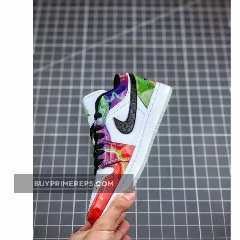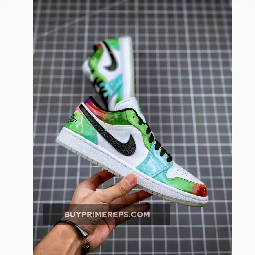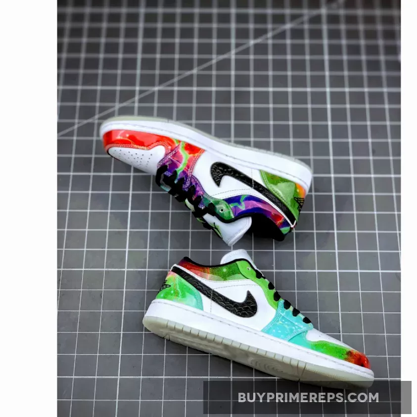 The design of the Jordan 1 Low Galaxy is truly eye-catching. The premium white leather covers the toebox and sidewalls, acting as a blank canvas to enhance the vibrant colored overlays. These overlays appear around the toecap, heels, and down the lace unit, creating a stunning rainbow effect with a blend of red, neon green, and aqua blue. The black Swooshes on both sidewalls stretch back to the heel panel, which features the iconic AJ Wings motif. The signature Jumpman logo graces the tongue, adding a touch of authenticity to the design.