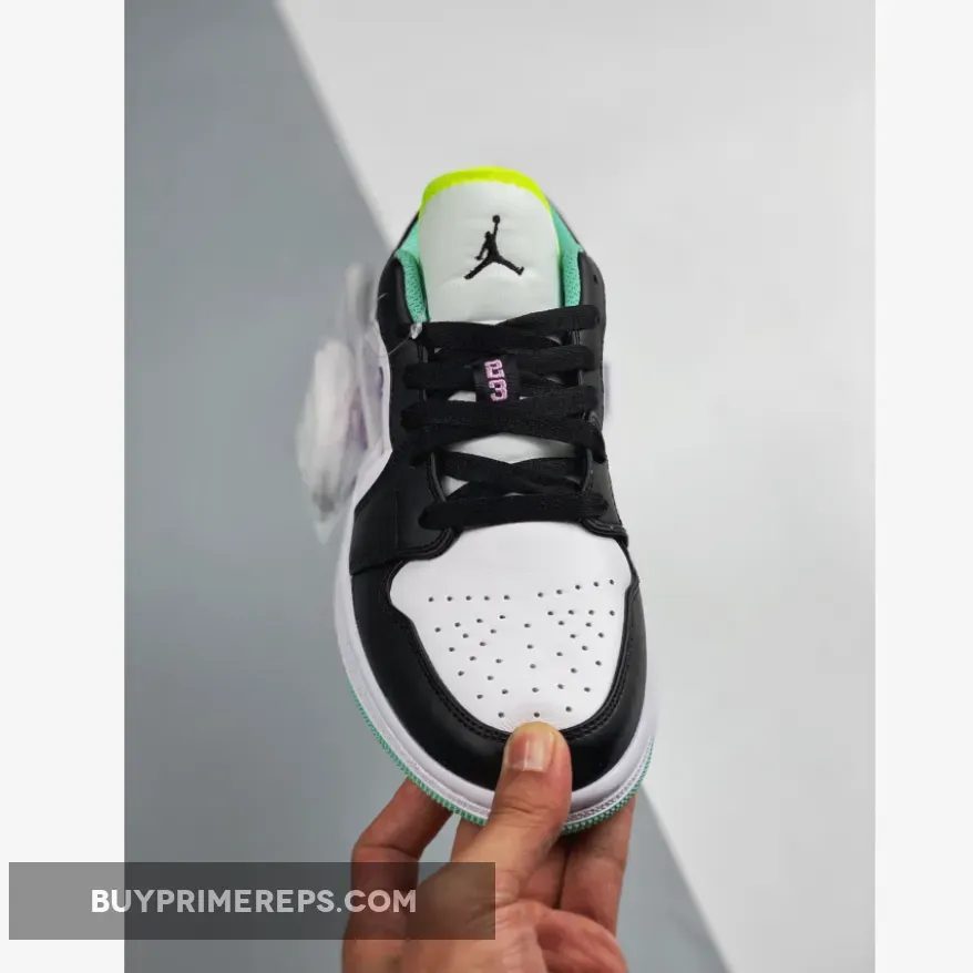 Adding a pop of color to the Air Jordan 1 Low GS Pink Green Glow is the Green Glow accent. This vibrant shade of green is seen on the liner, Wings logo, and rubber outsole, adding a touch of brightness to the overall design. The combination of the white, black, and green colors creates a visually striking contrast that is sure to turn heads wherever you go.