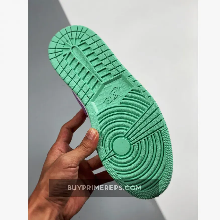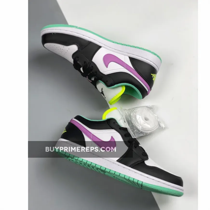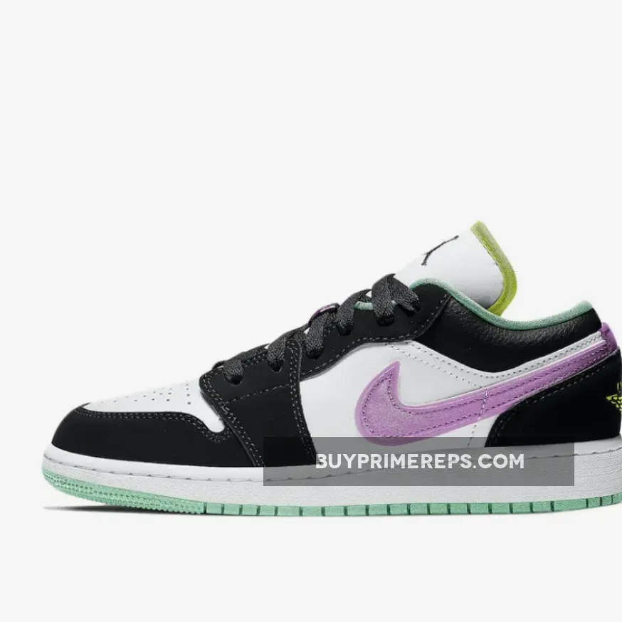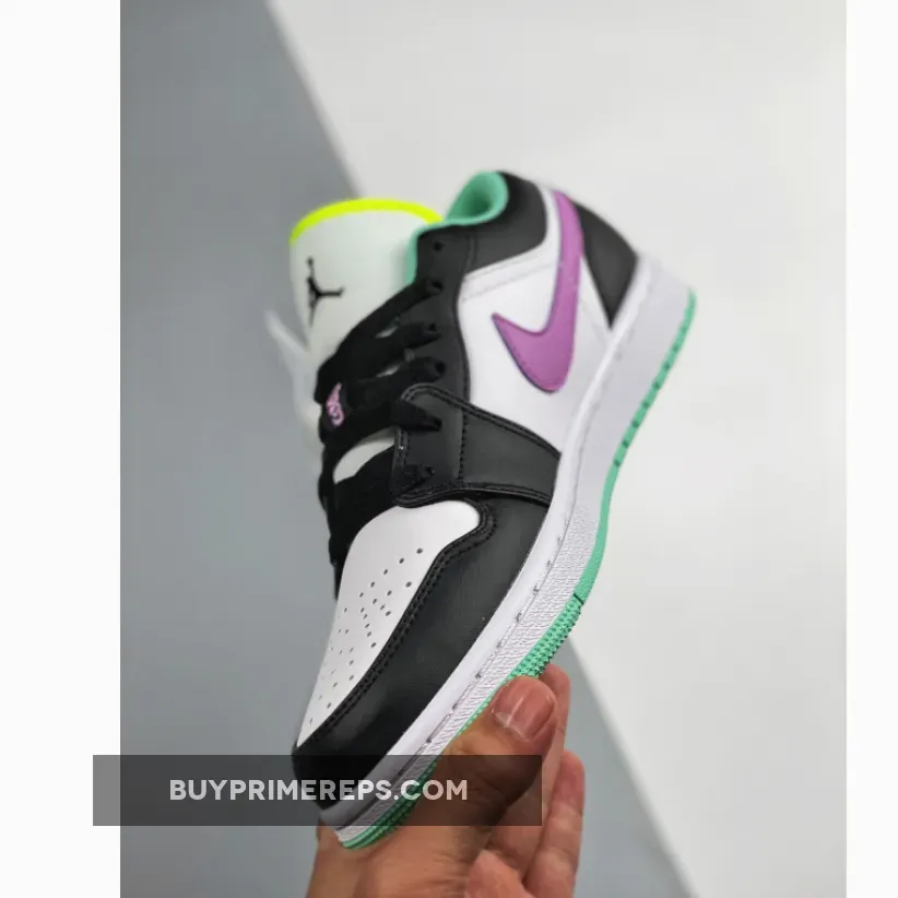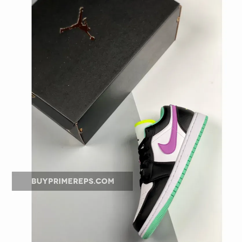 The upper of the Air Jordan 1 Low GS Pink Green Glow is constructed with premium white leather, giving the shoe a clean and timeless look. Black nubuck and leather overlays add depth and texture to the design, while also providing added durability. The standout feature of this sneaker is the double-layered Swoosh in purple, which is placed on the side panels. This unique design element gives the Swoosh a larger-than-life appearance, making it a focal point of the shoe.