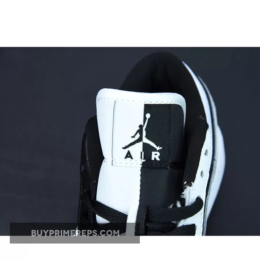 The upper of the shoe is constructed from premium pebbled leather, ensuring both durability and style. The standout feature of the design is the split color scheme. On the lateral side, a clean white base is complemented by black overlays, while on the medial side, the color palette is reversed with white overlays on a black base. This unique split design extends to the nylon tongues, which feature black-and-white Jumpman logos.