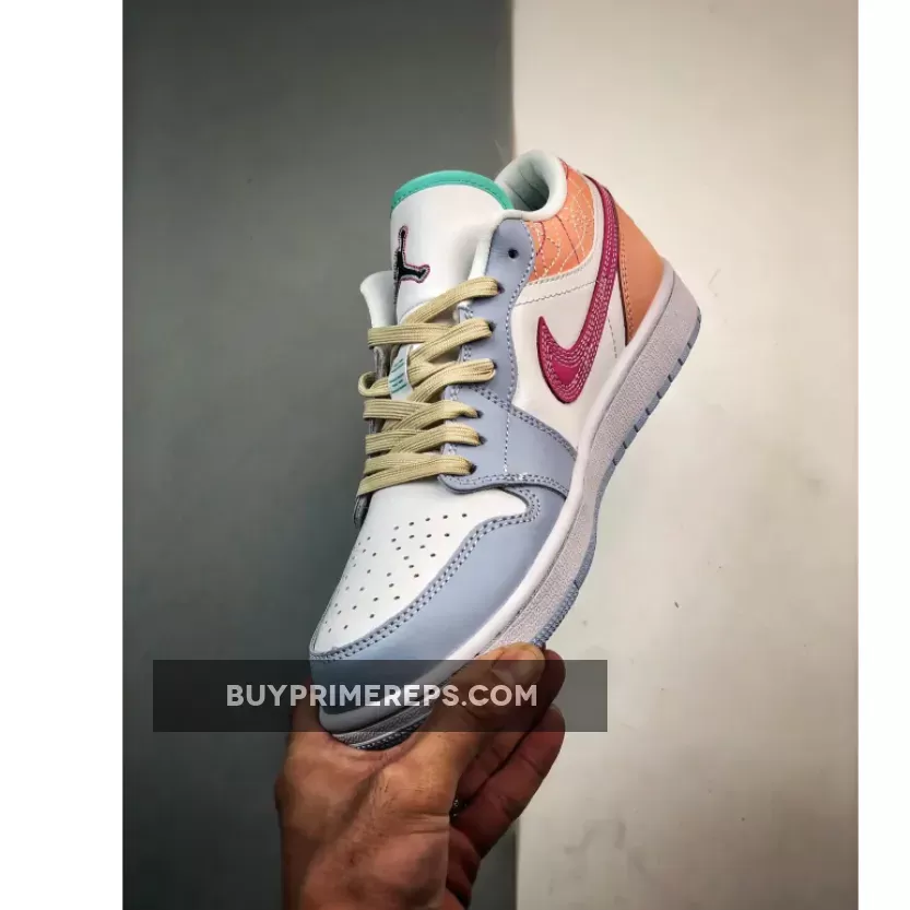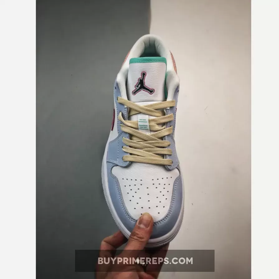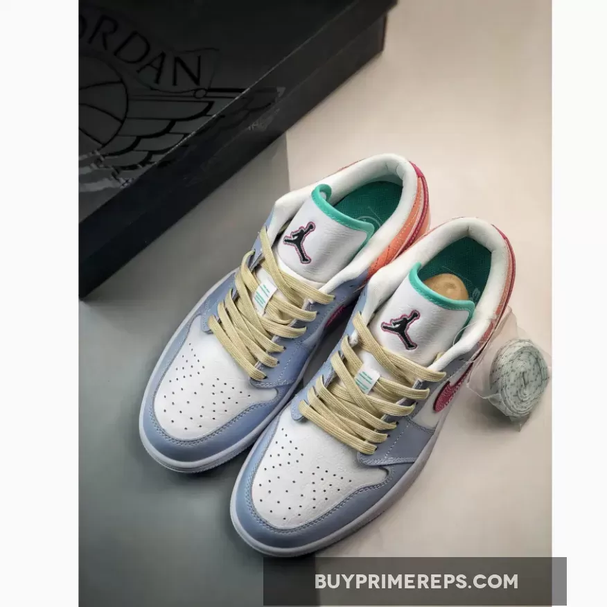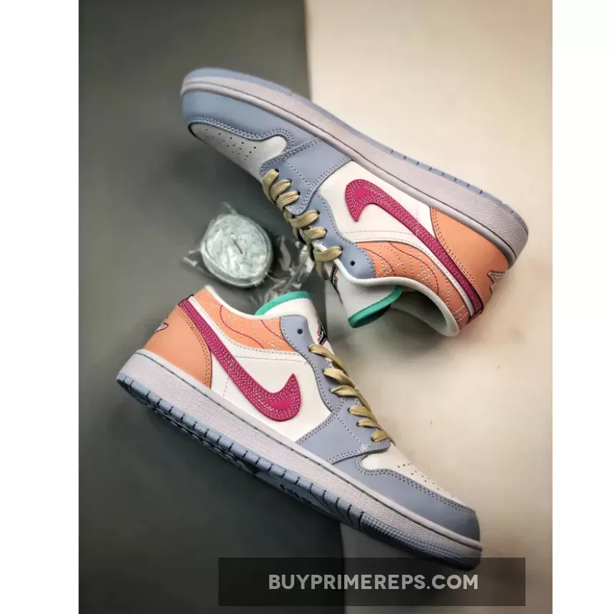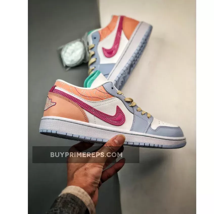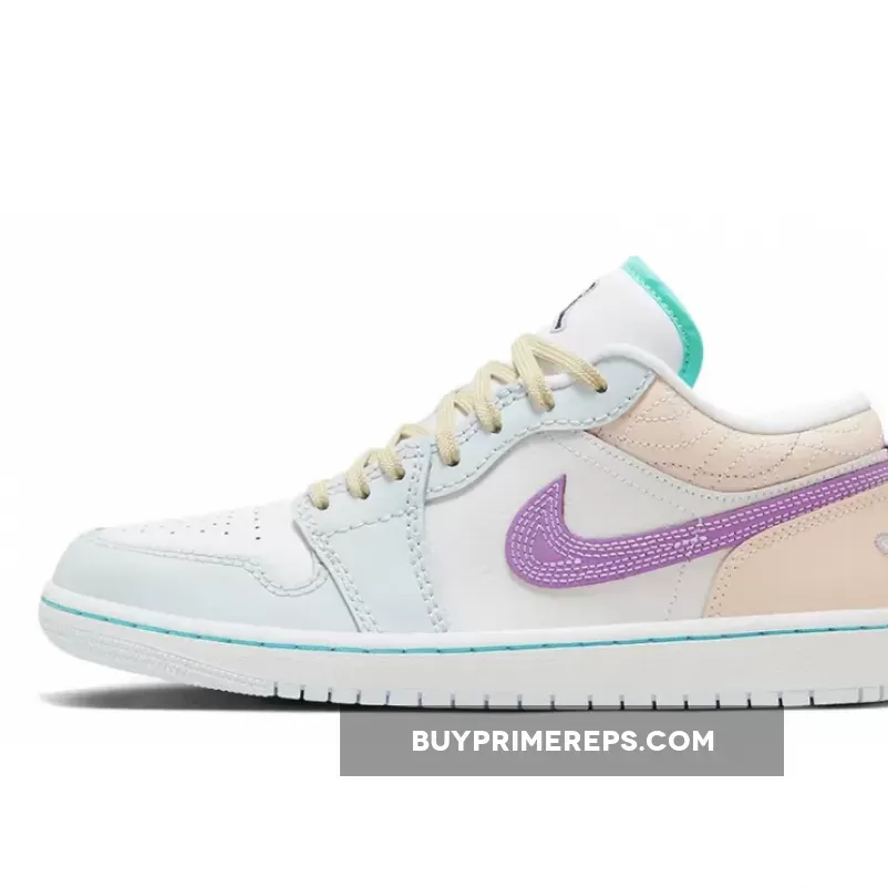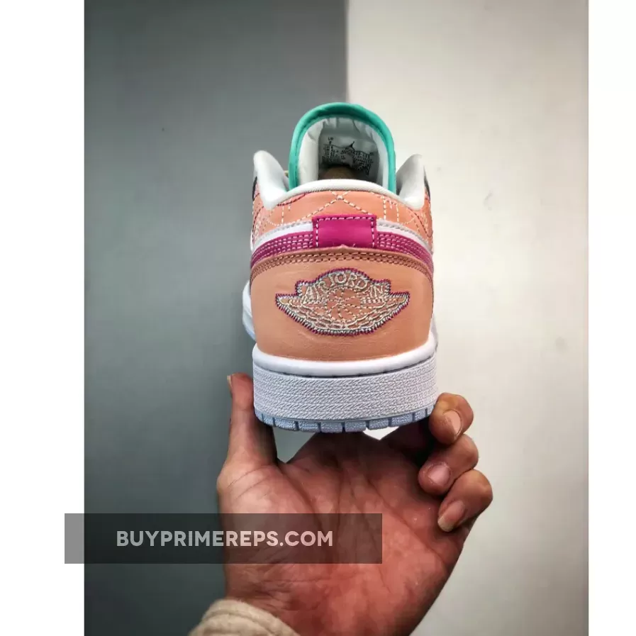 The upper of the Air Jordan 1 Low Sashiko Multi-Color is made of smooth and tumble leather, giving it a sleek and luxurious look. The use of pastel hues, including Rush Fuchsia, Blue Tint, Guava Ice, and Aurora Green, adds a touch of elegance to the shoe. The Sashiko motif is intricately stitched onto the ankle and Swoosh, showcasing the attention to detail and craftsmanship that Jordan Brand is known for.