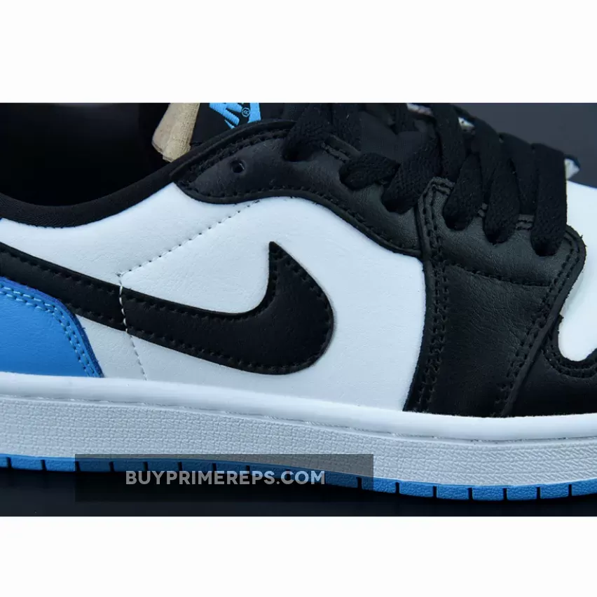 Dressed in pristine white leather, the Air Jordan 1 Low “UNC” features contrasting black overlays and Swoosh logos for a sleek and stylish look. The highlight is undoubtedly the vibrant University Blue hue that wraps the heel, tongue branding, and outsole, nodding to the prestigious university. This color combination creates a harmonious blend of tradition and modern style.