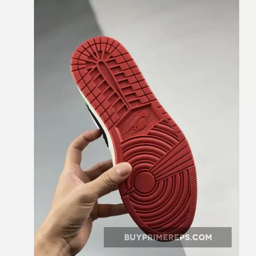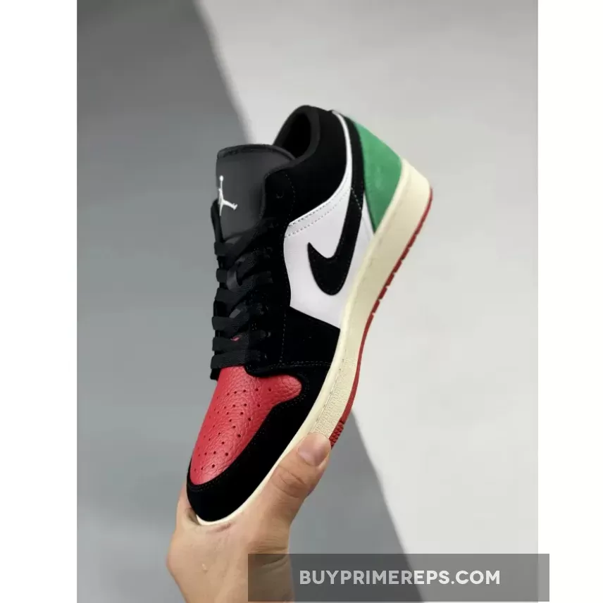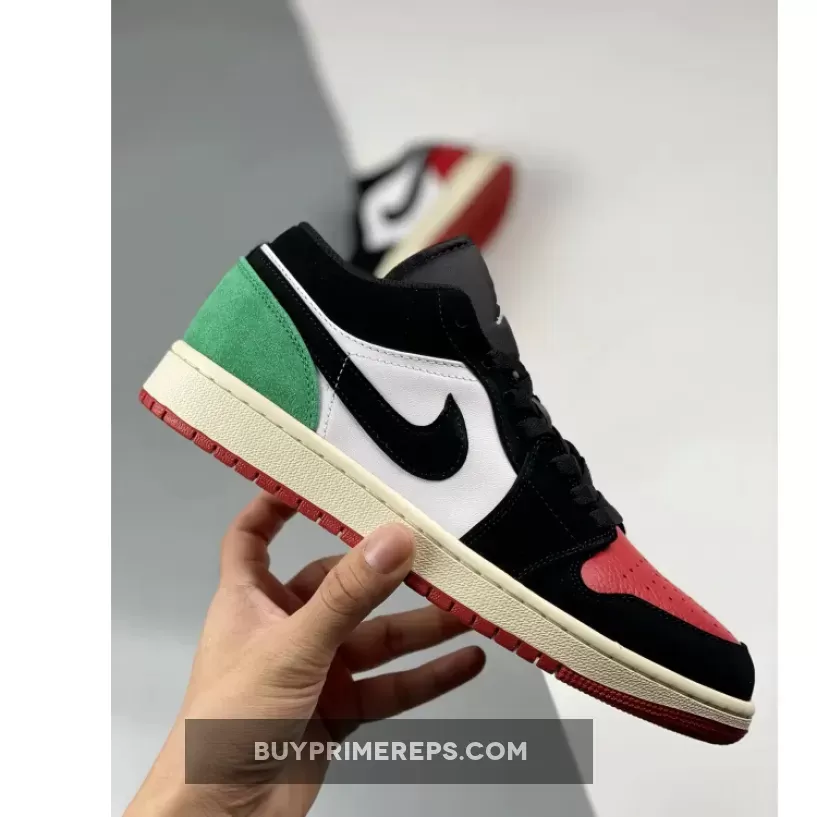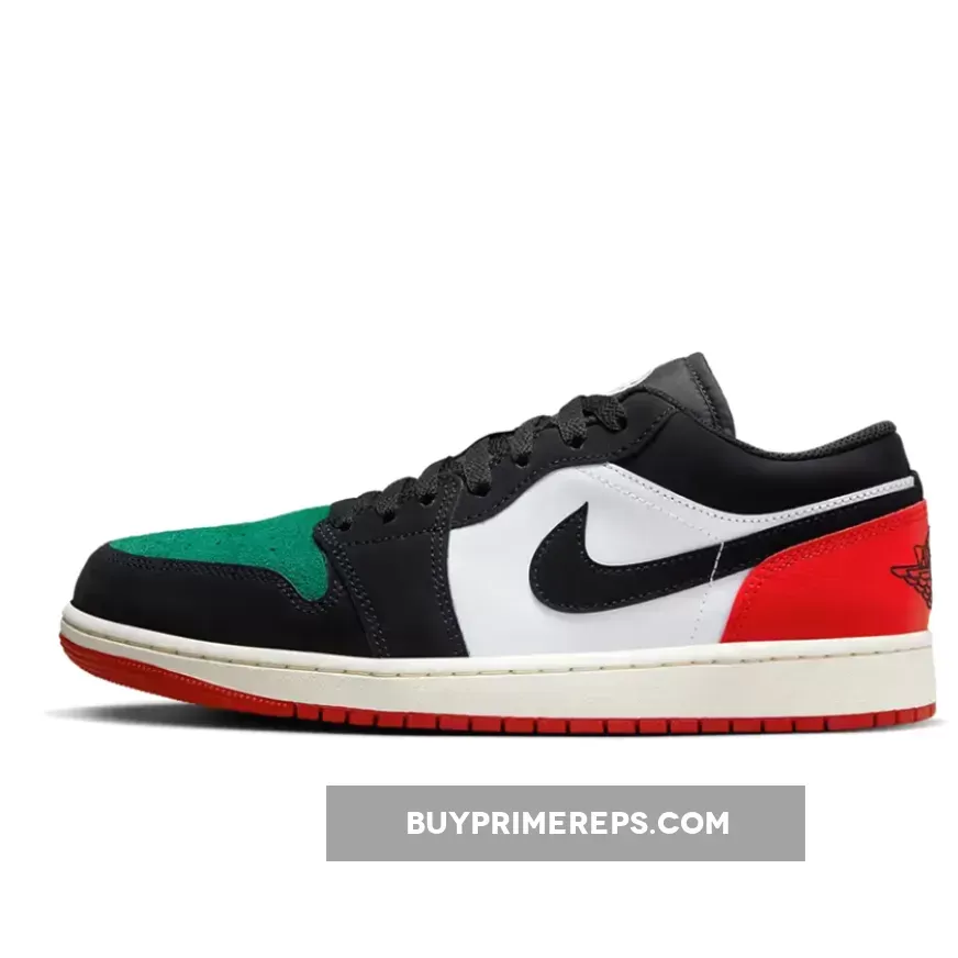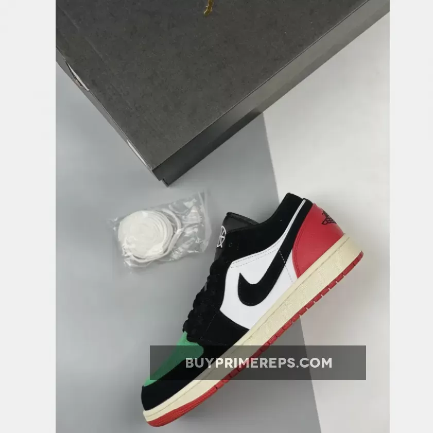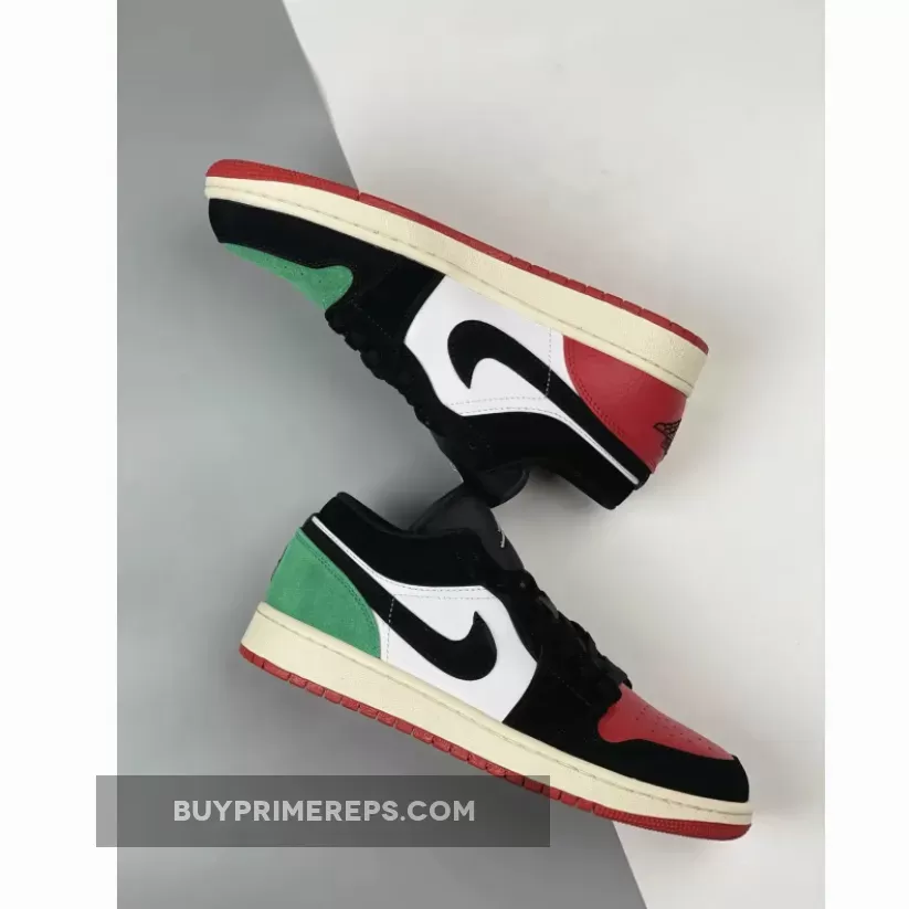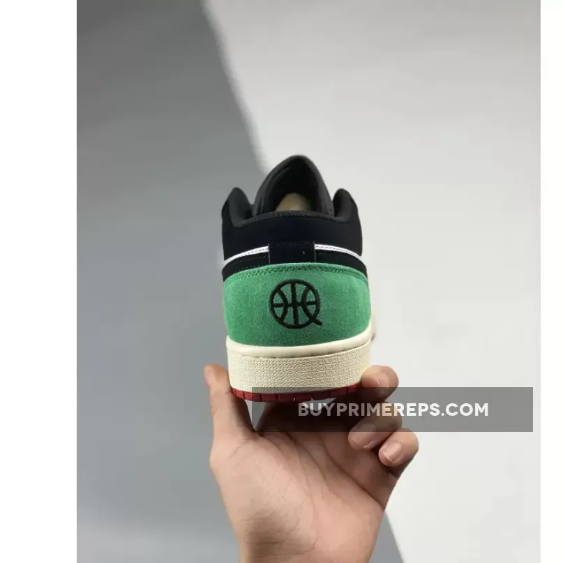 The design of the Air Jordan 1 Low SE Quai 54 is truly unique. The left and right shoes are mismatched, with different materials and colors used on each pair. One shoe features a red leather toe box and a green suede heel, while the other shoe switches the colors and materials. This mismatched design adds an element of creativity and individuality to the sneaker.