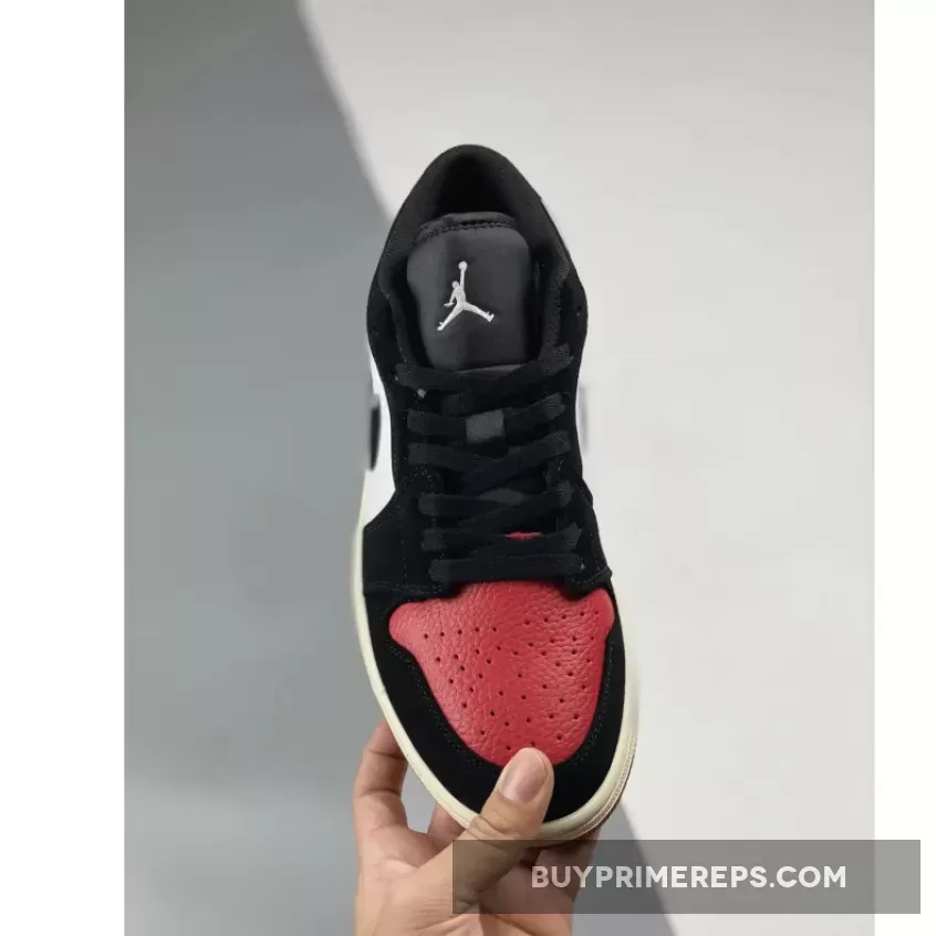 The upper of the Air Jordan 1 Low SE Quai 54 is constructed with a mix of suede, leather, and textile materials. Black suede strips wrap around the mudguard, eyestays, collar, and tongue, adding a luxurious touch to the design. The creamy midsole and crimson outsole provide a striking contrast against the black and colorful upper.