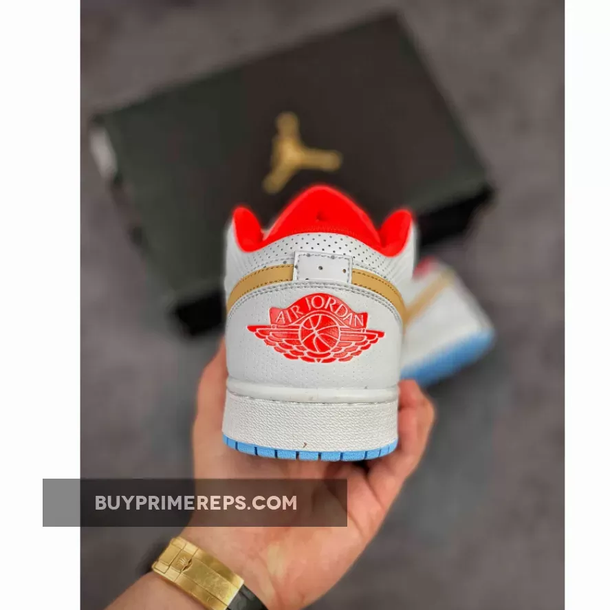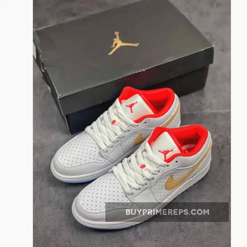 The Air Jordan 1 Low SE White Sesame features a low-cut construction, crafted with perforated leather panels from heel to toe. This design not only adds to the overall aesthetic appeal but also enhances breathability and provides a lightweight experience. The attention to detail is evident in the color arrangement as well. The Swoosh logos on the lateral and medial sides are coated in a beige hue, while the trims of the tongue, collar lining, and wings motif on the heel sport a vibrant Crimson tint. The durable rubber outsole underfoot completes the look with a light blue filling.