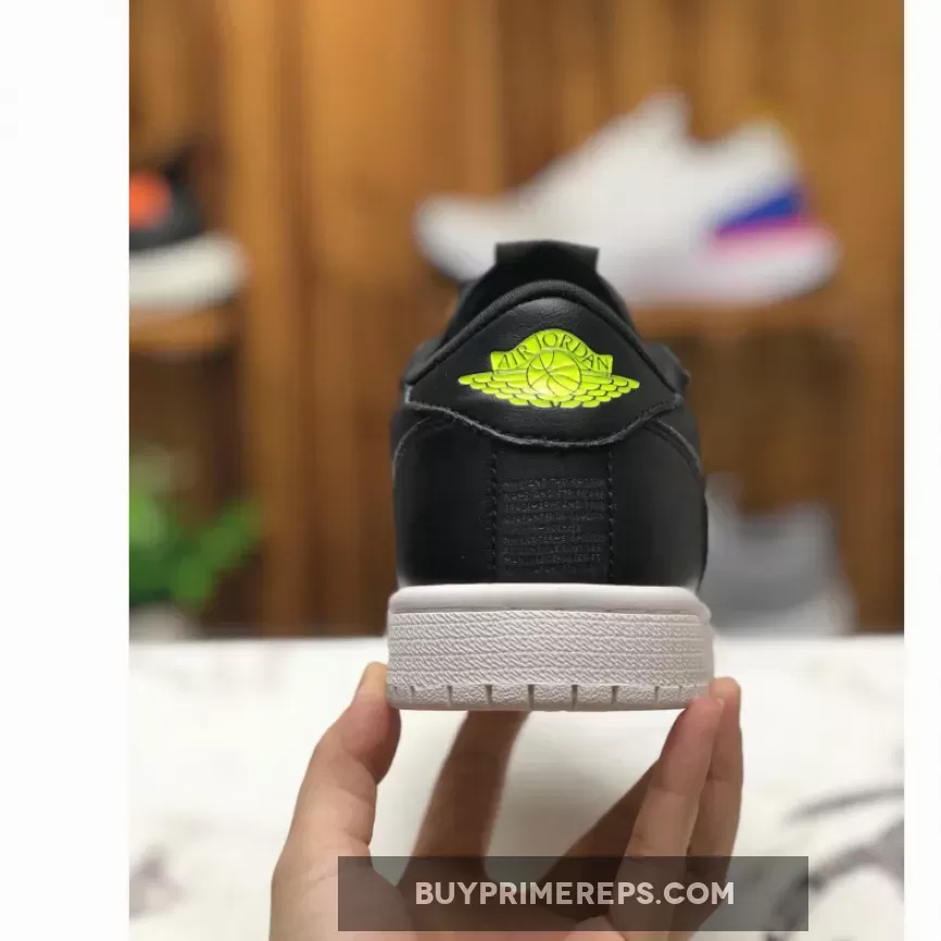 The Air Jordan 1 Retro Low Slip Black Phantom Women’s features signature Jumpman logos in a vibrant volt hue on the tongue, adding a pop of color to the design. The iconic wings emblem is also stamped at the heel, adding a touch of authenticity to the shoe.
