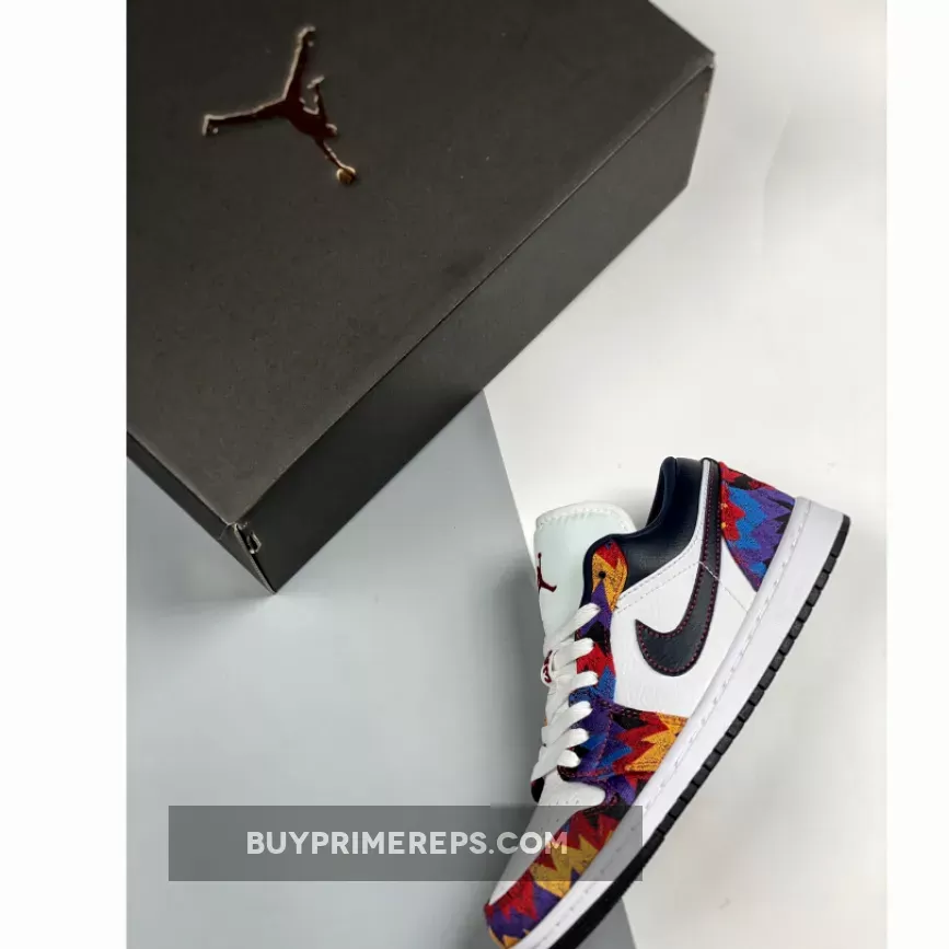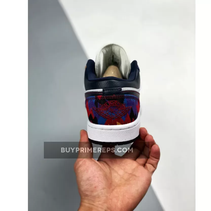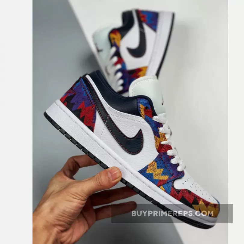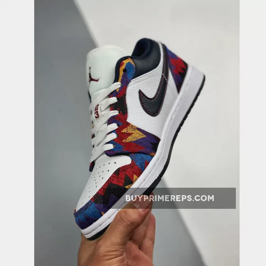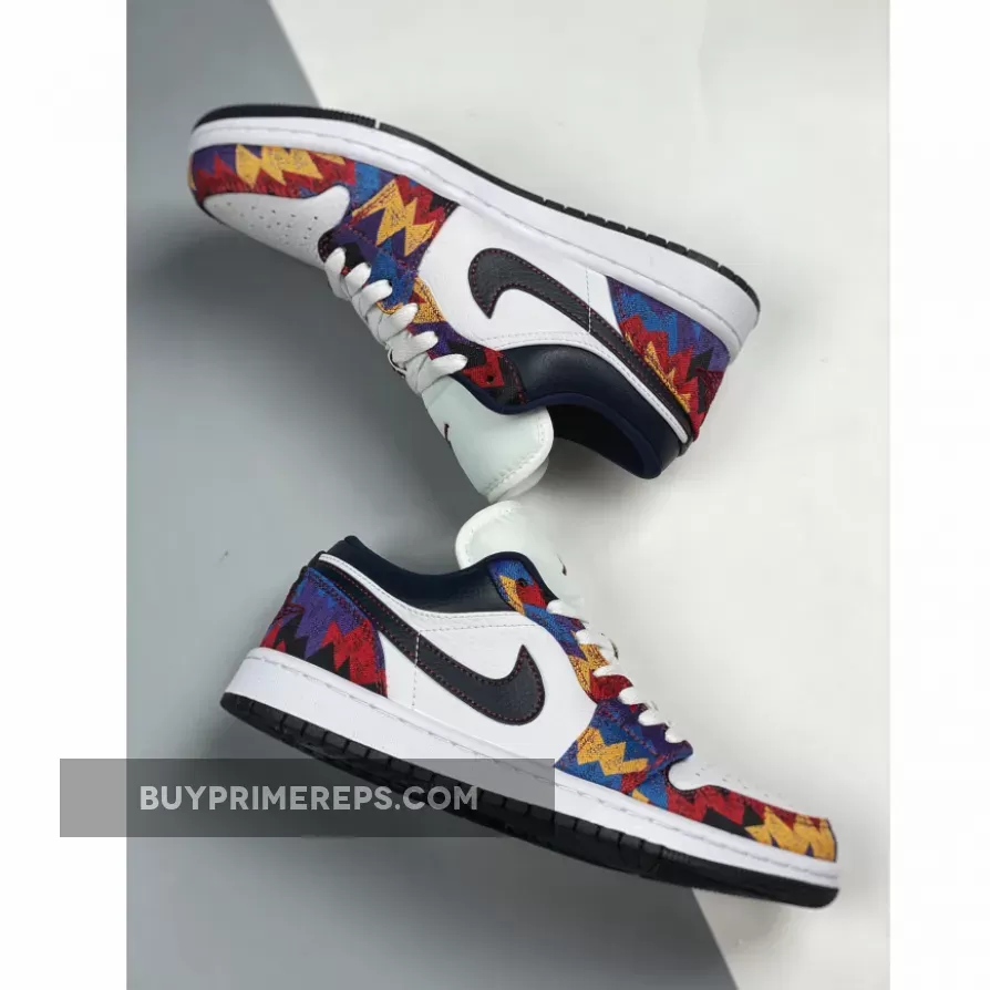 The upper of the Air Jordan 1 Low Nothing But Net is crafted from smooth leather, providing a premium look and feel. The fabric overlays feature a vibrant abstract print in blue, red, and yellow, reminiscent of the iconic sweatshirt. Contrasting the bright colors is a black Nike Swoosh and collar, adding a touch of sophistication to the design. The outsole is also black, providing a cohesive and sleek look.