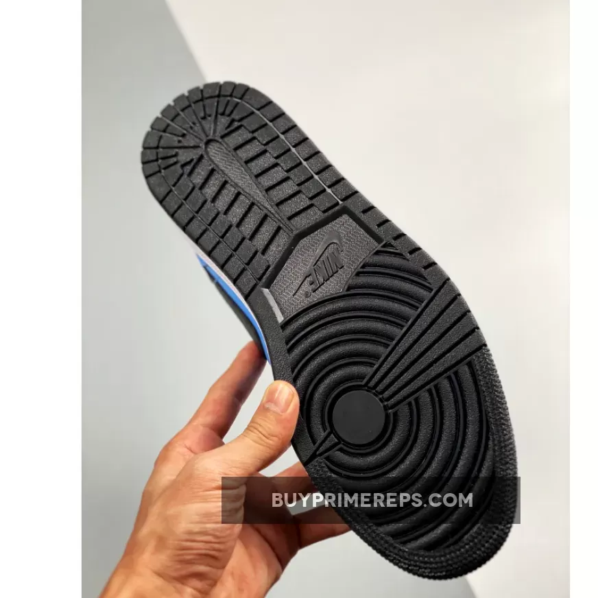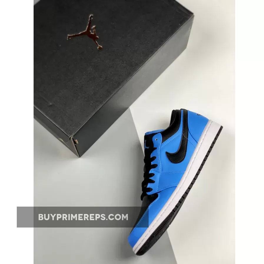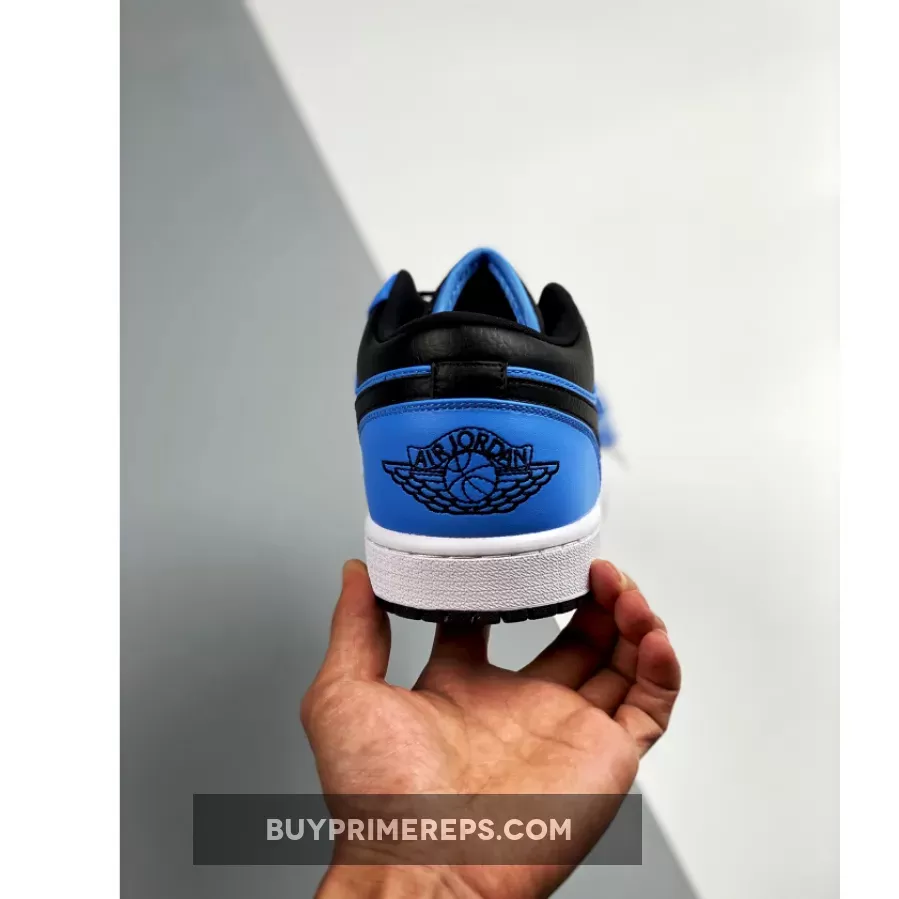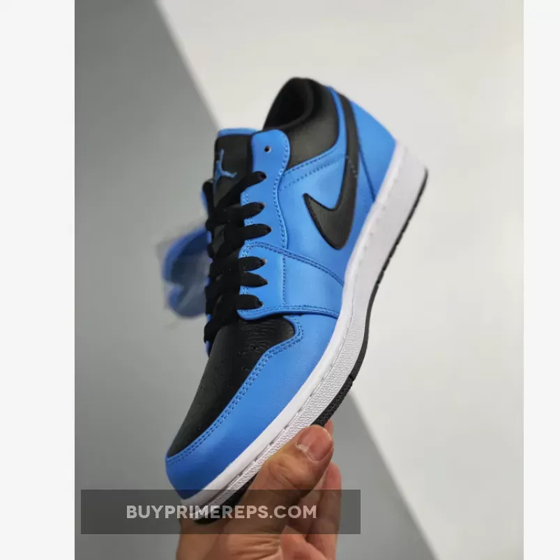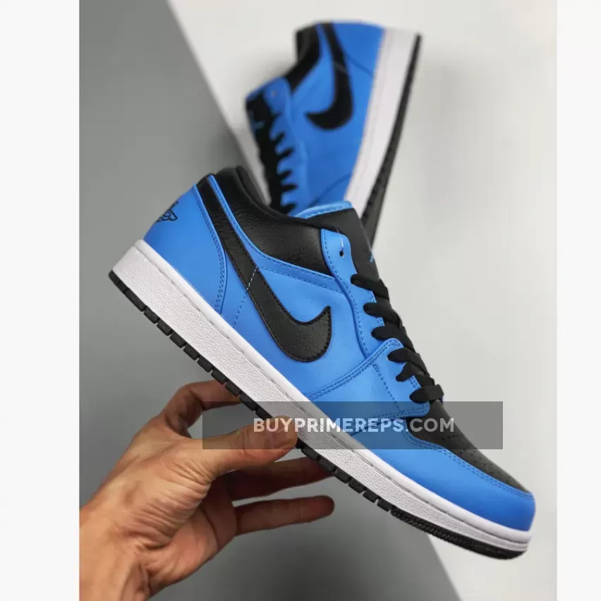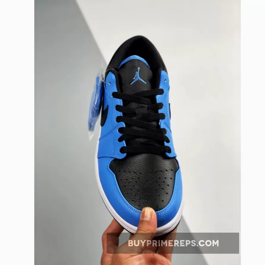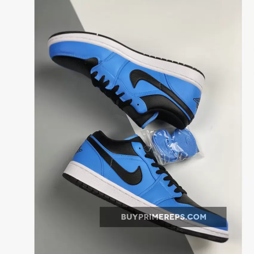 The dual-toned upper of the Air Jordan 1 Low University Blue/Black is a head-turner. The combination of black and University Blue premium and tumbled leather overlays gives these shoes a sleek and modern look. The iconic features that made the AJ1 model famous are present, including the perforated toe box, Swoosh logos on the sides, Jumpman branded tongues, and embroidered wings logo on the heel.