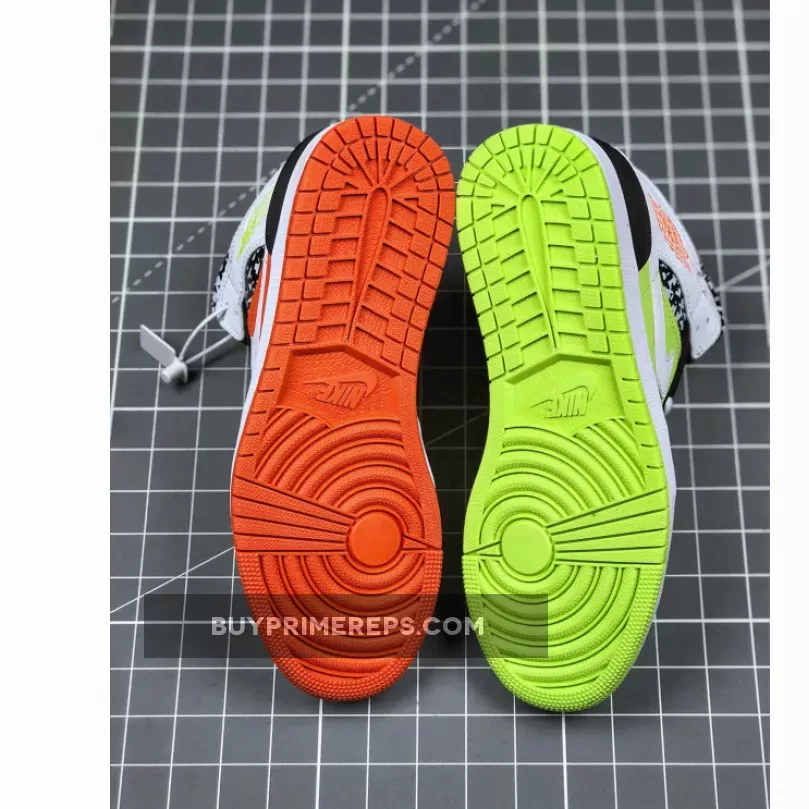 Adding a pop of color to the design, both orange and volt accents can be found on the panels, Wings logo, and rubber outsole. The use of these vibrant hues creates a striking contrast against the white base, further enhancing the visual appeal of the sneaker. The alternating placement of the orange and volt accents on each shoe adds an element of asymmetry, making each pair slightly different and adding an element of individuality to the wearer.
