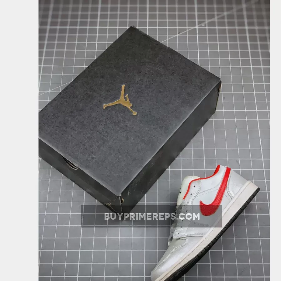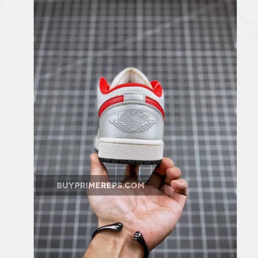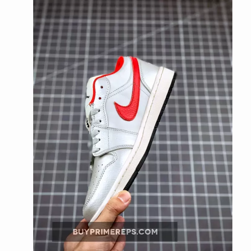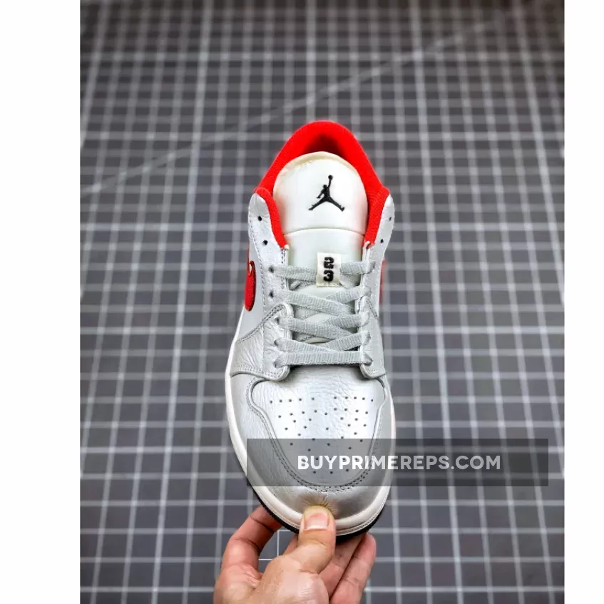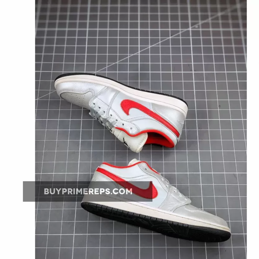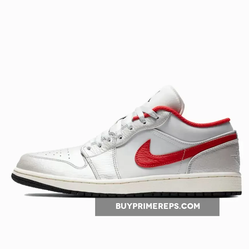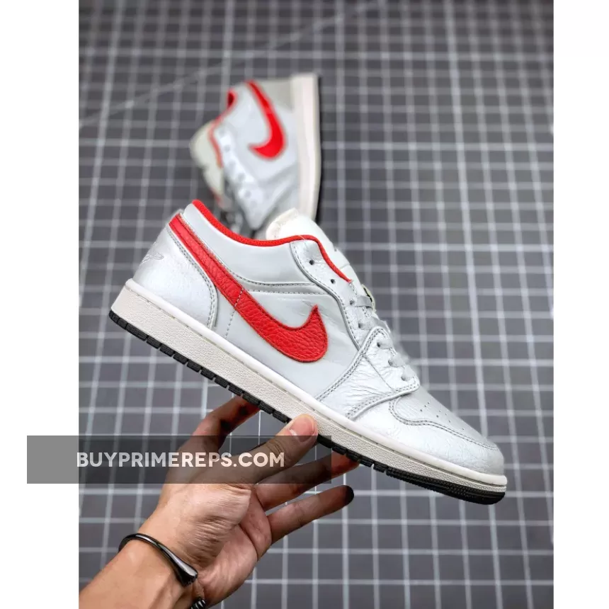 What truly sets this Air Jordan 1 Low apart is the vibrant red accents that add a pop of color to the shoe. The iconic Nike Swoosh logos on the sides are rendered in a bold red, standing out against the white and grey backdrop. This eye-catching detail adds a touch of flair to the overall design, making it a standout choice for sneaker enthusiasts.