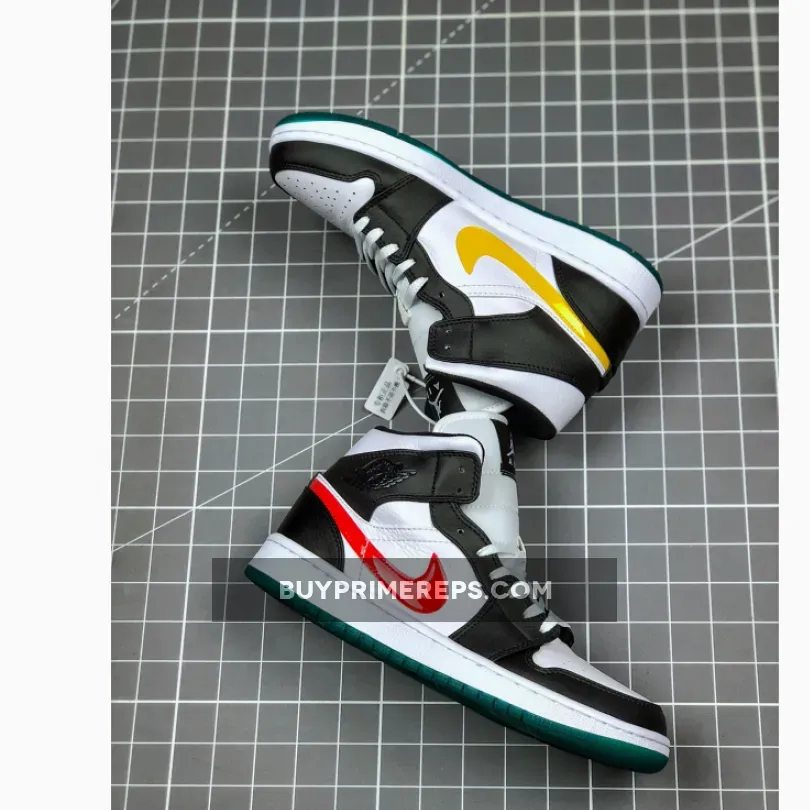 One of the standout features of this shoe is the color scheme. The white base is complemented by black and red accents throughout. The Nike Swoosh logo is done in patent leather and alternates between red and yellow on the sides of the shoe, creating a striking visual contrast. The Jordan “Wings” logo on the ankle adds a touch of branding and completes the overall look.