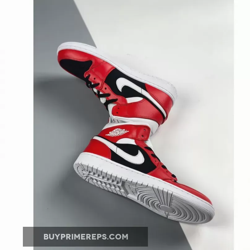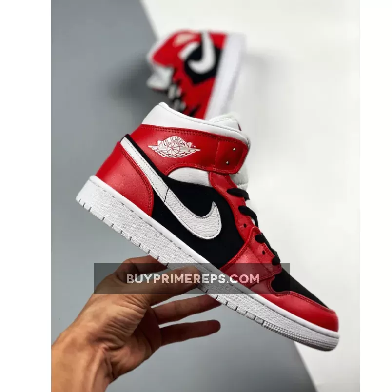 The upper of the Air Jordan 1 Mid is constructed with a combination of materials. A black nubuck base provides a sleek and durable foundation, while red smooth leather overlays add a pop of vibrant color. The Swooshes and heels feature white tumbled leather, adding a touch of contrast and texture to the design. The use of premium materials ensures both style and durability, making these sneakers suitable for everyday wear.