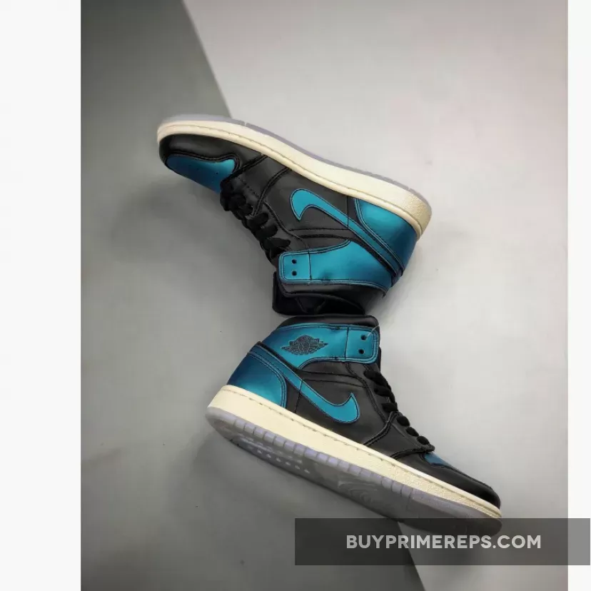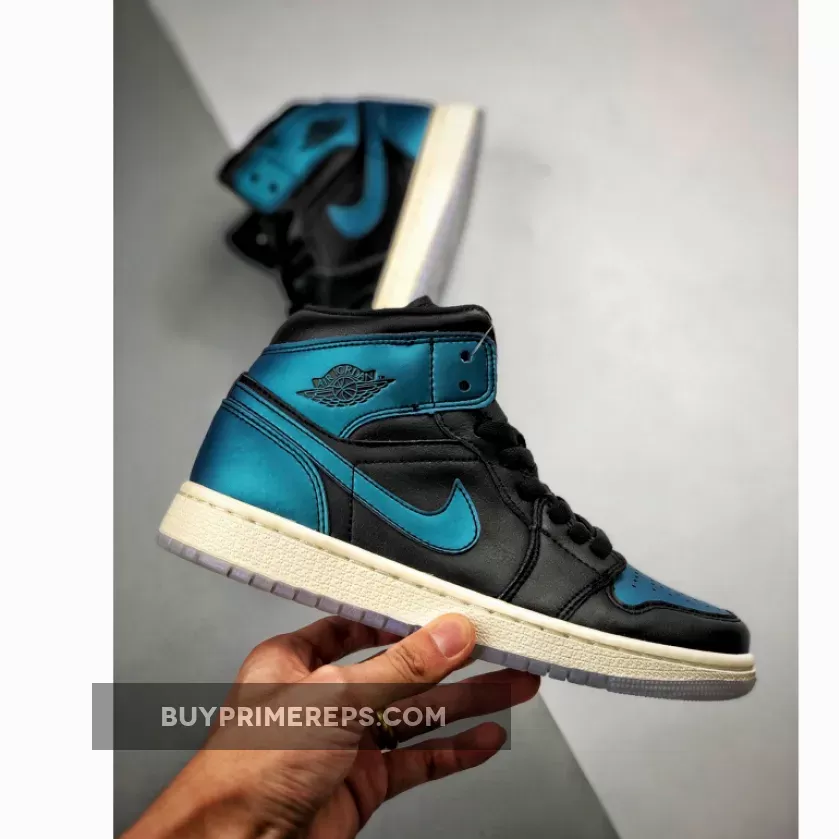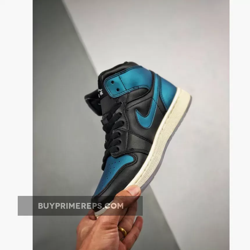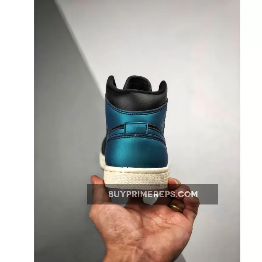 Staying true to its traditional color-blocked aesthetic, the Air Jordan 1 Mid Metallic Turquoise features a sleek black leather base that serves as the canvas for the shoe’s standout feature – the iridescent panels. These panels, located on the mid-panel, toe box, and lateral side, showcase an incredible color-shifting effect, transitioning from a mesmerizing flat blue to a deep and captivating purple depending on the lighting conditions. This iridescent detail truly sets this Air Jordan 1 apart and adds a level of sophistication and uniqueness to the shoe.