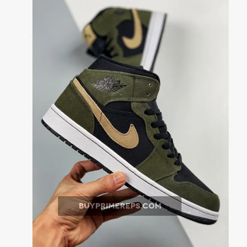 The Nike Air Jordan 1 Mid Trooper is a fresh new colorway for the iconic sneaker, perfect for the autumn and winter months. This iteration of the Air Jordan 1 Mid showcases an array of green hues, with a khaki/camo color scheme that is both stylish and versatile. The upper is constructed with a combination of leather and mesh, providing a comfortable and breathable fit. A lighter green Swoosh is featured on the sidewalls and tongue, adding a pop of color to the overall design. The iconic Jumpman logo can be found on the tongue, adding a touch of authenticity to the shoe.
