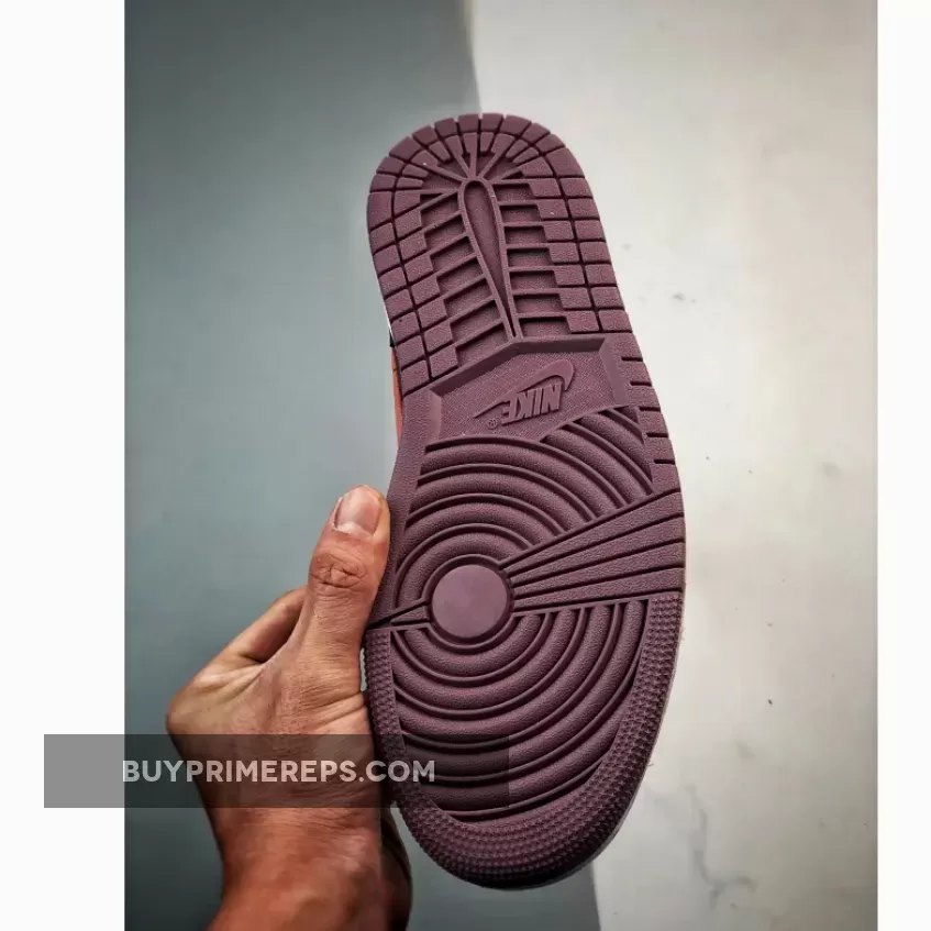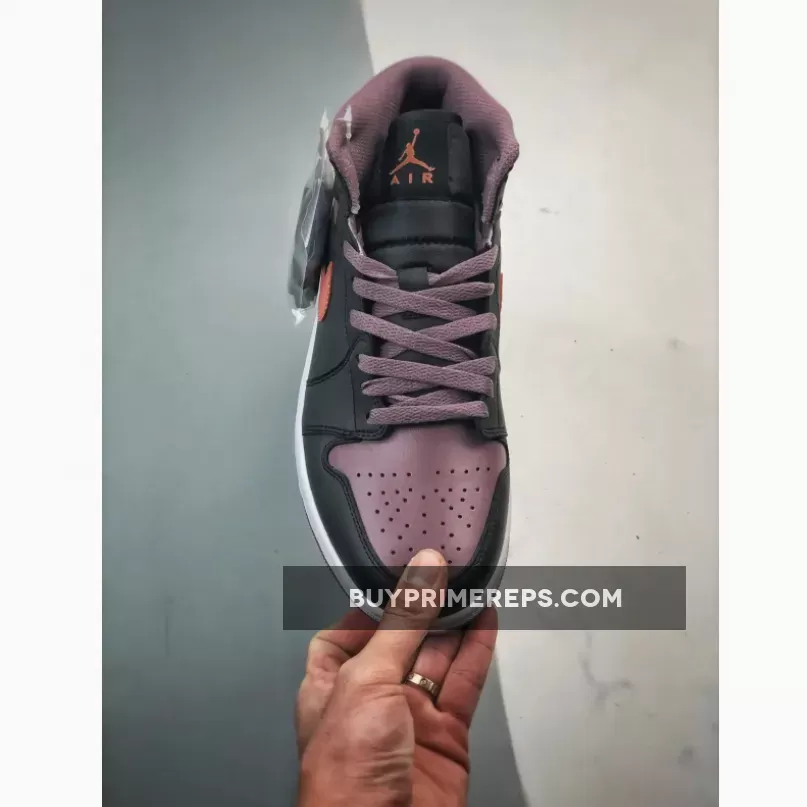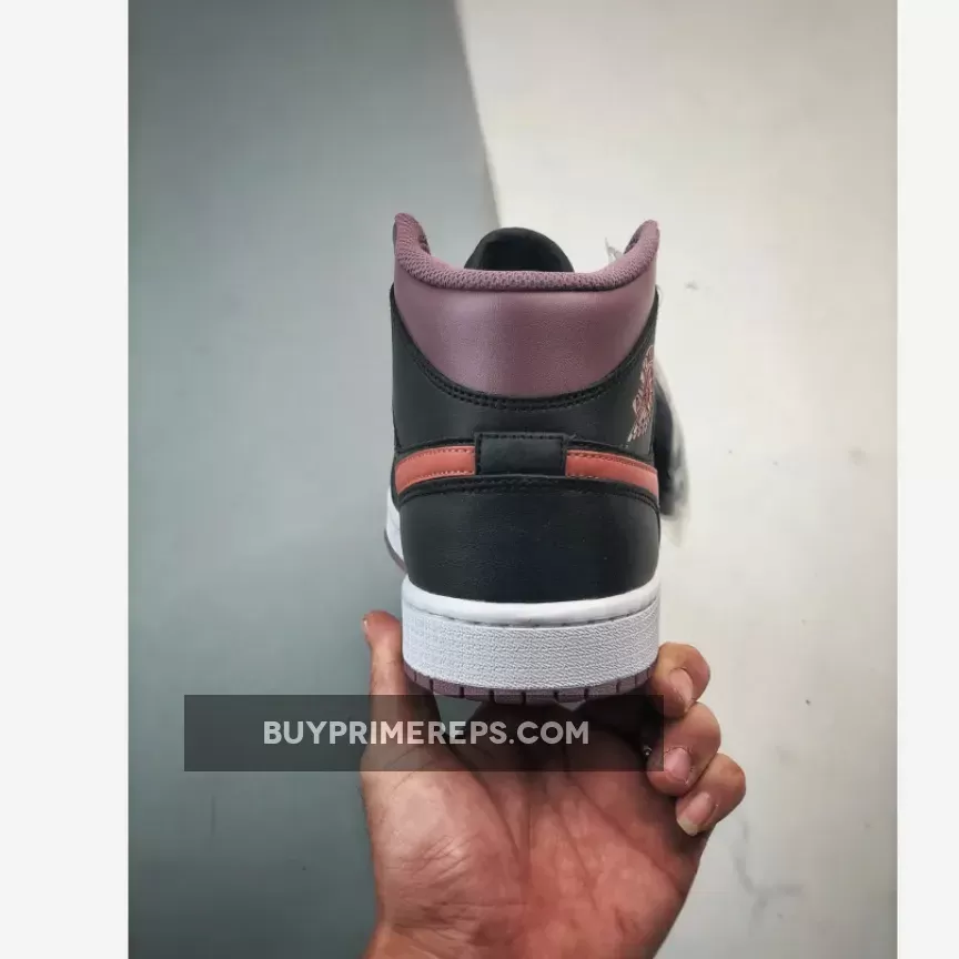 What sets this shoe apart is its striking color combination. The black base is complemented by mauve accents on the toe box, laces, collar, inner lining, insole Jumpman branding, and rubber outsole. These mauve details add a touch of elegance and sophistication to the overall design.