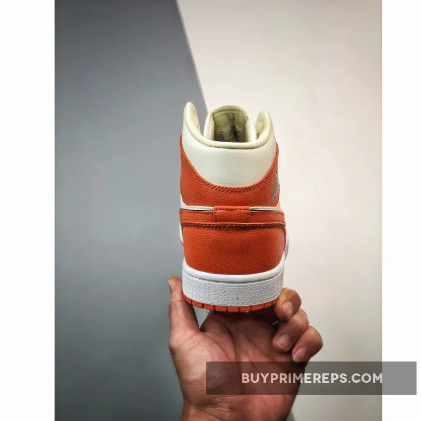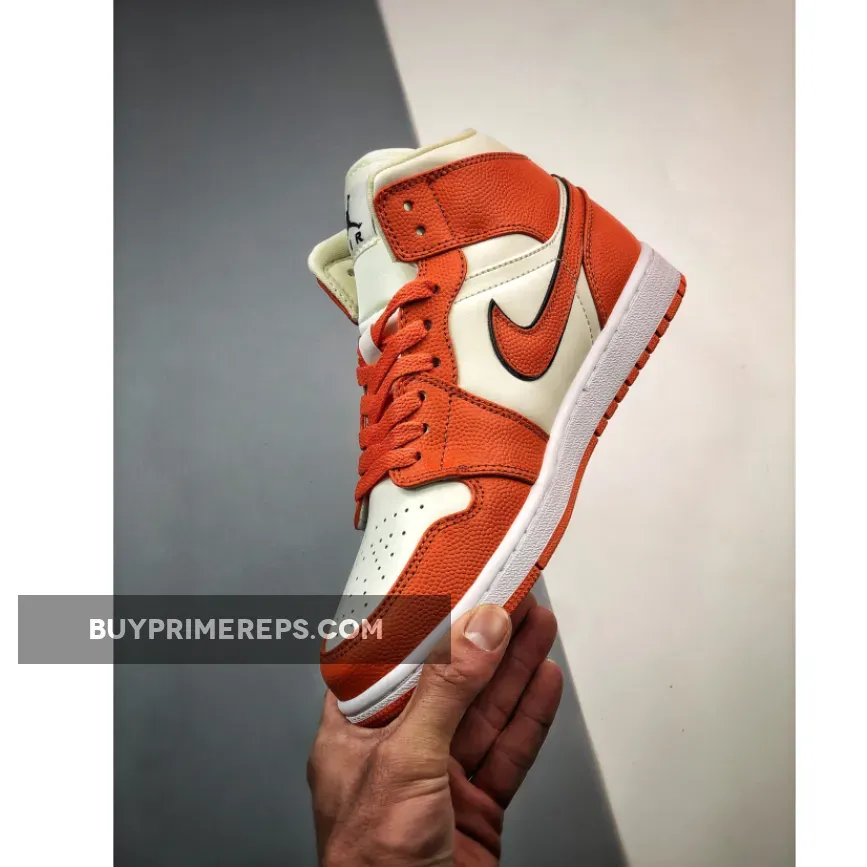 The upper of the Air Jordan 1 Mid SE features a Coconut Milk smooth leather base, providing a clean and premium feel. The shoe also incorporates Orange basketball textured leather overlays, adding a touch of texture and contrast to the design. These overlays are strategically placed on the shoe, emphasizing the iconic shape and lines of the Air Jordan 1.