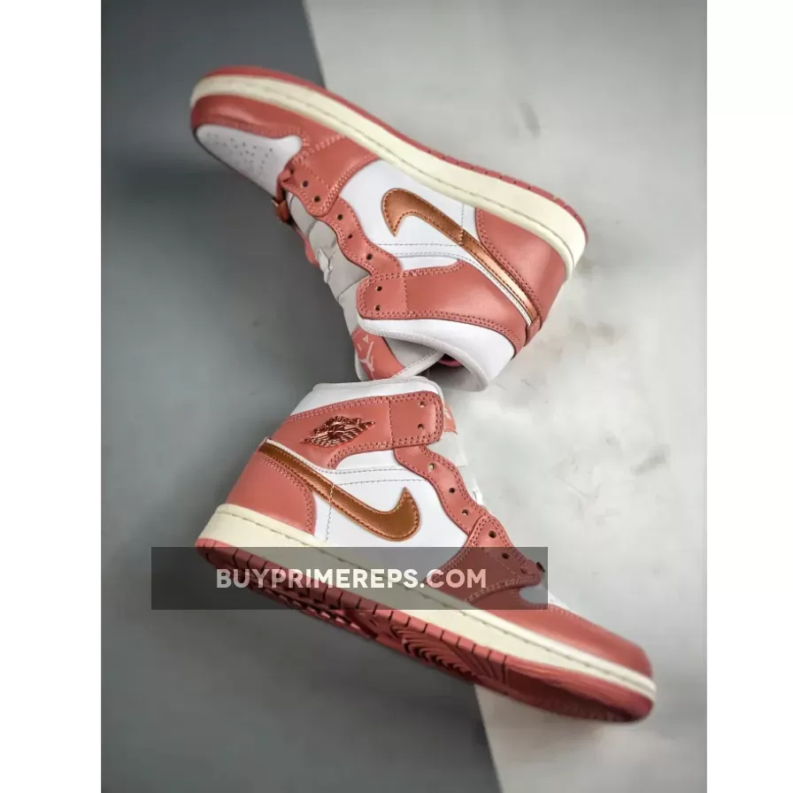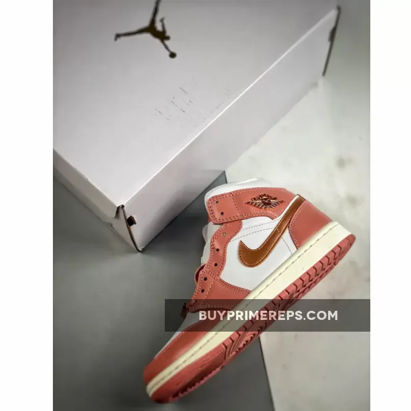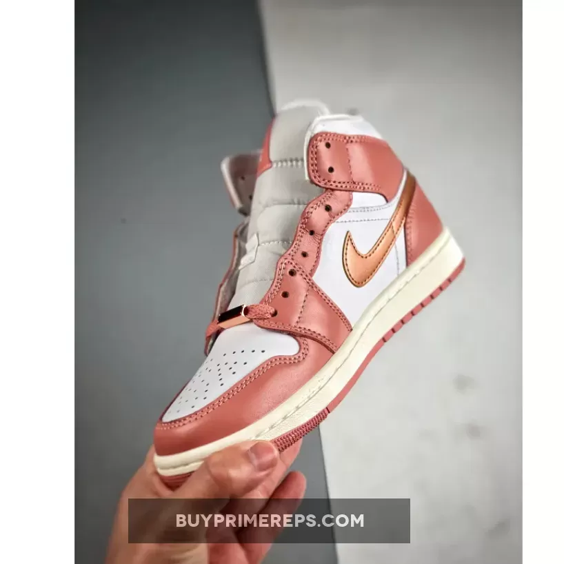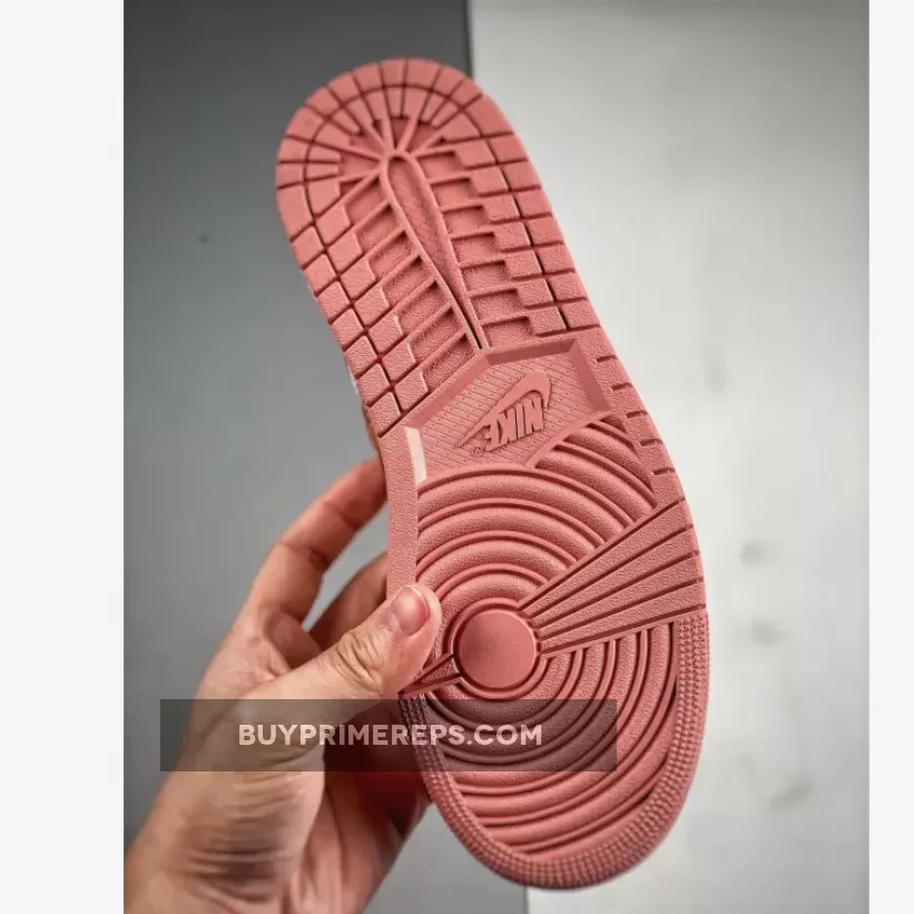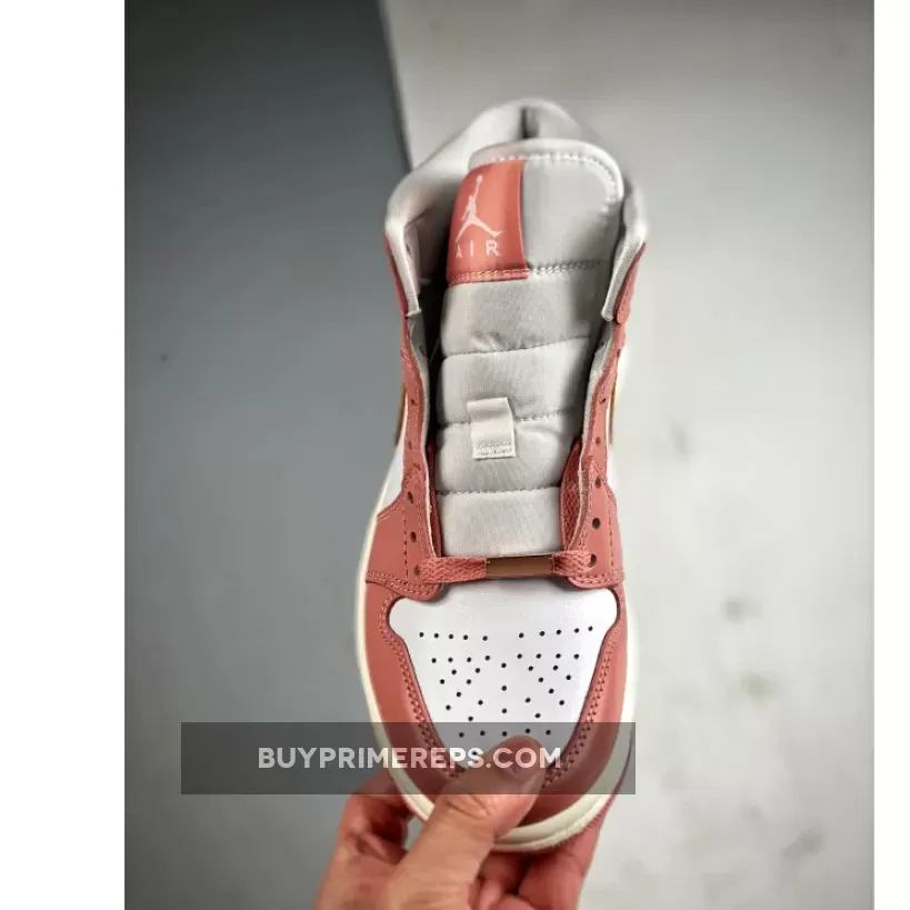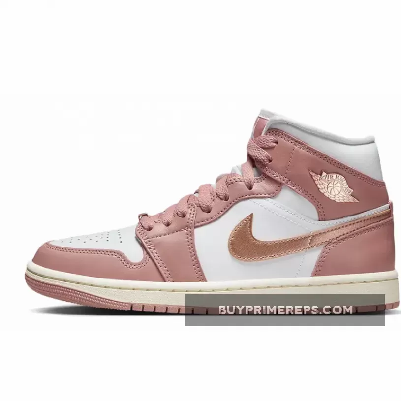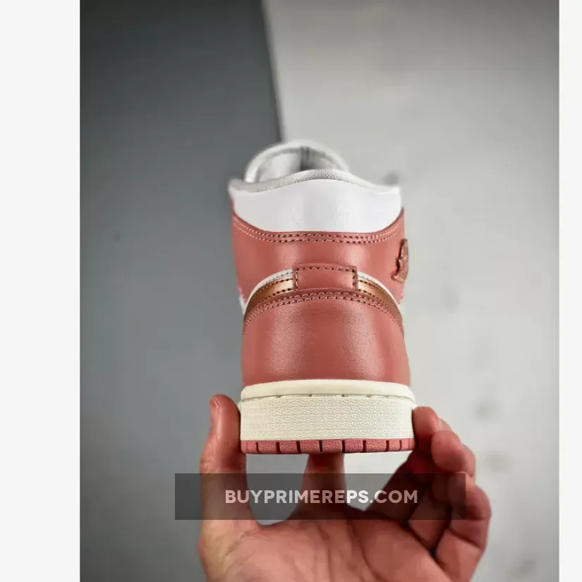 One of the standout features of this Air Jordan 1 Mid is the shimmering rose gold hue used for the profile swooshes and the iconic “Wings” insignia on the lateral ankle flap. This adds a touch of elegance and sophistication to the sneaker, elevating its overall aesthetic. The rose gold accents are further complemented by solid lace dubraes in the same color, creating a cohesive and stylish look.
