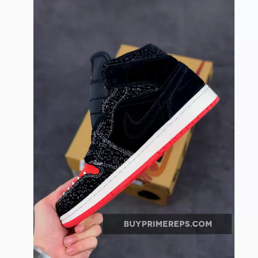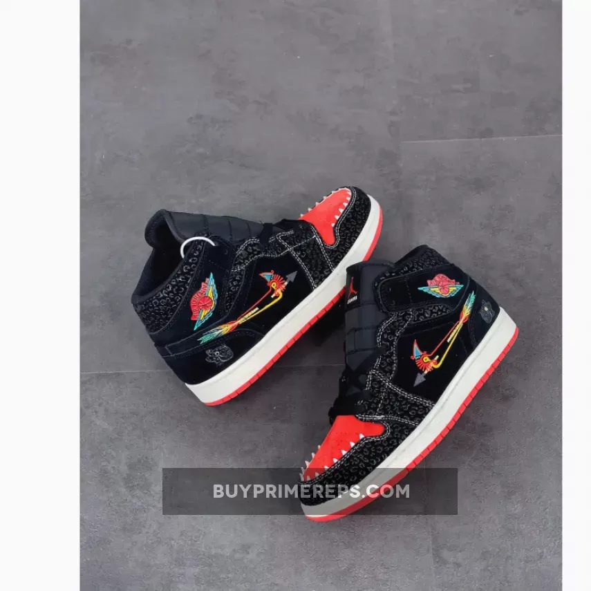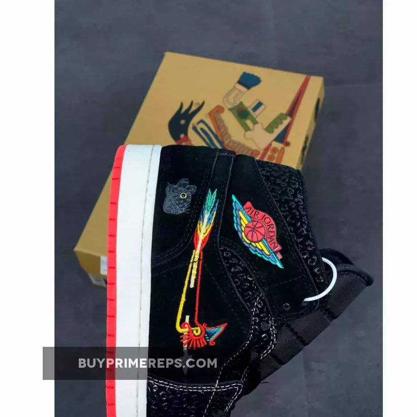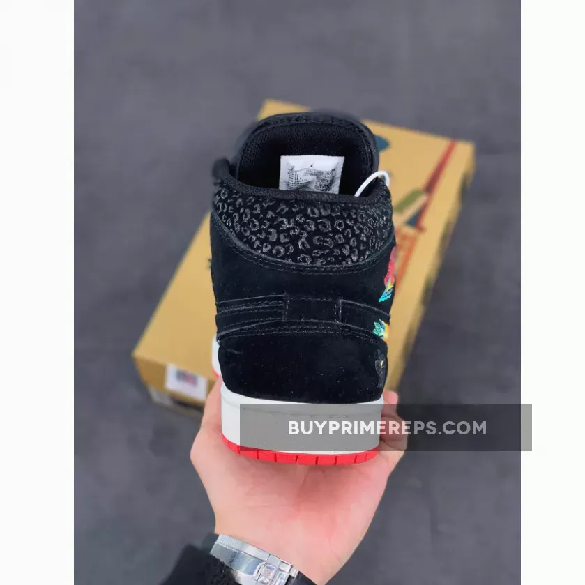 The Air Jordan 1 Mid SE ‘SiEMPRE Familia’ is a remarkable addition to the 2021 ‘Día de Muertos’ collection, paying homage to the unbreakable bonds of family. This mid-top sneaker showcases a unique design inspired by Mictlán, the underworld of Aztec mythology consisting of nine levels. The attention to detail is evident, with a black suede upper serving as the foundation for this striking silhouette. Tonal overlays in a glossy textured finish add depth and dimension to the sneaker’s aesthetic.