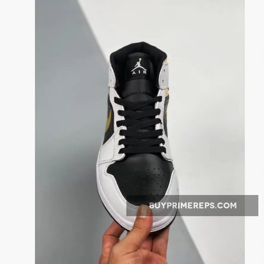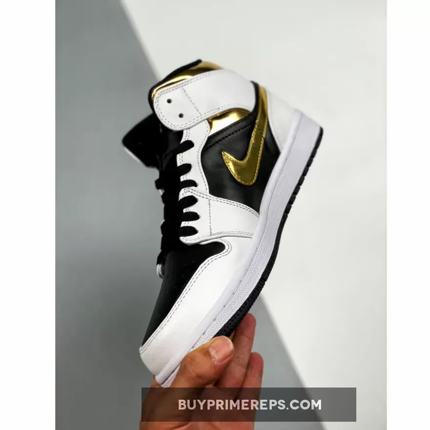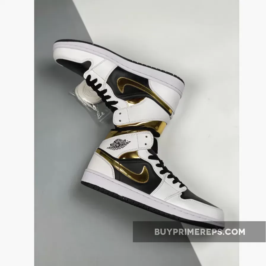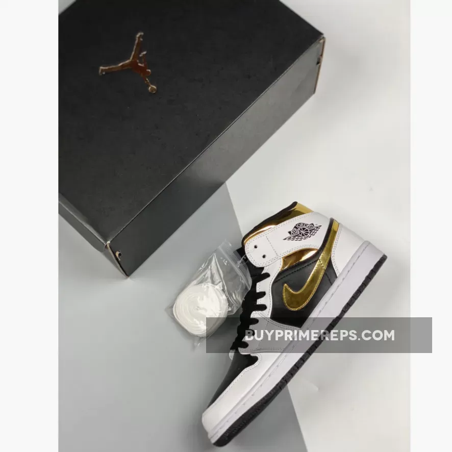 The Air Jordan 1 Mid GS White Gold is a luxurious and stylish sneaker designed for smaller feet. This sneaker features a striking combination of black and white leather, with eye-catching metallic gold accents that add a touch of opulence to the design. The mid-top silhouette is crafted with a smooth black base and white leather overlays, creating a classic yet modern look. The black laces complement the overall aesthetic, while the metallic gold detailing on the iconic Nike Swoosh and ankle area elevates the sneaker’s visual appeal. The Wings logo on the ankle flap and the Jumpman logo on the tongue area add further branding elements to the design.