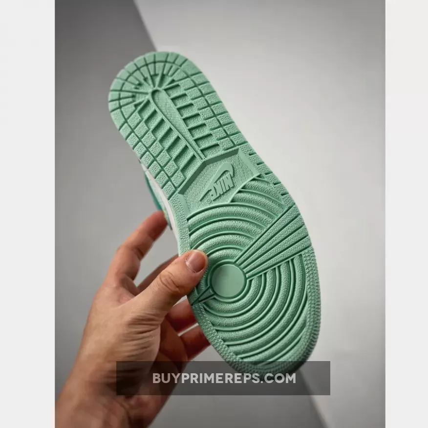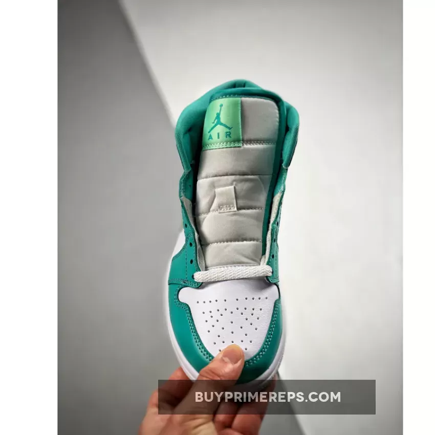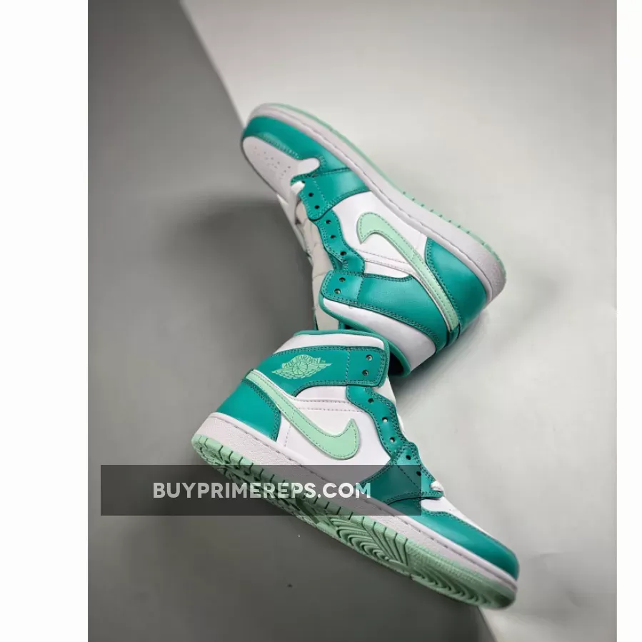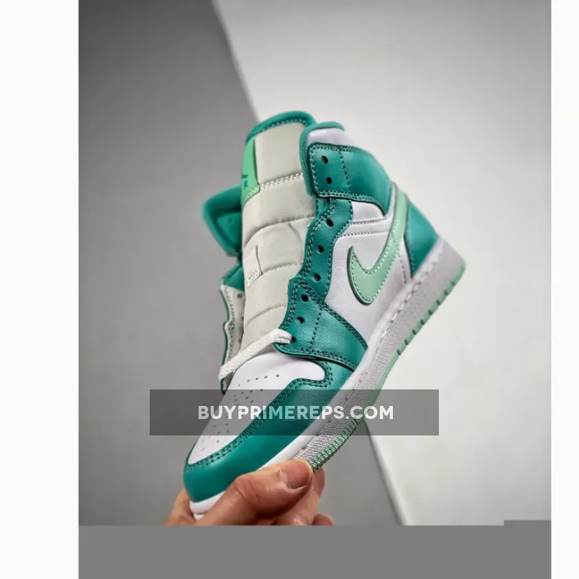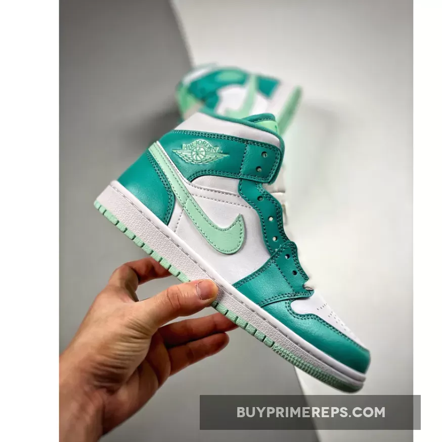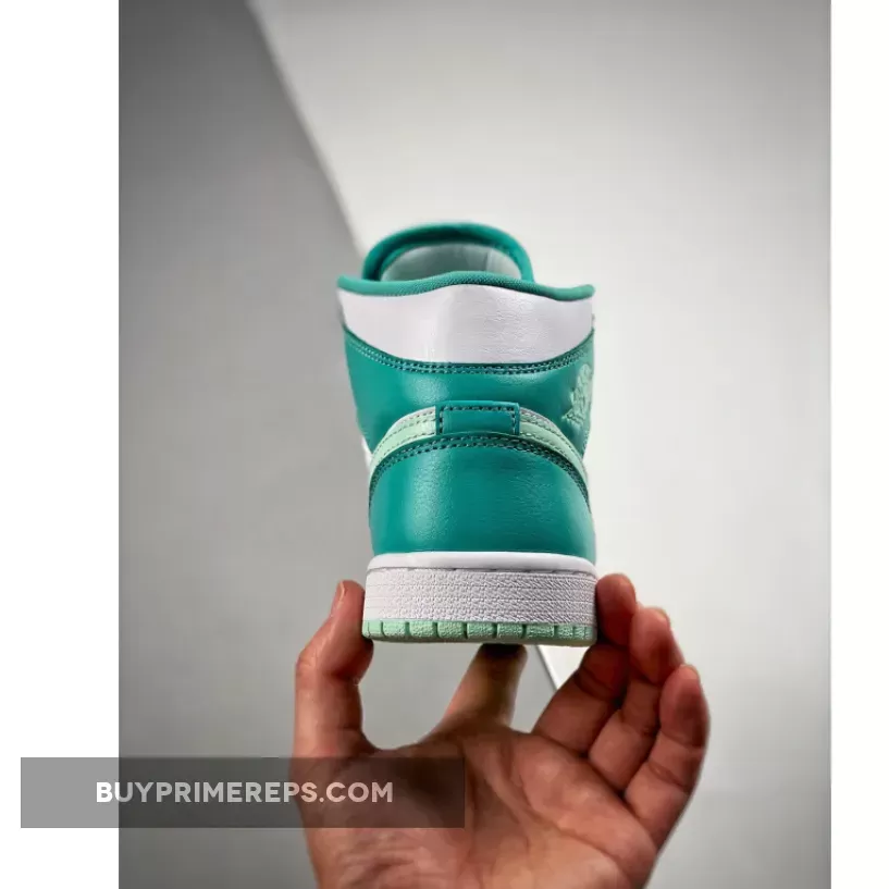 The shoe features a smooth leather composition, with a clean white upper that serves as the base. The standout feature of the Air Jordan 1 Mid Marine Green is the marine green overlays that adorn the shoe. These overlays add a pop of color and give the sneaker a unique and distinctive look.