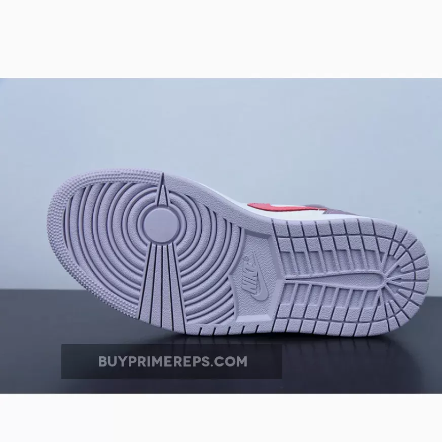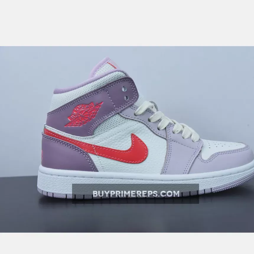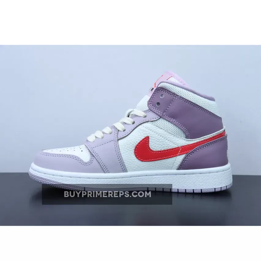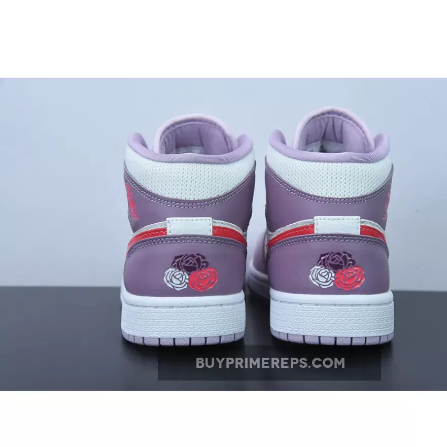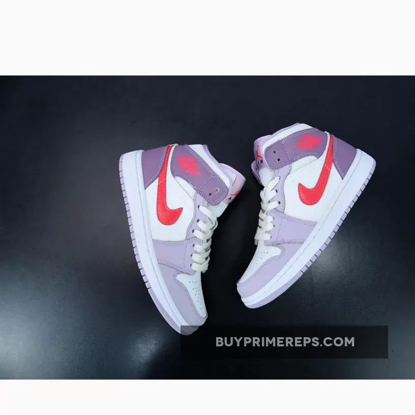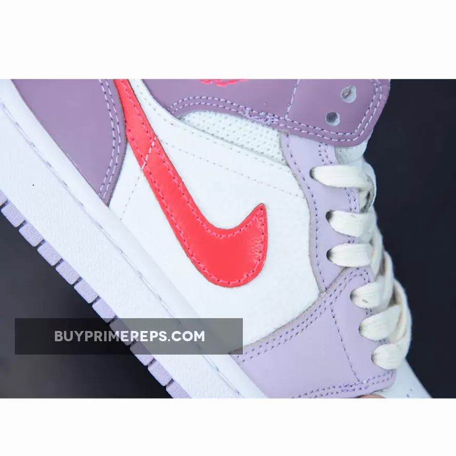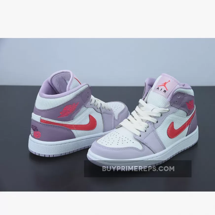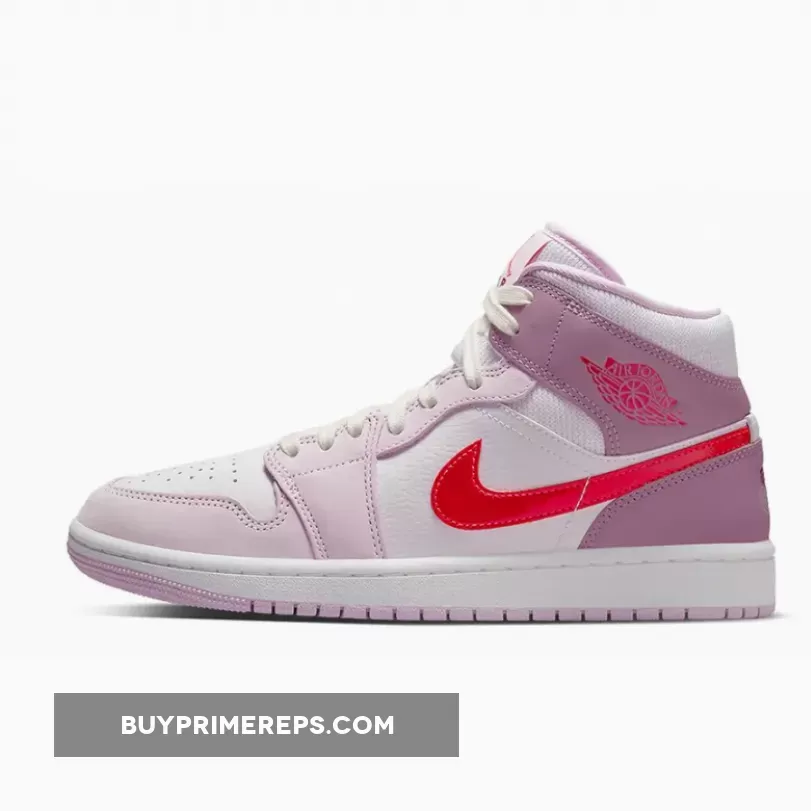 The Air Jordan 1 Mid Valentine’s Day also boasts comfortable features like a breathable mesh tongue and collar. A crisp white midsole and pale lavender rubber outsole complete the elegant look. 👟