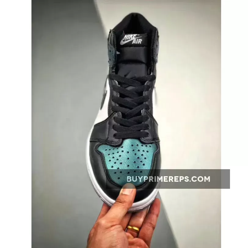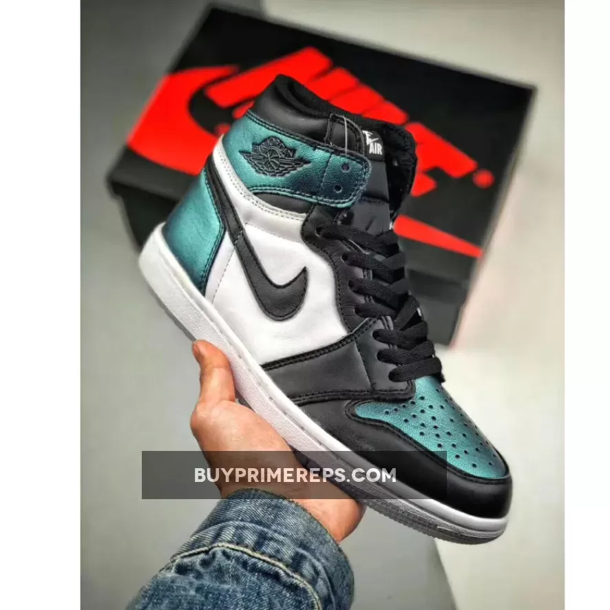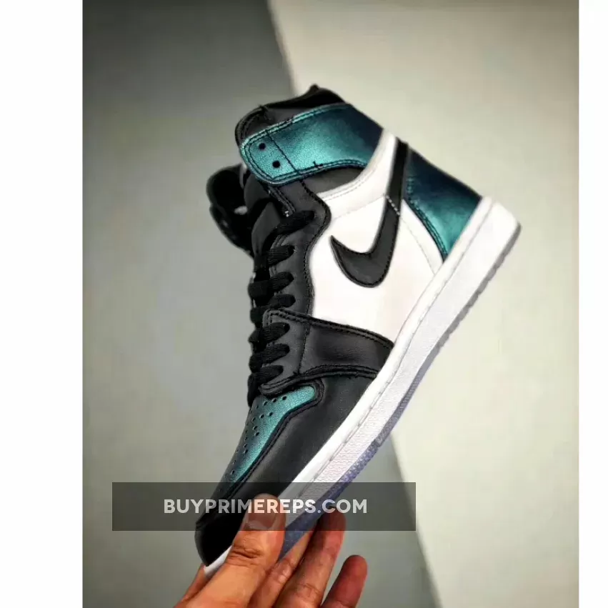 The upper of the Air Jordan 1 “Chameleon” is predominantly black and white, with panels of green color blocking that adds a pop of vibrancy to the shoe. The green color has an iridescent effect, similar to the “Chameleon” Air Jordan 6, which gives the shoe a mesmerizing and ever-changing appearance when viewed from different angles.