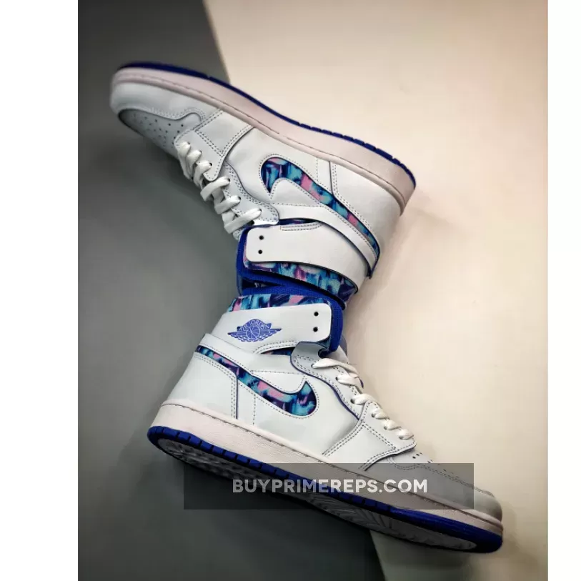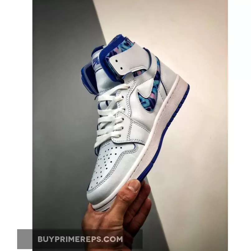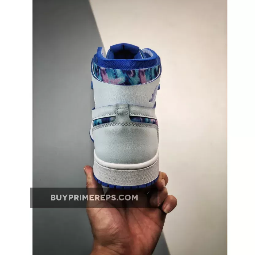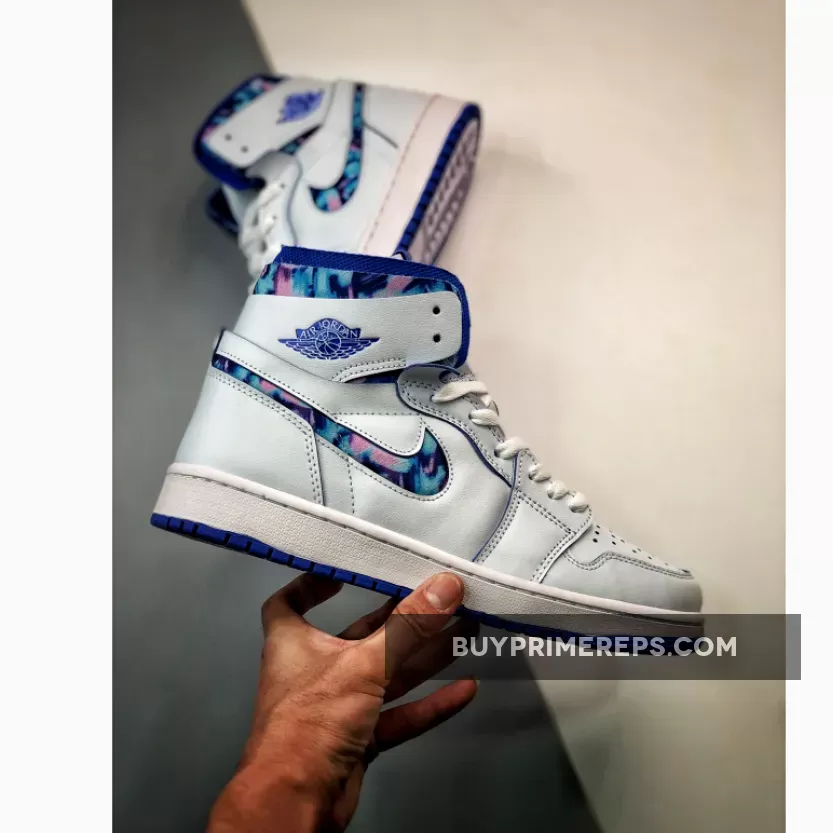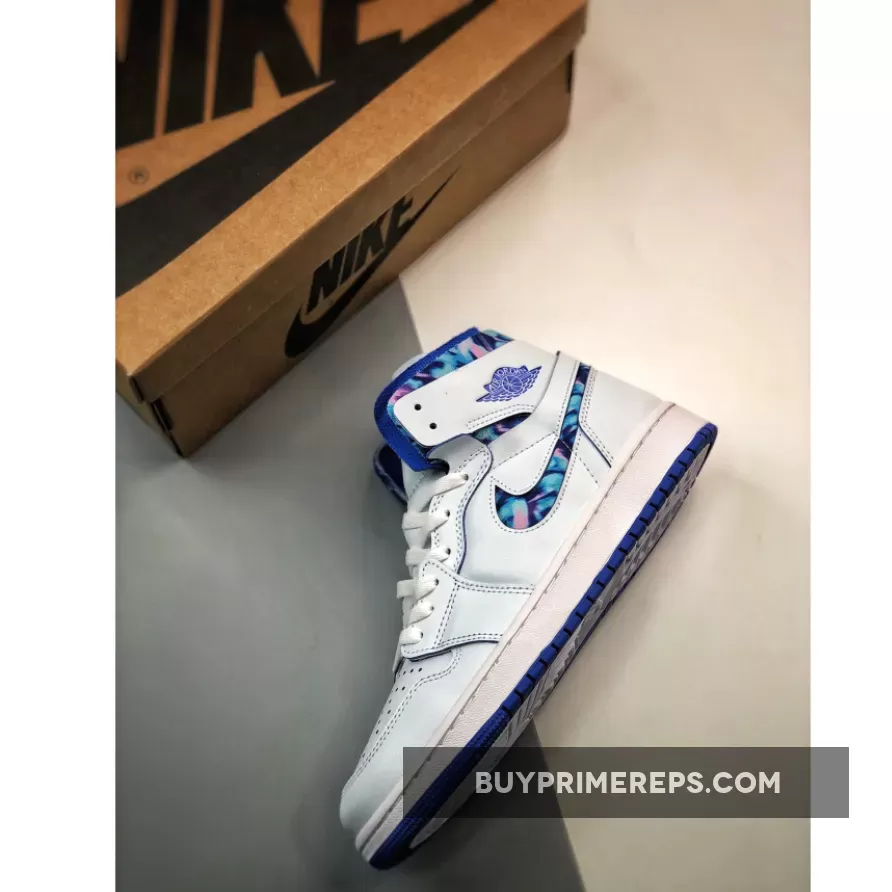One of the standout features of this sneaker is the vibrant and playful patterns that adorn the cut-out Swoosh logos on the lateral and medial walls, as well as the collars. These patterns, reminiscent of retro brushstrokes, come in bold and retro-inspired hues of purple, pink, blue, and teal. These colorful accents add a touch of excitement and personality to the classic Air Jordan 1 silhouette.