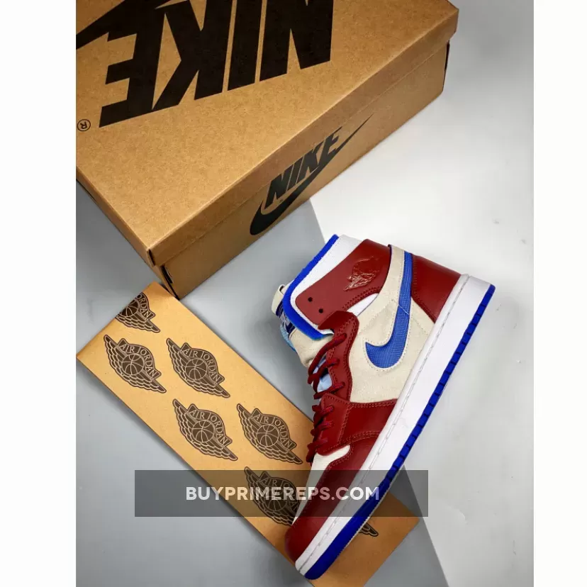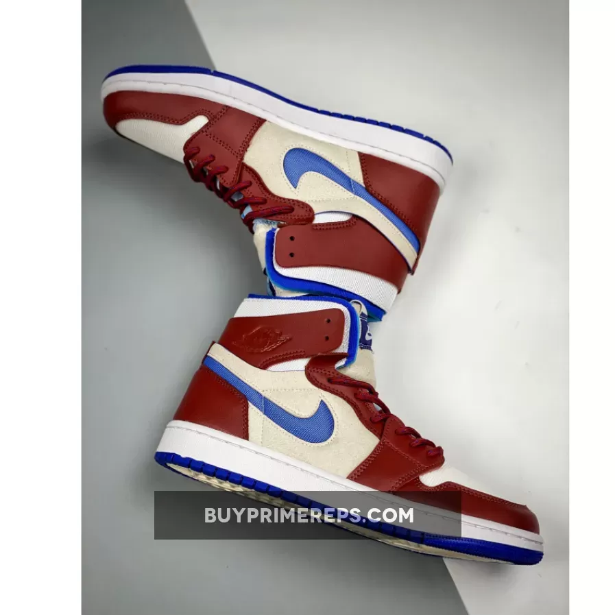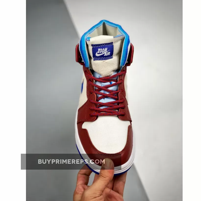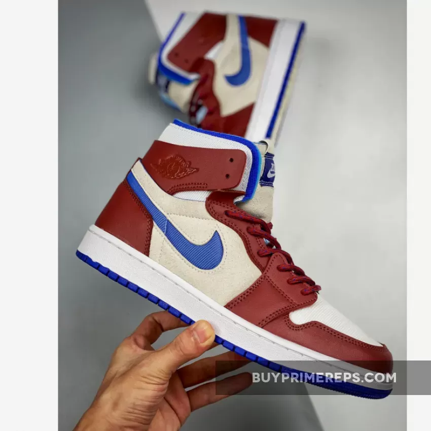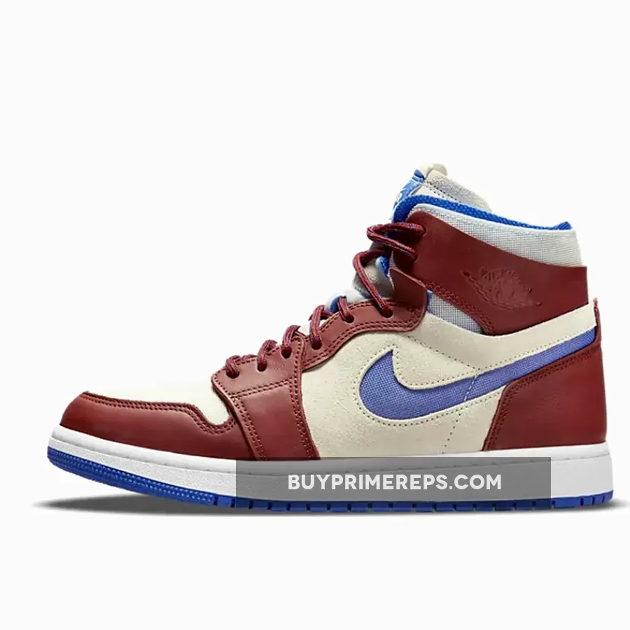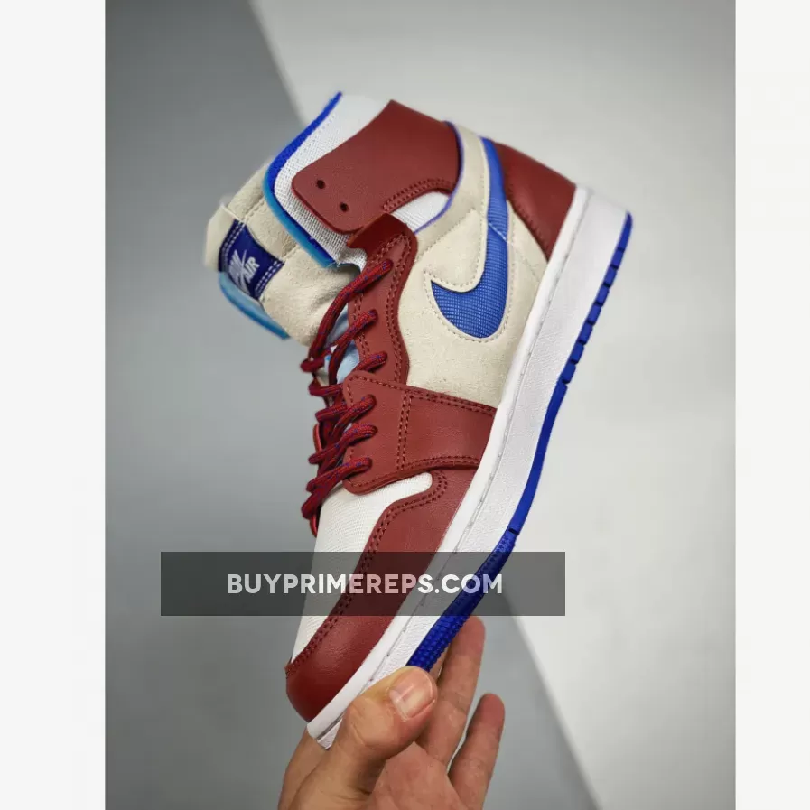 The Air Jordan 1 High Zoom Ivory Blue showcases a striking colorway that combines Team Red leather overlays with a cream suede base. The contrasting Ivory Blue hue is exposed through the cutout Swooshes, adding a pop of color to the design. The sneakers also feature MJ’s iconic wings logo debossed on the ankle flaps, adding a touch of authenticity and heritage.