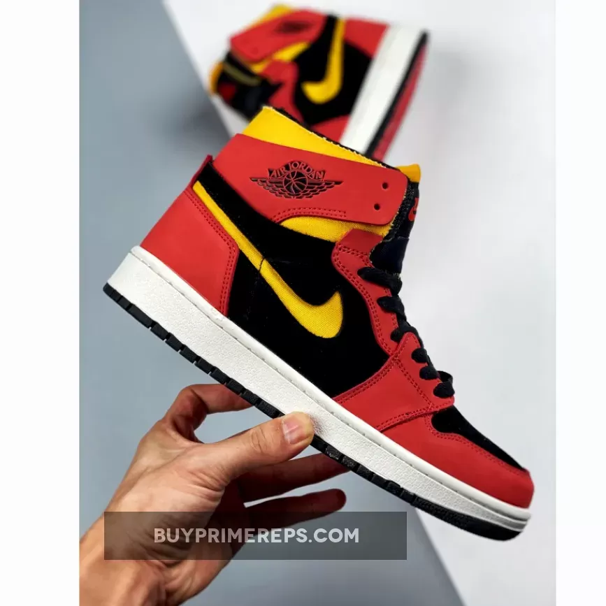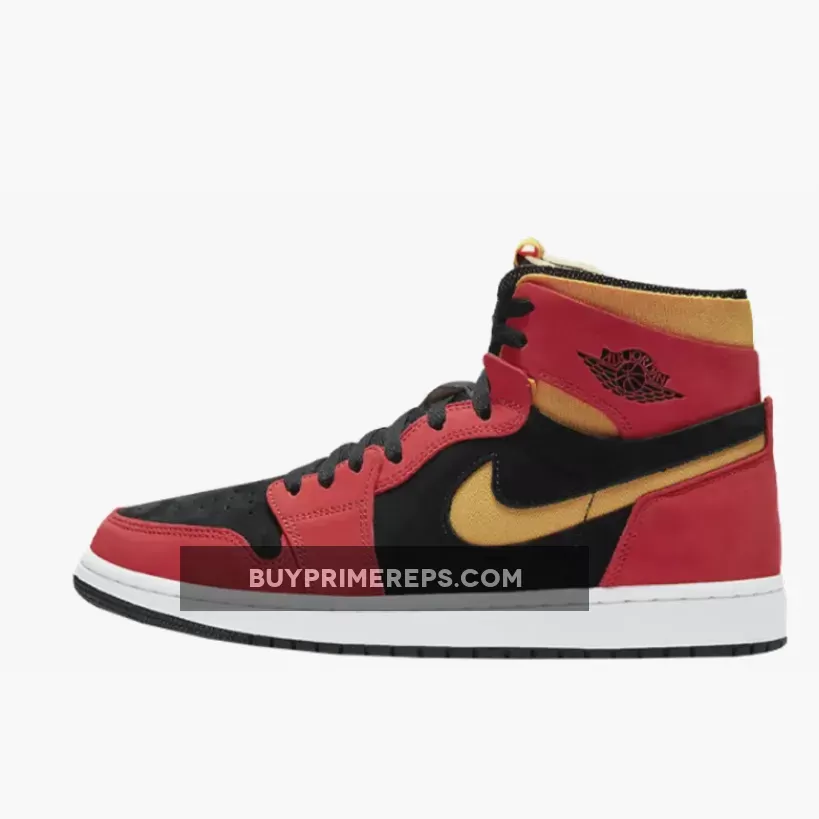 The upper of the Air Jordan 1 Zoom Comfort features a mix of premium materials, including Black suede on the panels and toe, and Red leather overlays around the toe and heel. The use of suede and leather gives the shoe a luxurious and high-quality look and feel. Adding to the design, Gold canvas is used on the Swoosh and ankle, providing a vibrant pop of color and texture.