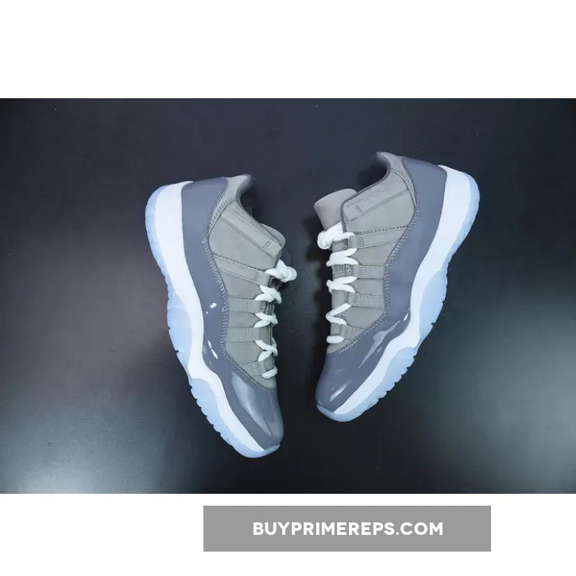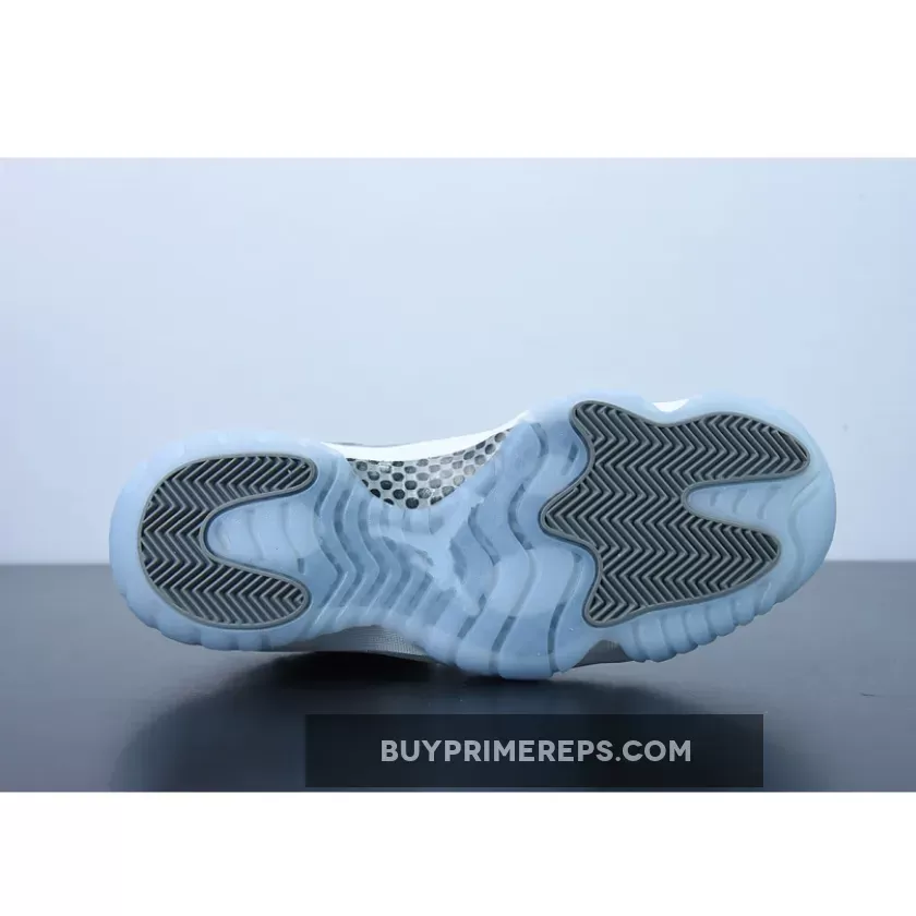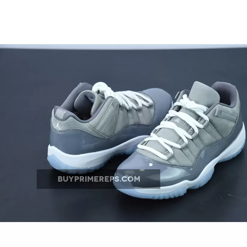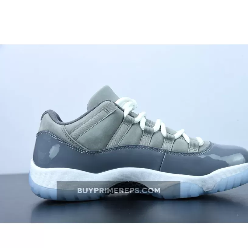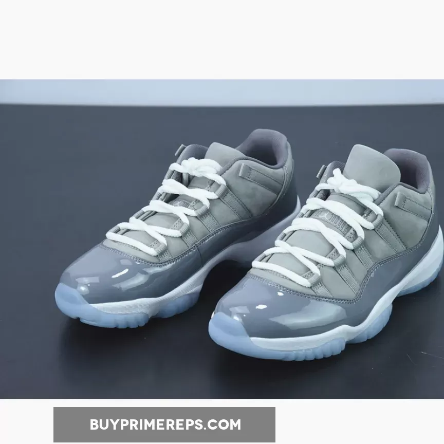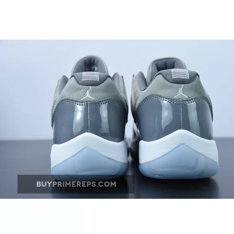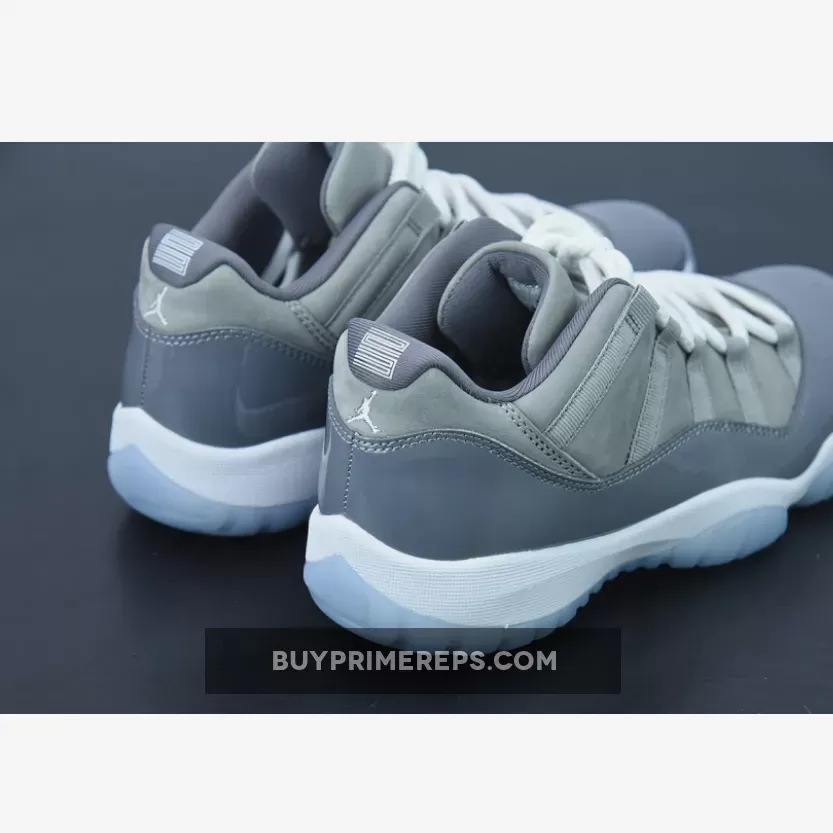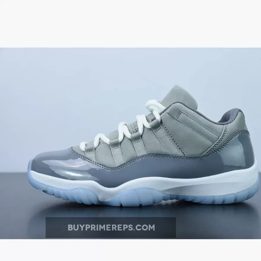 The Air Jordan 11 Low “Cool Grey” features a sleek and stylish monochromatic color scheme. The upper is constructed with a cool grey nubuck material, giving the shoe a premium and luxurious look. The signature feature of the Air Jordan 11, the patent leather mudguard, is also present in a darker medium grey color, adding depth and contrast to the design.