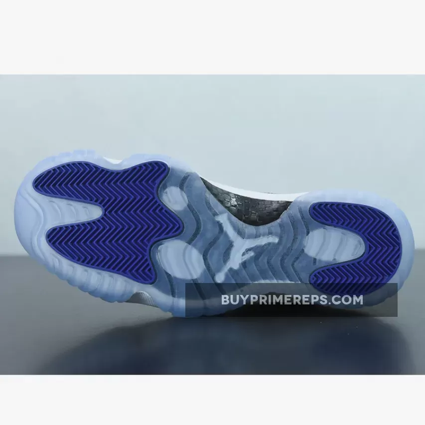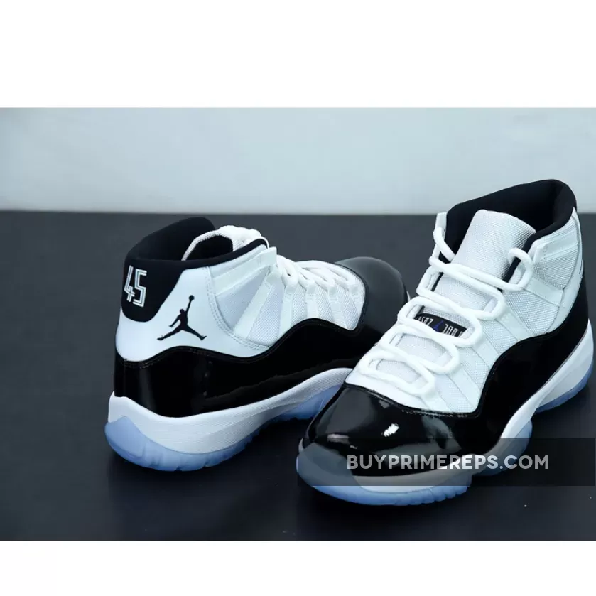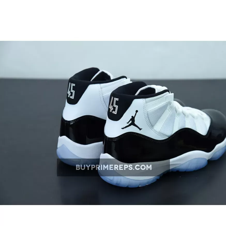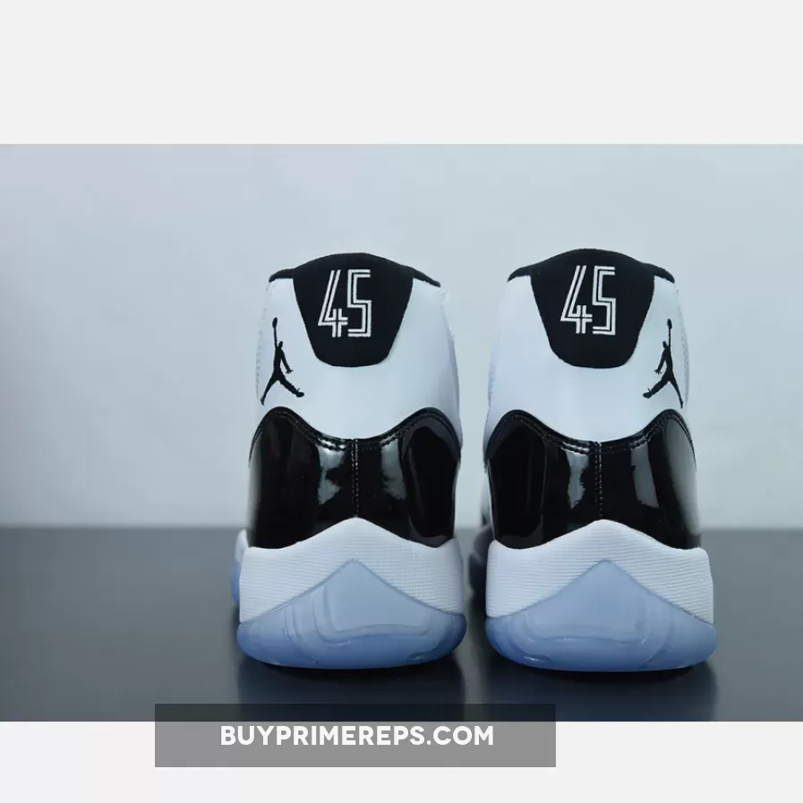 The 2018 Retro edition of the Air Jordan 11 “Concord” features some unique details that set it apart from previous releases. The most noticeable change is the higher-cut patent leather mudguard, which is designed to mimic the original pair that was made for Michael Jordan. This detail gives the shoe a more authentic and premium feel. Another significant change is the substitution of the number “45” for the traditional “23” on the heels. This pays homage to the jersey number that Jordan wore upon his return to basketball following his first retirement. The decision to use “45” is a nod to the first pairs of the “Concord” AJ11 that Jordan debuted in the 1995 NBA Playoffs.