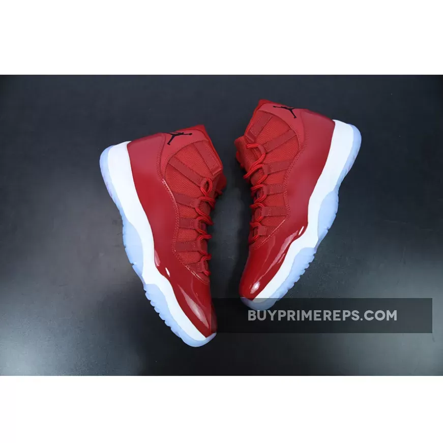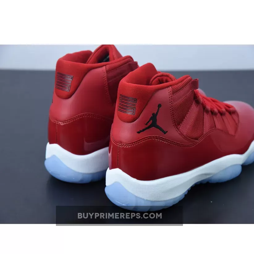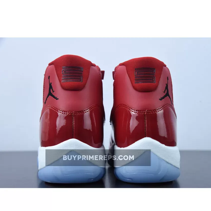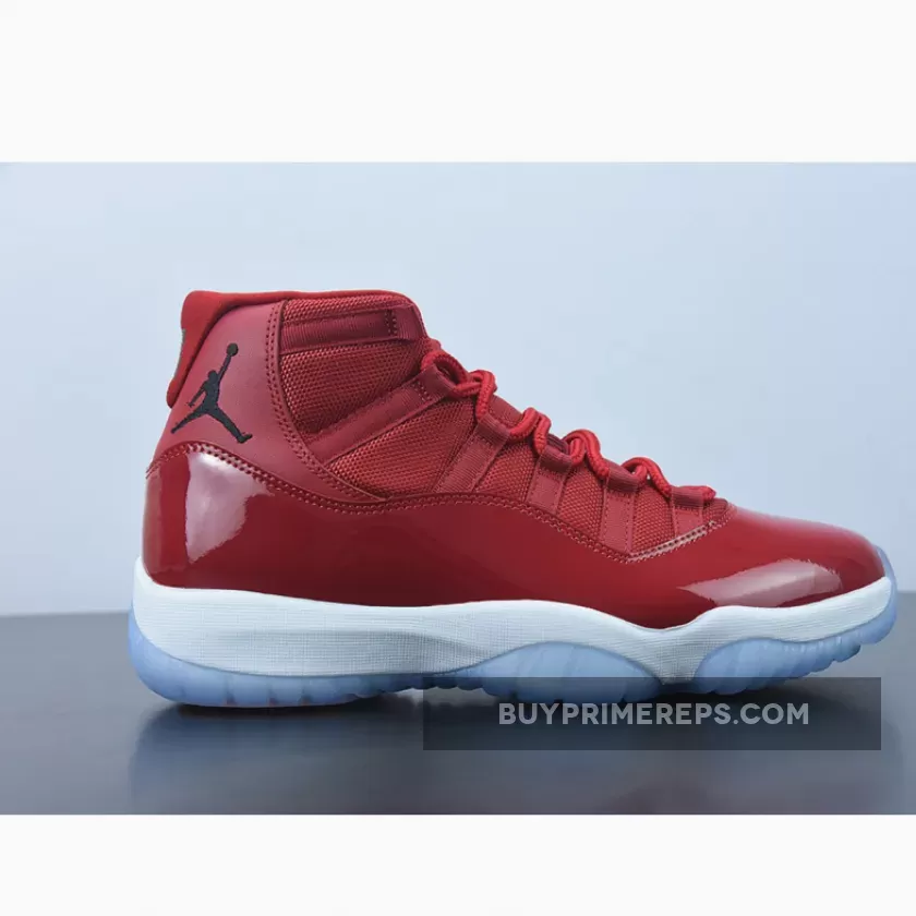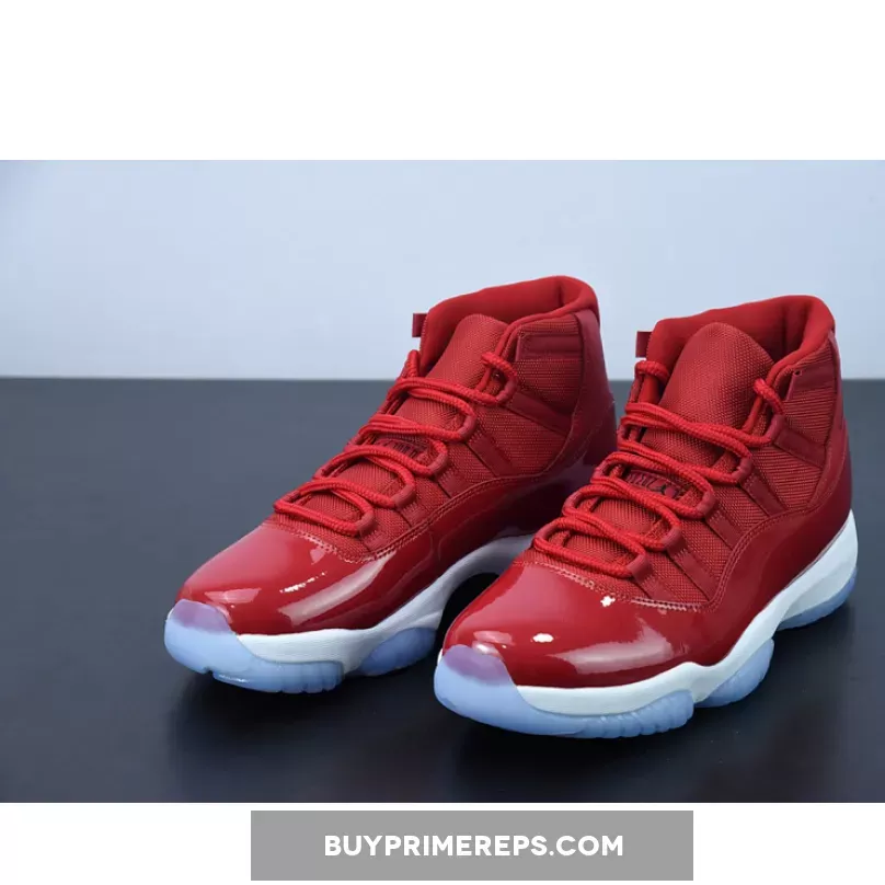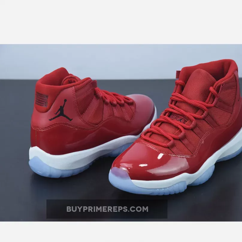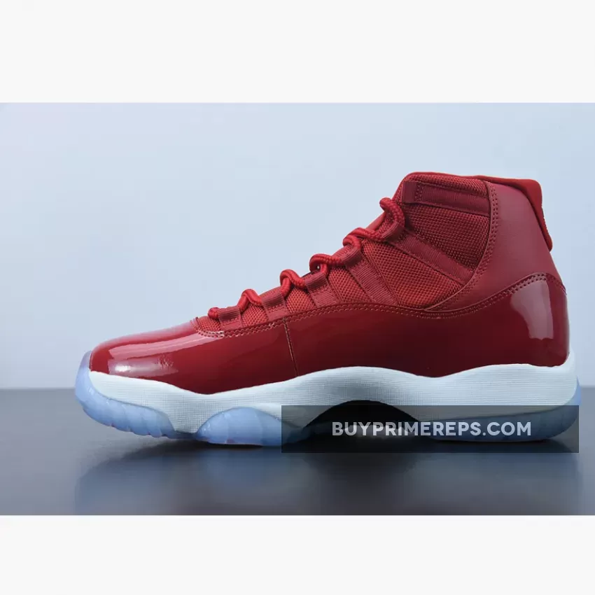 The Air Jordan 11 Retro “Win Like 96” features a striking colorway of Gym Red, Black, and White. The vibrant red hue dominates the shoe, covering the patent leather mudguard, the mesh upper, and the leather around the heel. The patent leather is also higher, reminiscent of the original release. The black Jumpman branding and heel branding add a sleek touch, contrasting against the bold red. Completing the design is a crisp white midsole and a translucent outsole, adding a touch of elegance to the shoe.