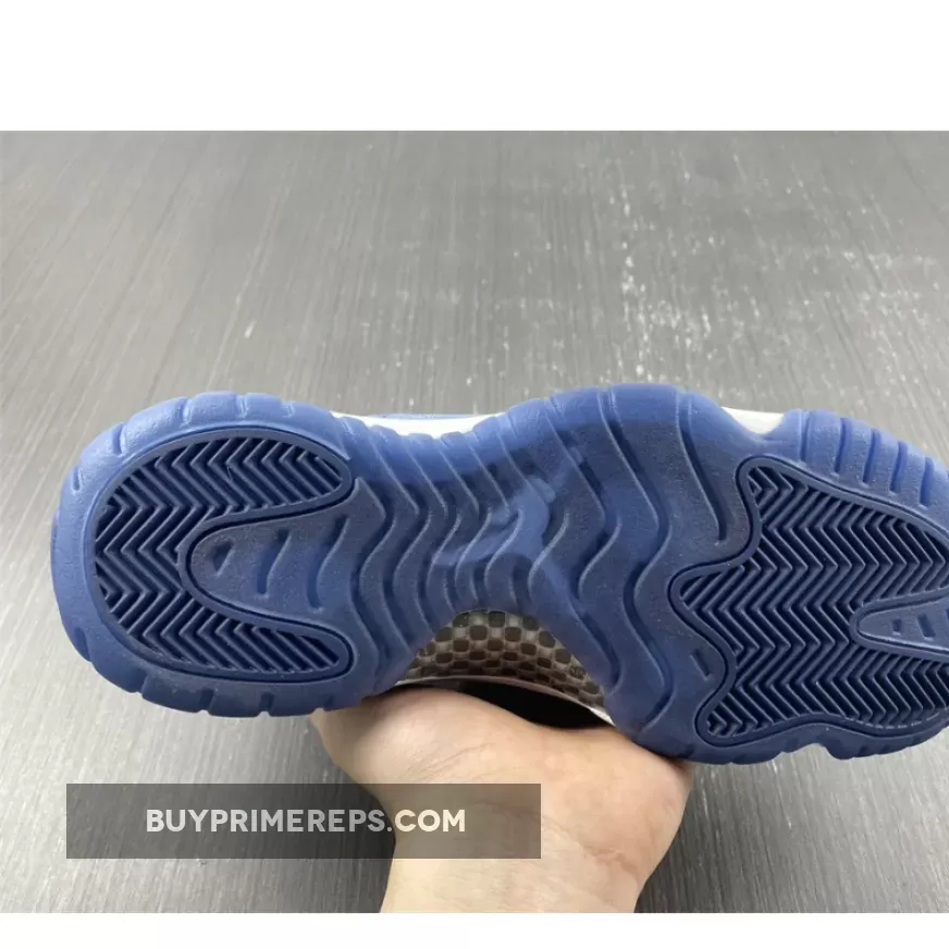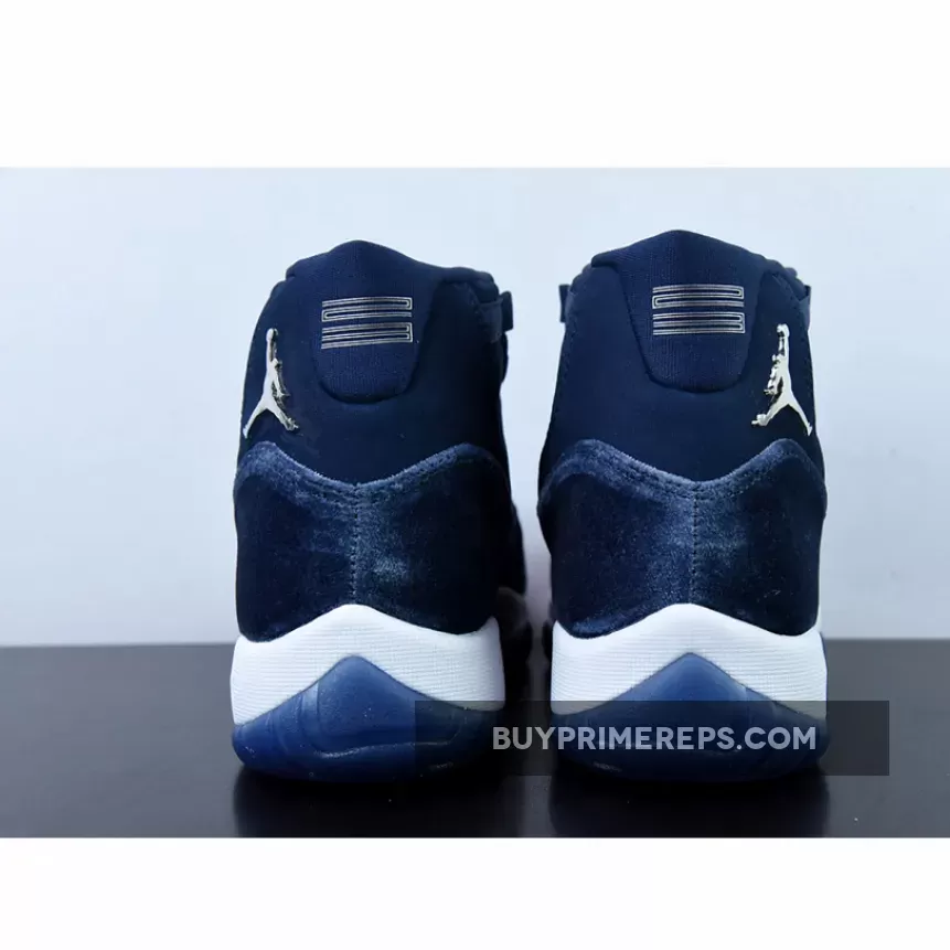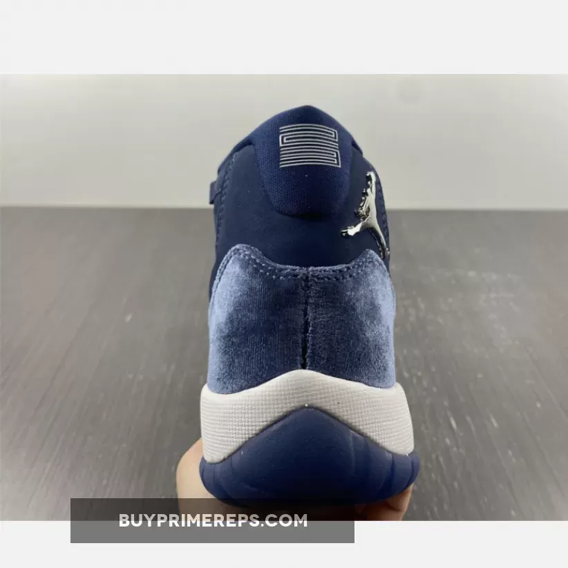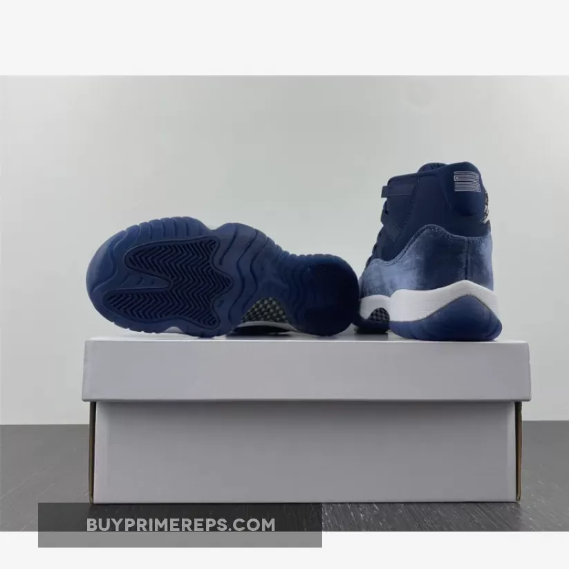 The attention to detail on the Air Jordan 11 Velvet Midnight Navy is impeccable. The outsole of the shoe is coated in the same Midnight Velvet color, seamlessly blending into the crisp-white midsole. This contrast adds a touch of brightness to the overall design and helps to highlight the unique velvet mudguard.