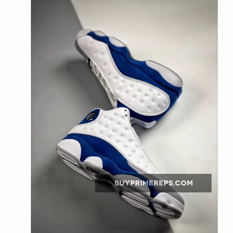 The standout feature of this Air Jordan 13 is the French Blue hue that adorns the suede heel panels and lower mid-panels. This rich purplish-blue shade adds a touch of elegance and sophistication to the overall design. The rest of the shoe is predominantly white, with crisp leather uppers, tongues, liners, and midsoles. The Light Steel Grey on the toe section provides a neutral contrast that complements the French Blue perfectly.