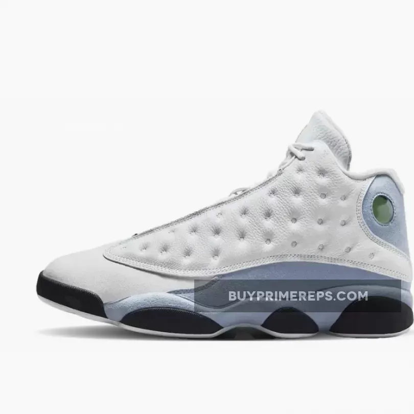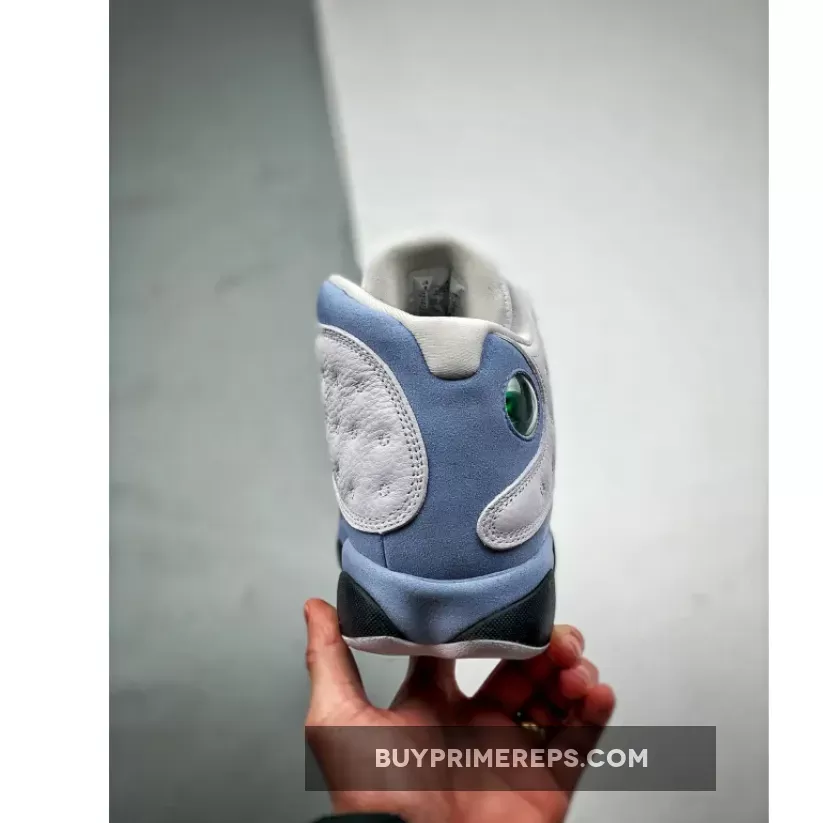 One of the standout features of the Air Jordan 13 is the use of blue grey on the suede mudguards, heels, medial side, and midsole. This cool and muted shade adds depth and contrast to the overall design, creating a visually appealing composition.