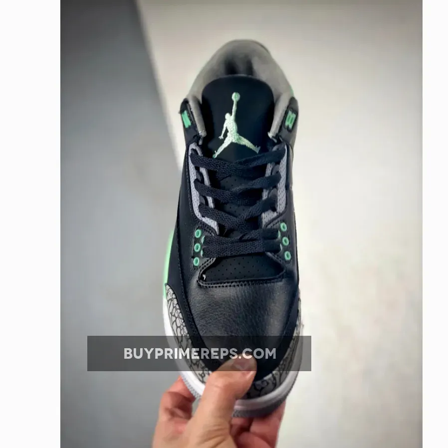 The shoe’s distinctive elephant print overlay, a signature element of the Air Jordan 3, is present on the toe, eyestay, and heels, adding a touch of retro appeal. The combination of black and gray hues, along with the Green Glow accents, creates a visually striking and stylish aesthetic.
