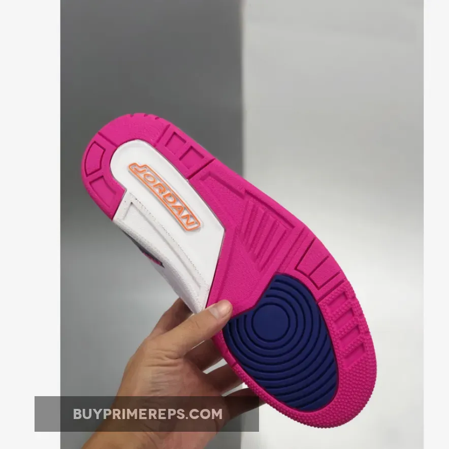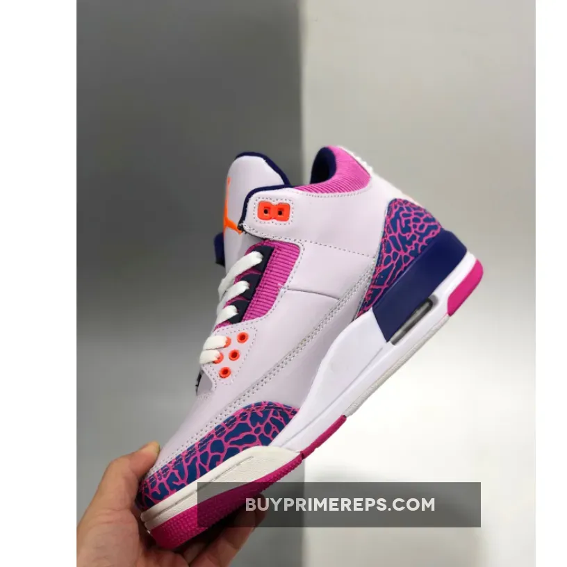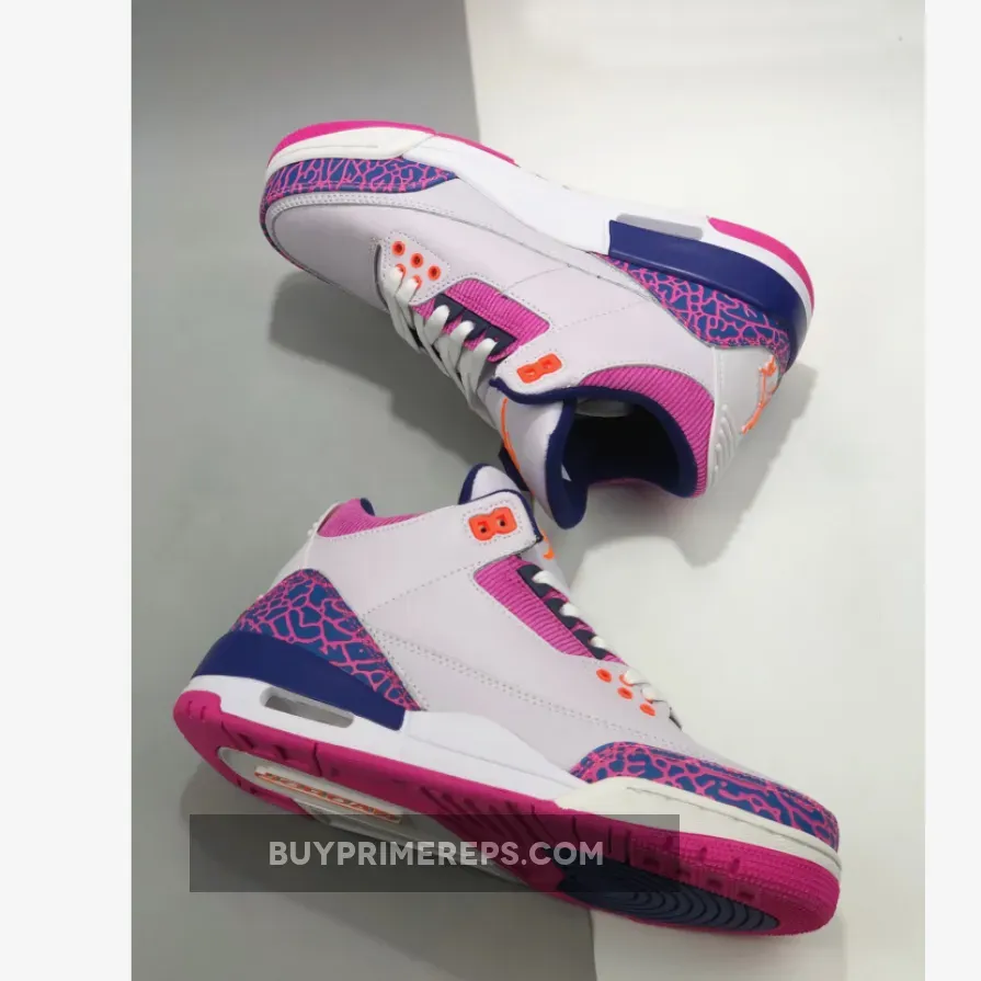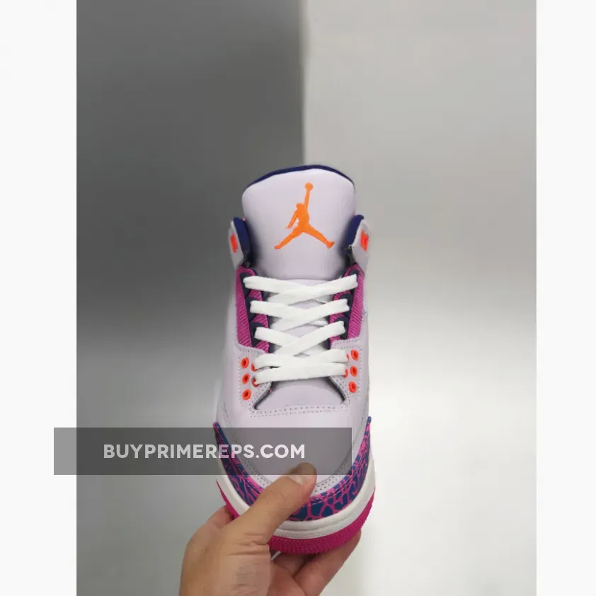 The upper of the shoe is crafted from white leather, providing a clean and classic look. The shoe features the Air Jordan 3’s signature elephant-print overlays, which are presented in a stunning blend of purple and fuchsia. This combination of colors adds a bold and playful touch to the design.