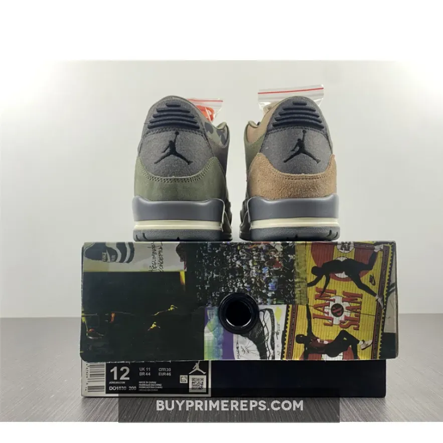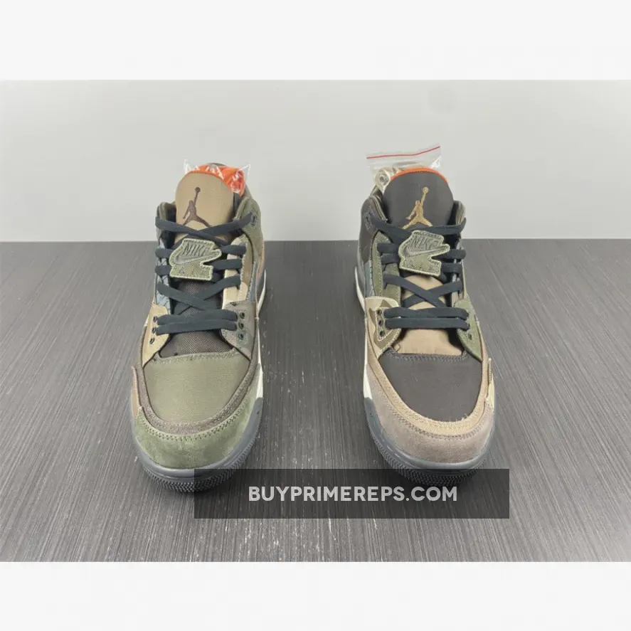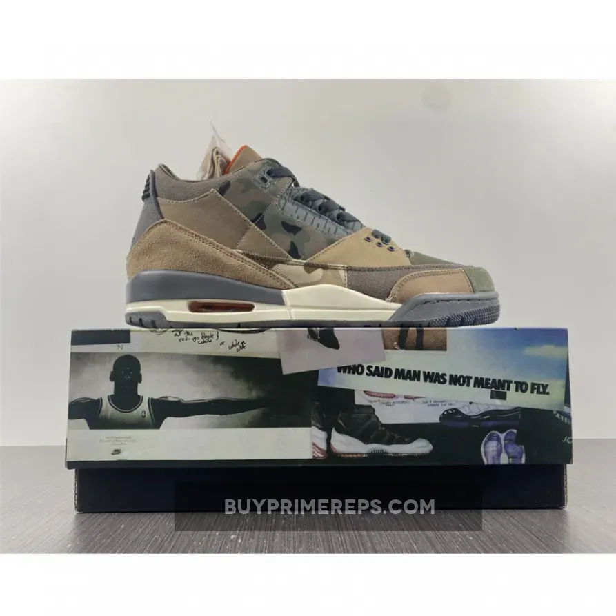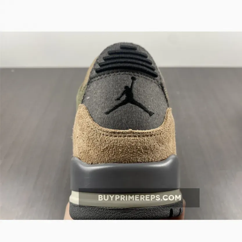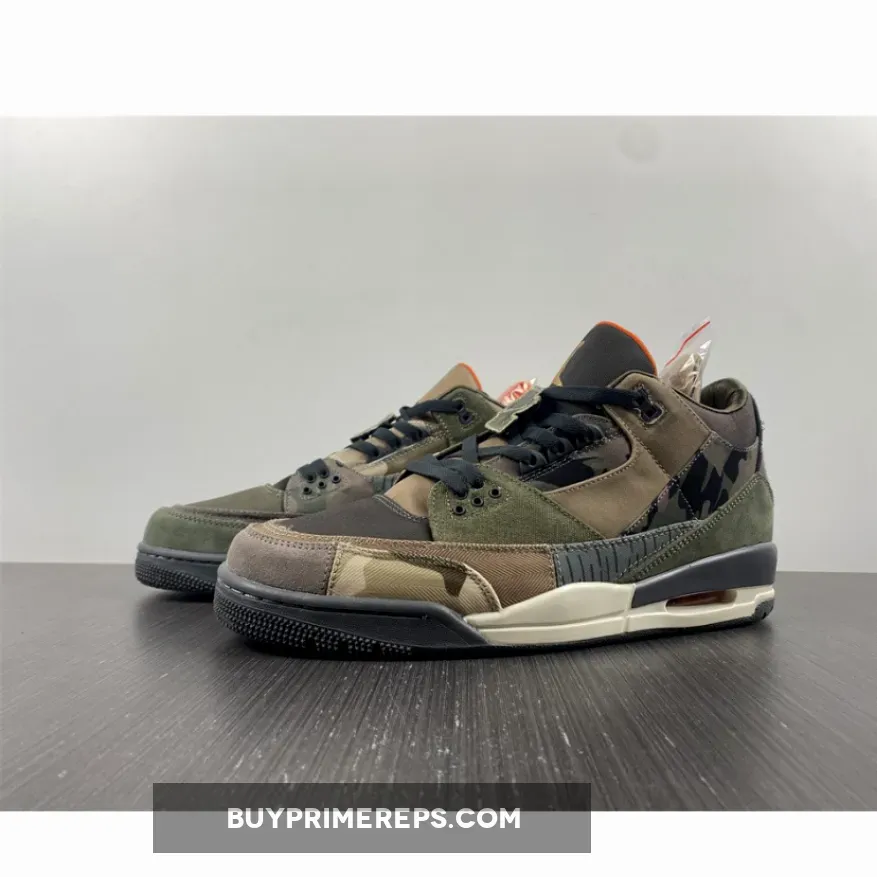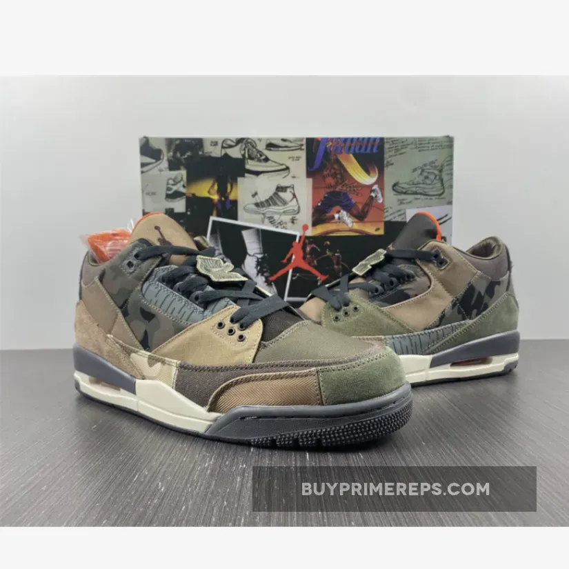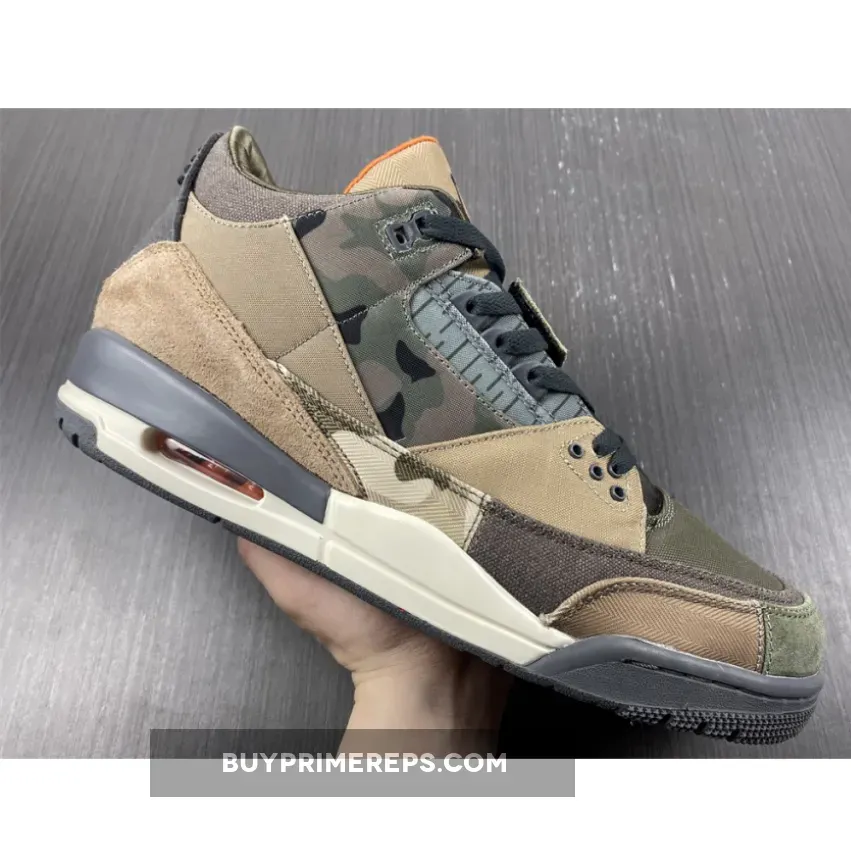 The upper of the Air Jordan 3 Camo Green Brown is constructed using a mix of materials, including genuine nubuck leather, waxed canvas, herringbone, wool, and twill. This combination of textures adds depth and visual interest to the shoe, enhancing its overall aesthetic appeal. The brown hue dominates most of the upper, providing a neutral backdrop for the camo patterns to shine.