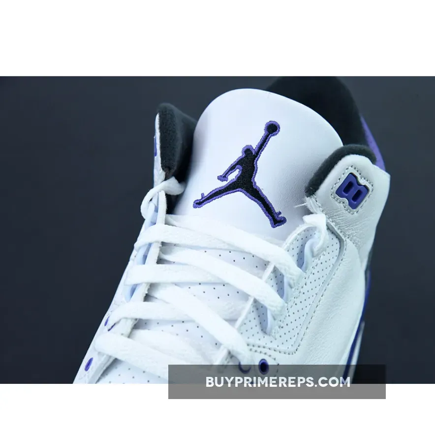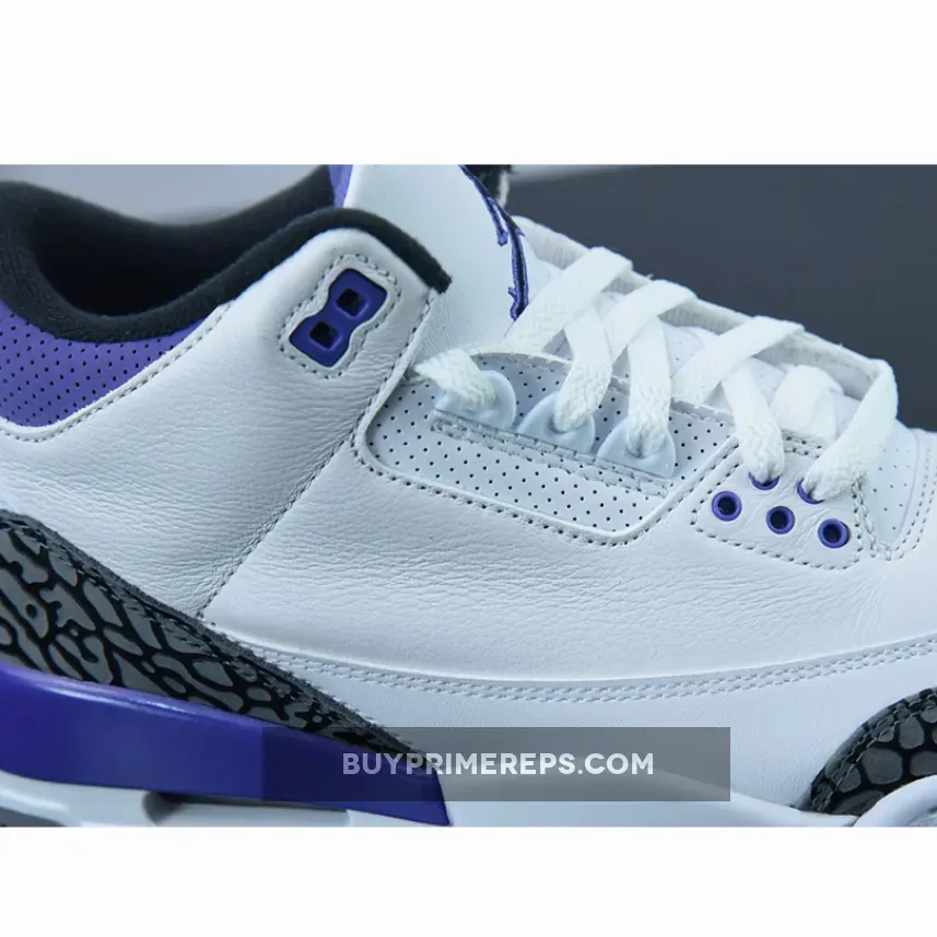 The Air Jordan 3 Dark Iris features a clean white leather base that covers most of the upper, providing a crisp and pristine look. The use of white leather gives the shoe a luxurious feel, while also offering durability and comfort. Complementing this base color are accents of dark iris, a rich and vibrant purple shade that adds a pop of color to the design. The dark iris accents can be seen on the eyelets, collar, and lining around the midsole’s heel area, creating a striking contrast against the white leather.