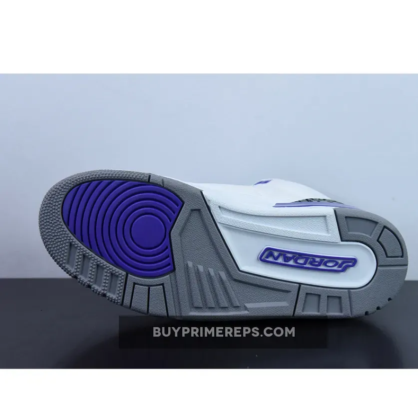 Completing the look of the Air Jordan 3 Dark Iris is a traditional grey rubber outsole, which provides traction and stability. The grey outsole adds a subtle touch of contrast to the design, tying the color palette together and creating a cohesive look.