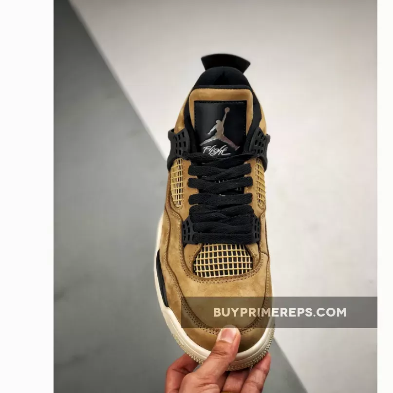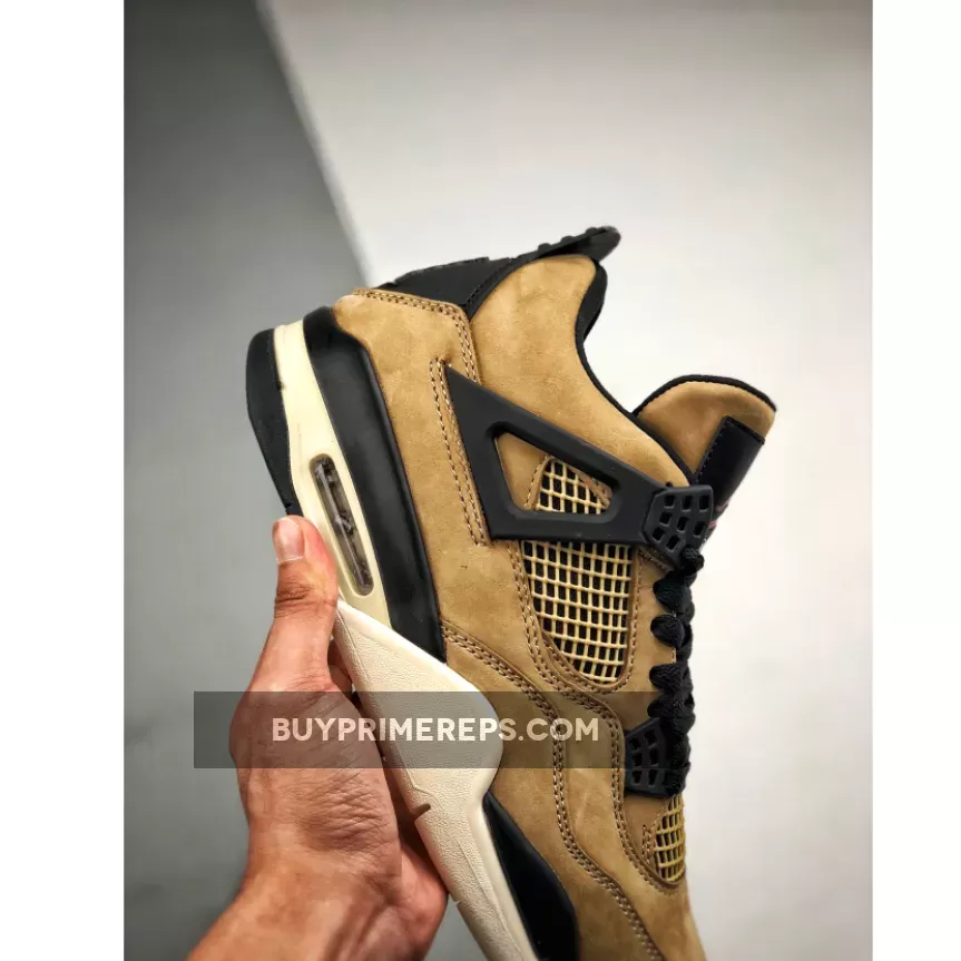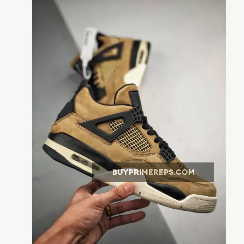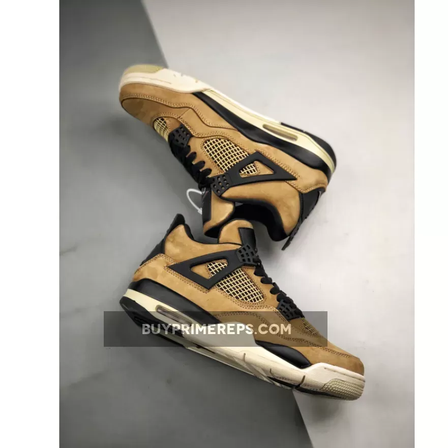 The upper of the Air Jordan 4 ‘Mushroom’ is constructed with a premium Wheat suede material, giving the shoe a luxurious and stylish appearance. The Mushroom colorway resembles a rich wheat tone, adding a touch of warmth to the overall design. Contrasting Black accents can be found on the wings, netting underlay, eyelets, liner, tongue tab, heel tab, and outsole, adding depth and contrast to the shoe’s aesthetic.