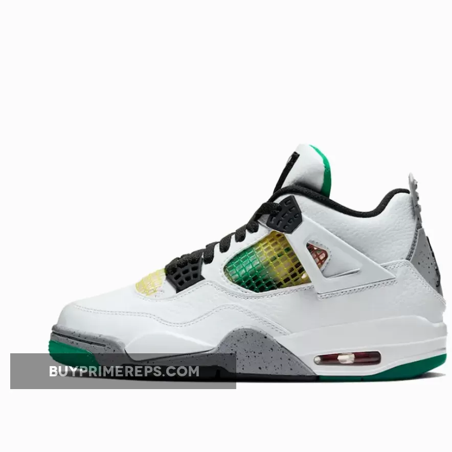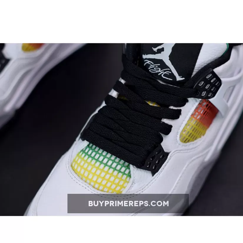 The Air Jordan 4 Rasta features a predominantly white tumbled leather upper, giving it a clean and premium look. The Rasta colors, which include green, yellow, and red, are prominently displayed on the netting of the shoe, adding a bold and vibrant touch to the design. The use of these colors is a nod to the Rasta culture, which originated in Jamaica and is known for its vibrant and expressive style.
