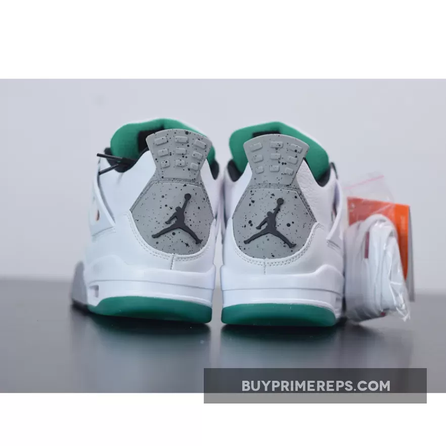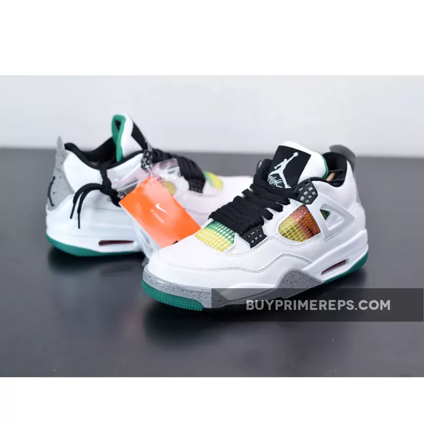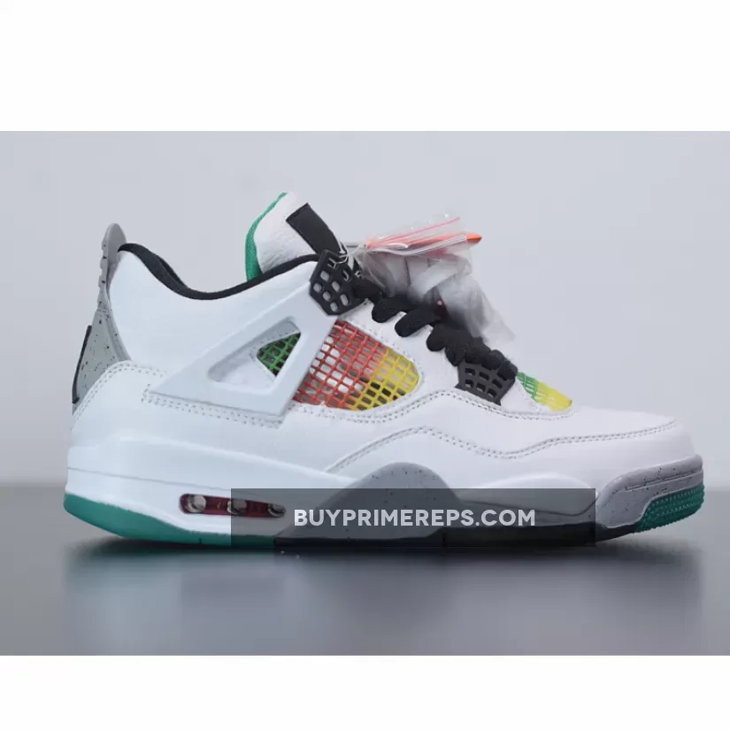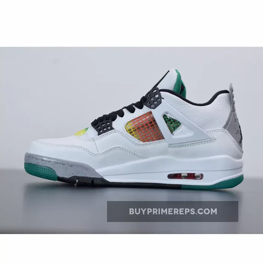 Black detailing is seen throughout the shoe, providing a striking contrast against the white upper. The iconic cement print, a signature feature of the Air Jordan 4, is also present, adding a touch of classic flair to the design. The midsole is speckled with grey, while the outsole features a combination of green and black, completing the Rasta-inspired look.