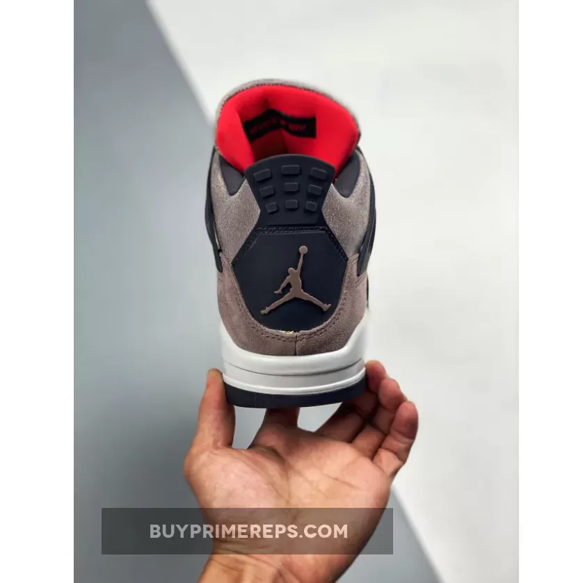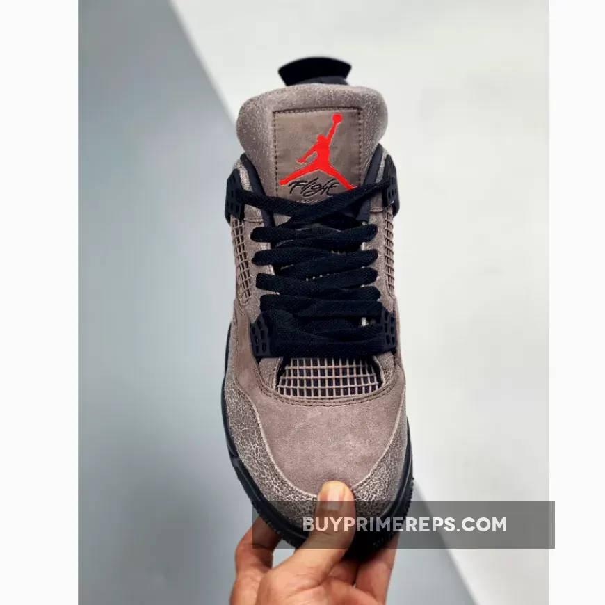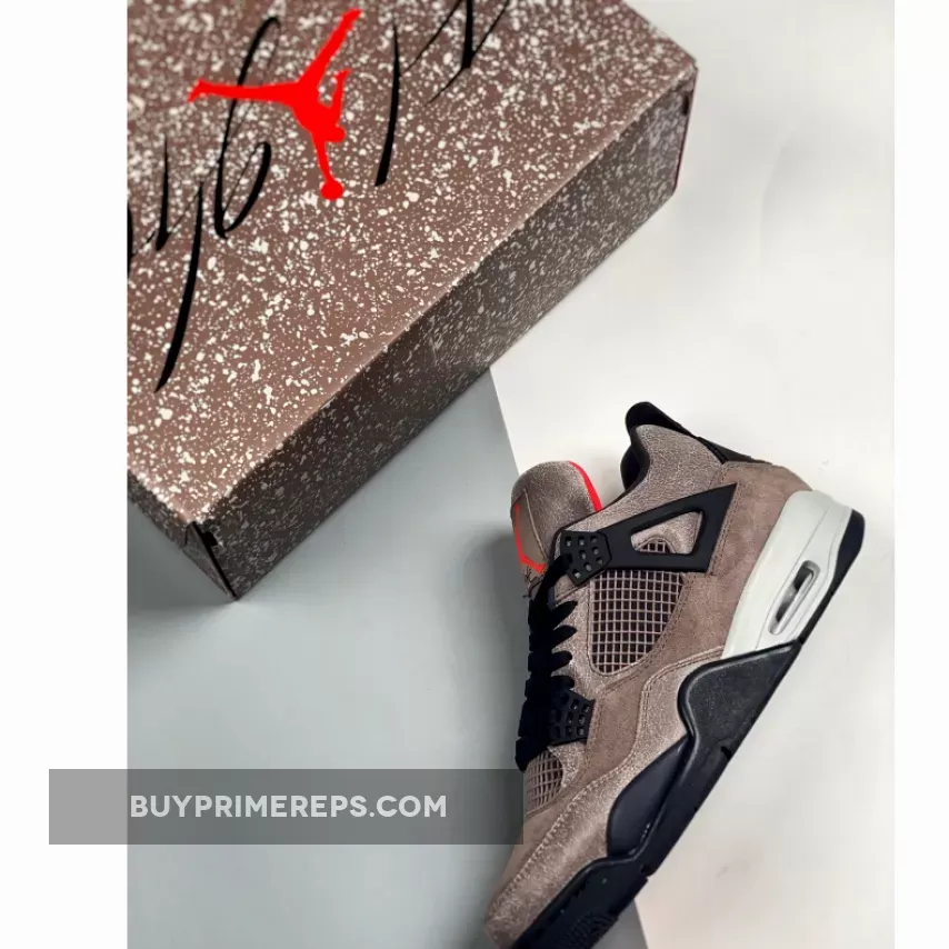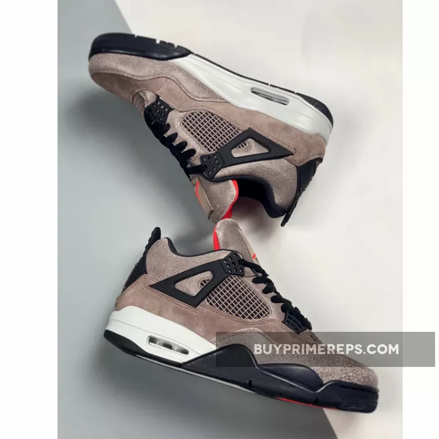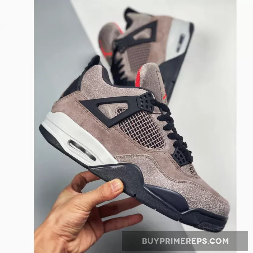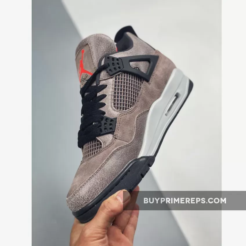 The “Taupe Haze” colorway of the Air Jordan 4 showcases a unique and understated aesthetic. The upper is crafted from a combination of textured suede and cracked leather, giving it a rugged yet sophisticated look. The taupe hue dominates the shoe’s base, covering the side panels, toe box, and heel. It exudes a sense of luxury and elegance, while the cracked leather adds a touch of character and uniqueness.